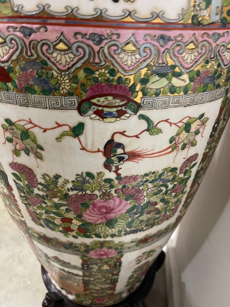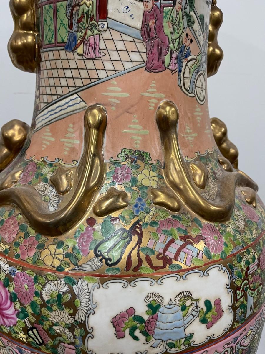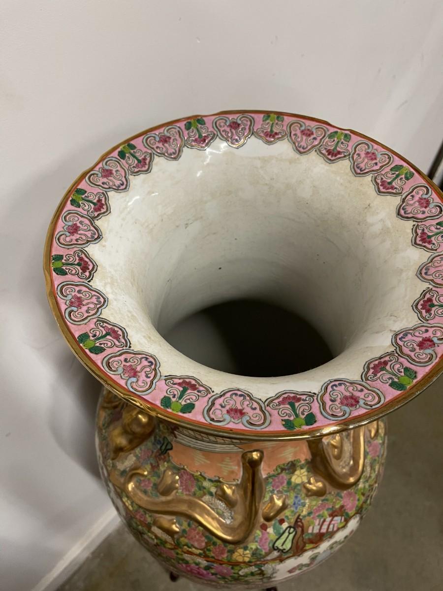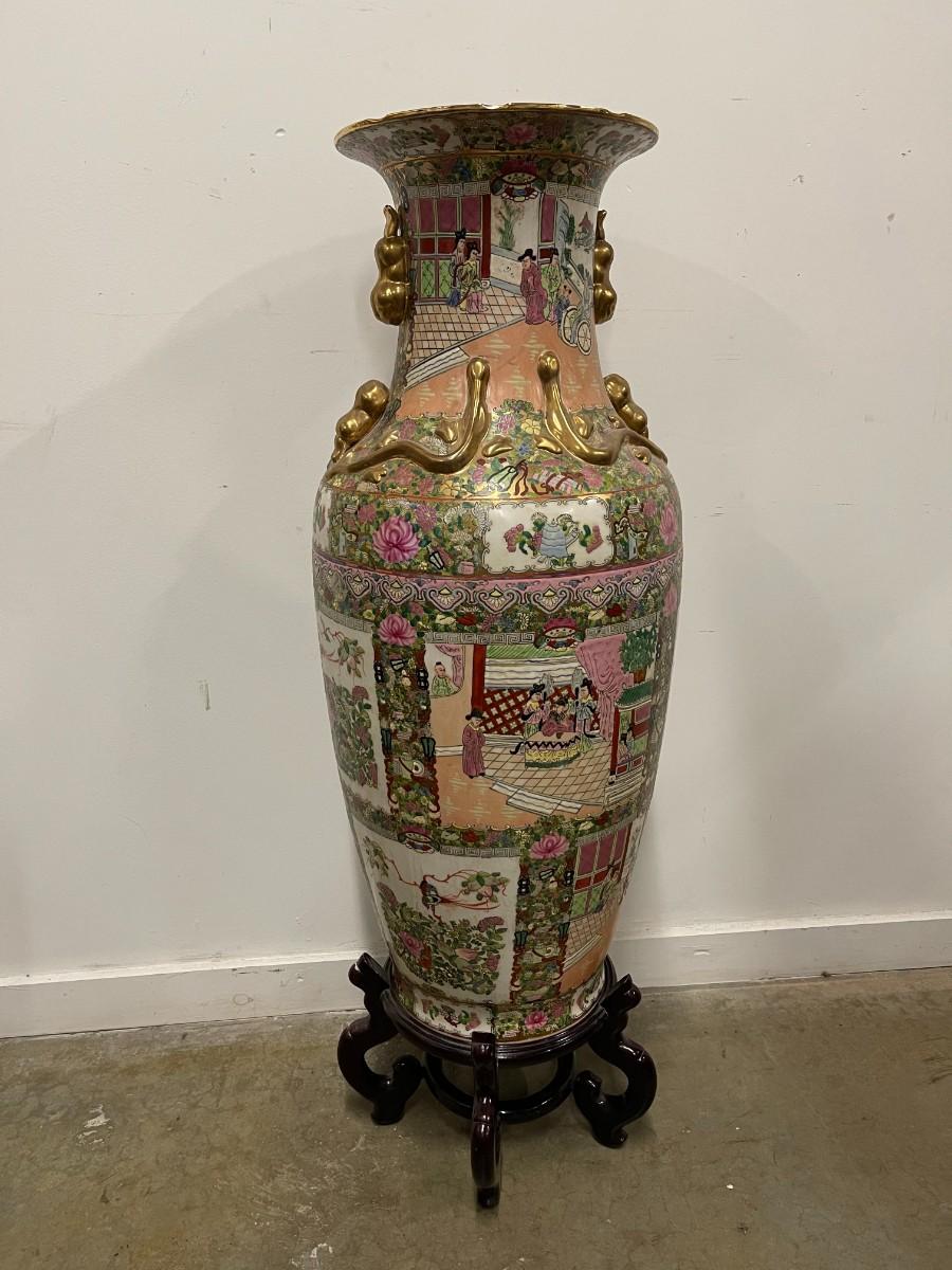 Vintage 20th century Chinese hand painted porcelain vase with gilt handles. 36" high. Very good condition. Includes wood base. #1379