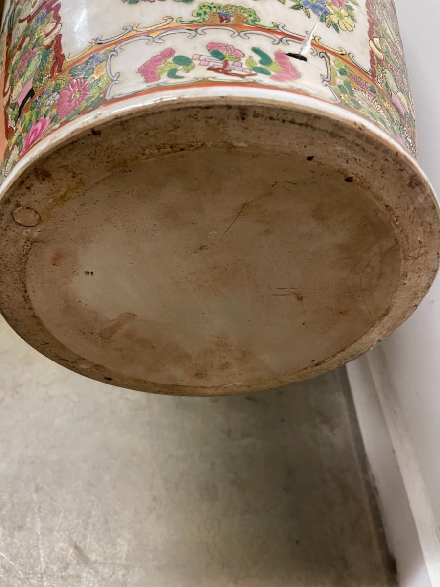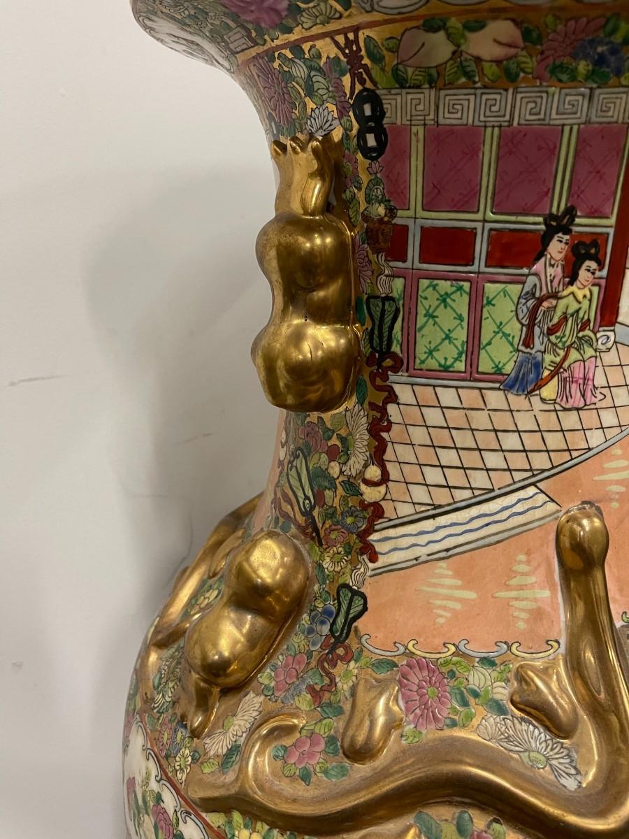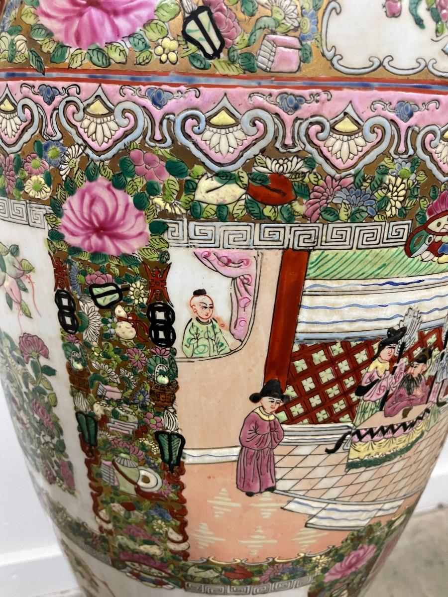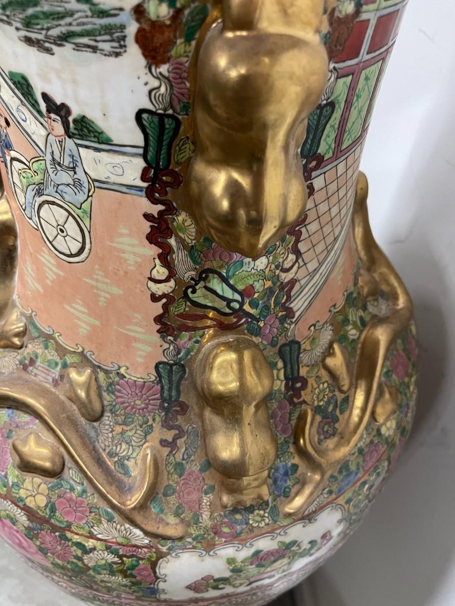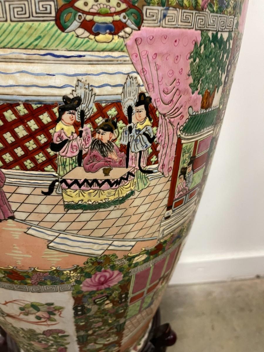 Vintage 20th century Chinese hand painted porcelain vase with gilt handles. 36" high. Very good condition. Includes wood base. #1379