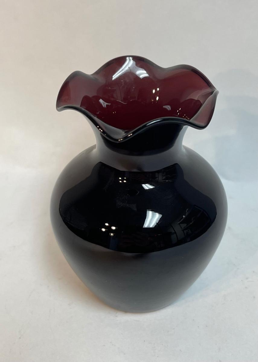 Small Vintage Amethyst Black Glass Bud Flower Vase Ruffled Edge Hand Blown