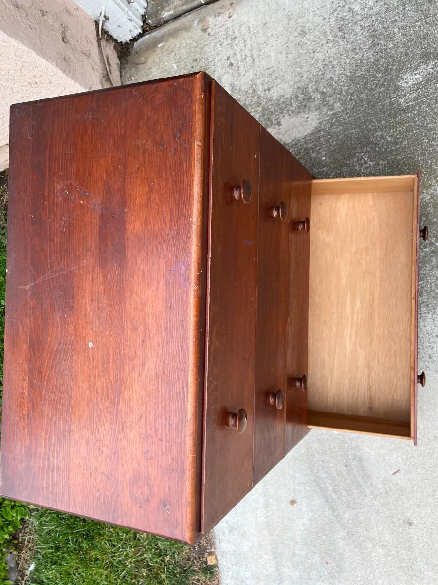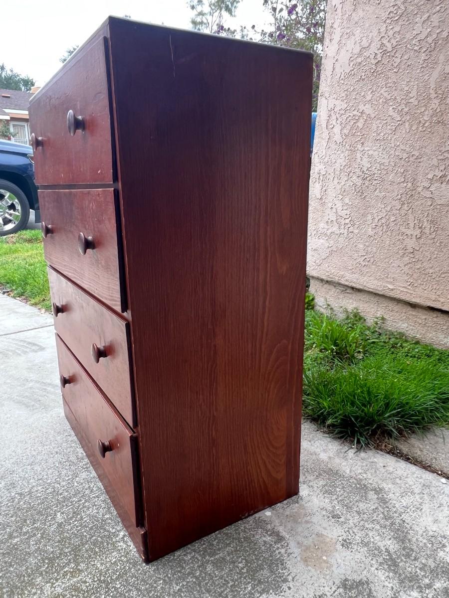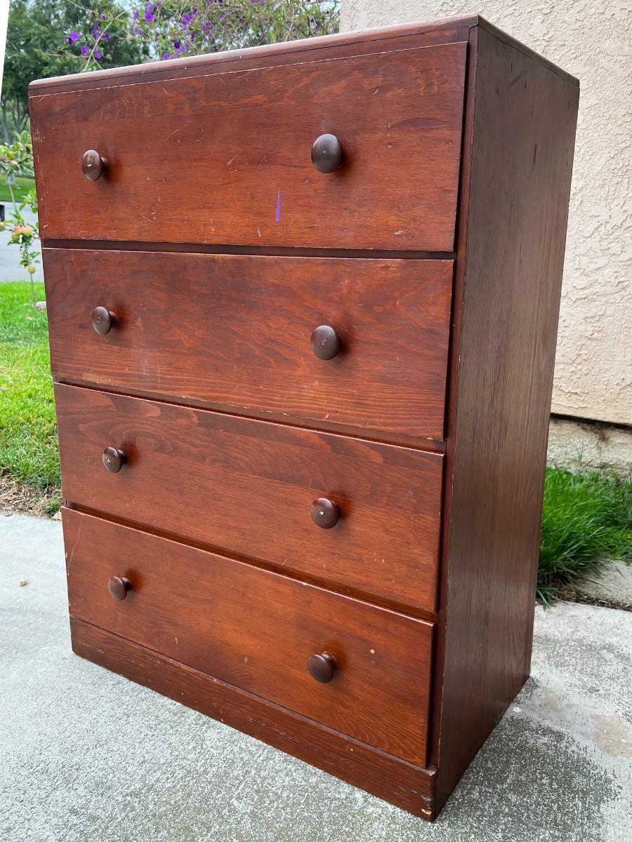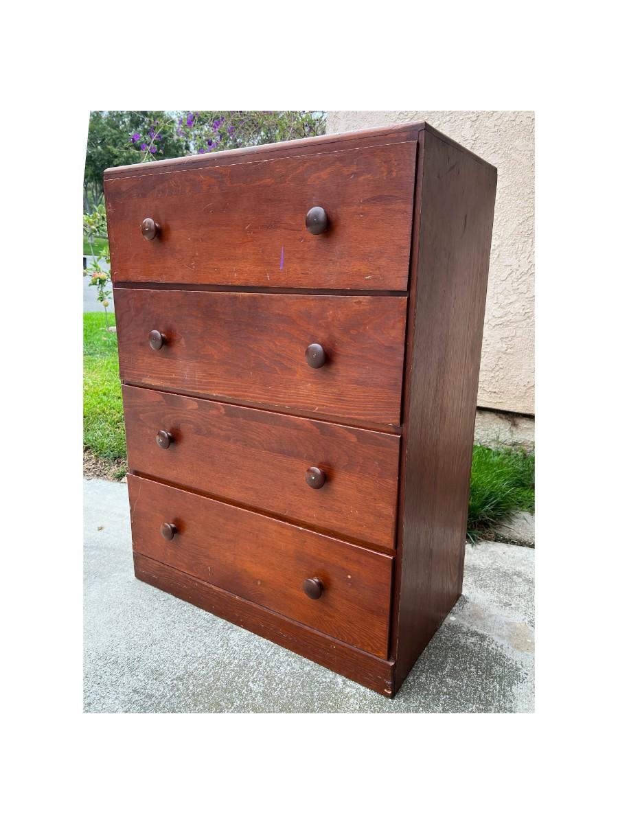 Vintage 4 Drawer Dresser Dark Wood Grain Finish. In good vintage condition, one drawer looks to need the bottom put back into place. ITEM IS CURRENTLY LOCATED IN ORANGE; pickup will be coordinated within two weeks of auction close.
