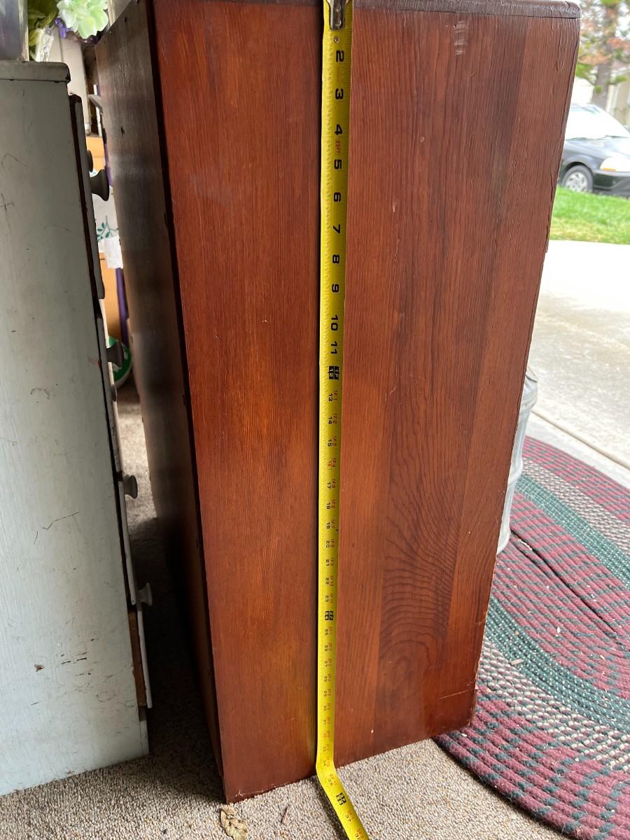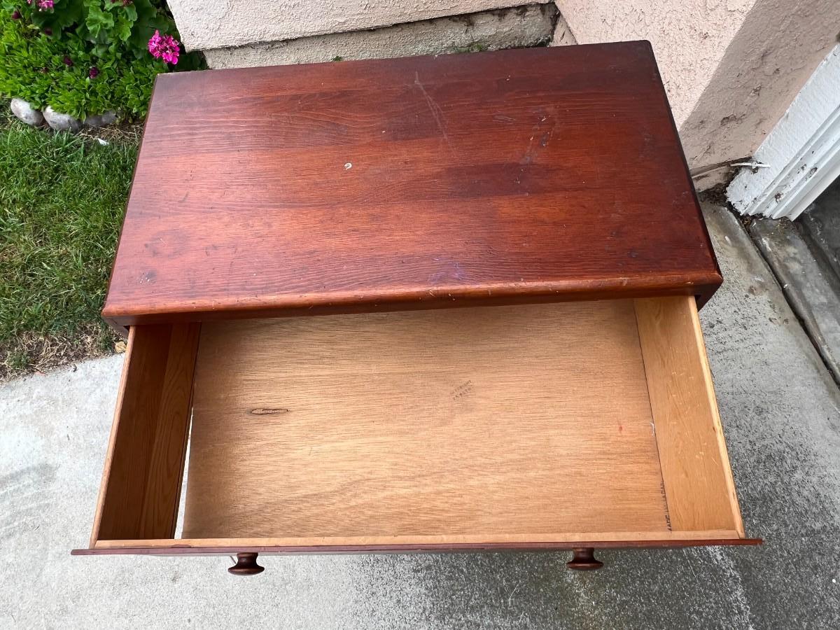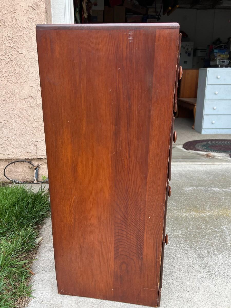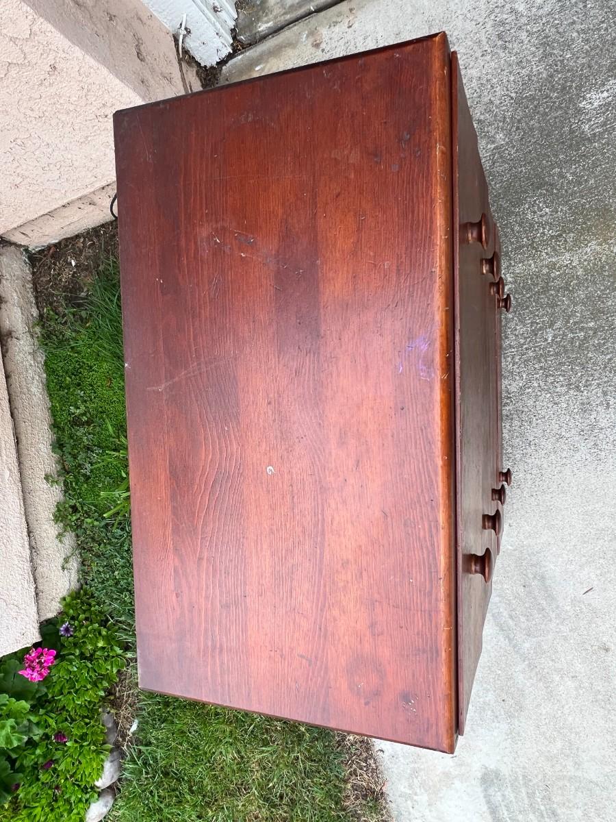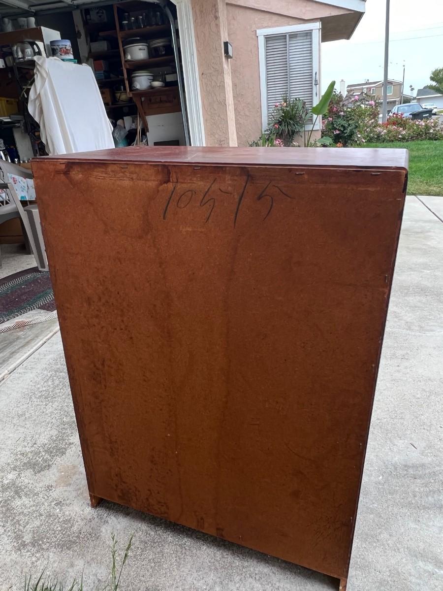 Vintage 4 Drawer Dresser Dark Wood Grain Finish. In good vintage condition, one drawer looks to need the bottom put back into place. ITEM IS CURRENTLY LOCATED IN ORANGE; pickup will be coordinated within two weeks of auction close.