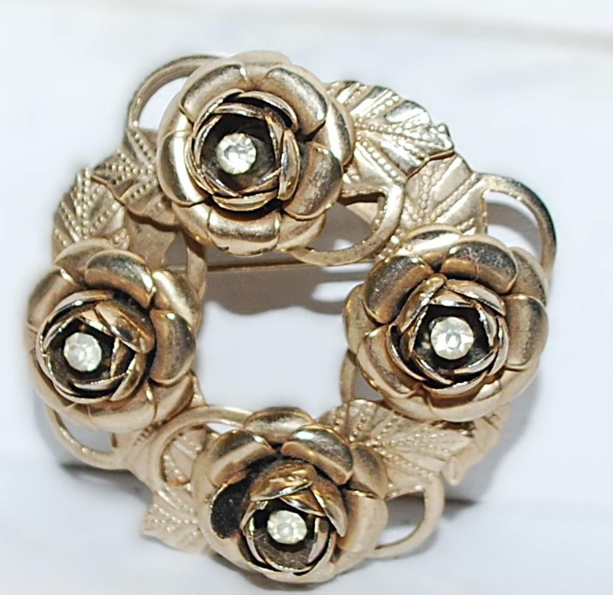 VINTAGE "4 Flowers & 4 Stones" BROOCH (1¾" Diam.) on a Brass Gold Tone Setting