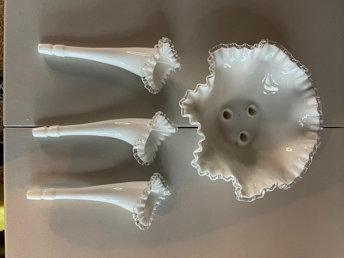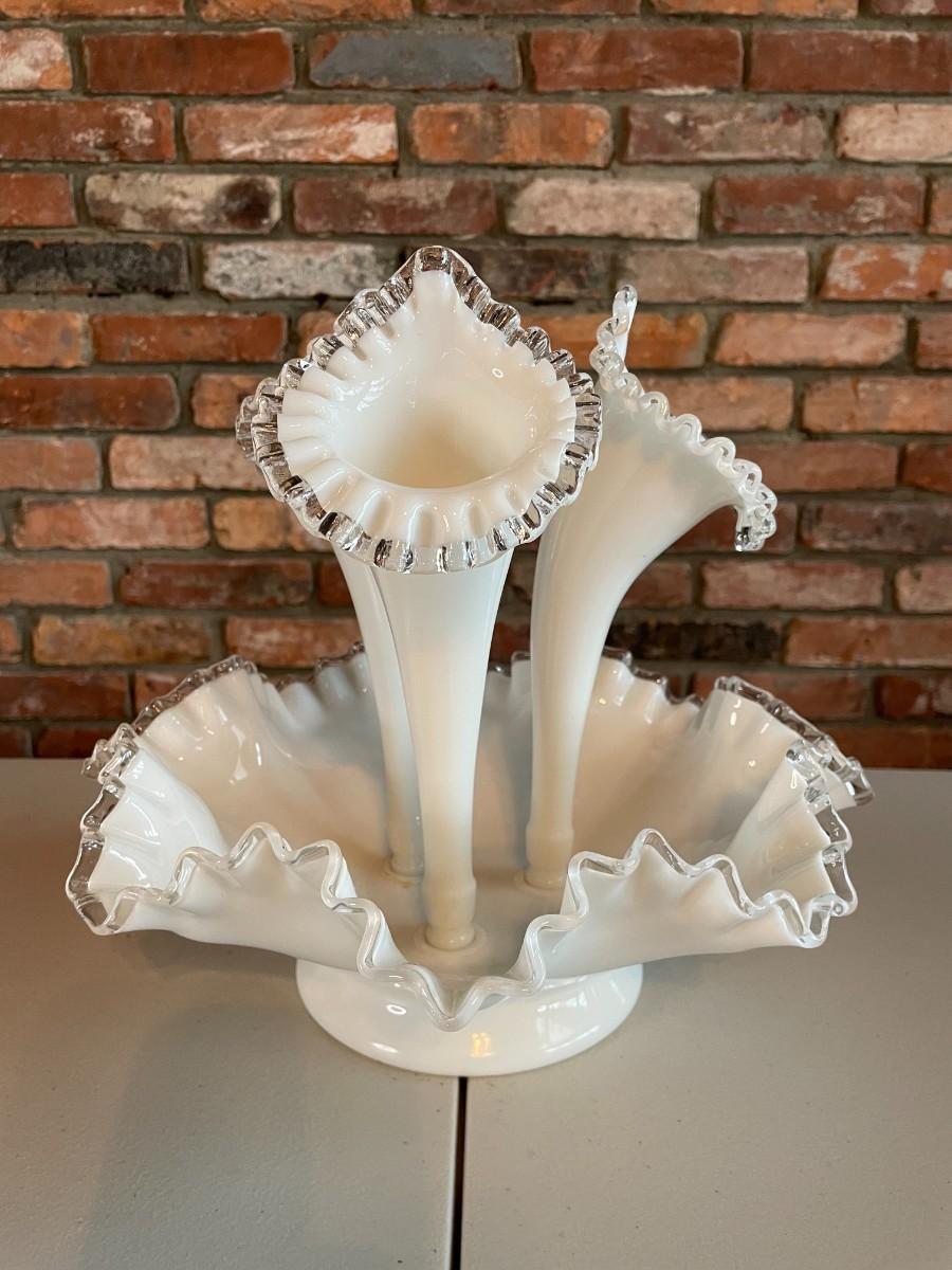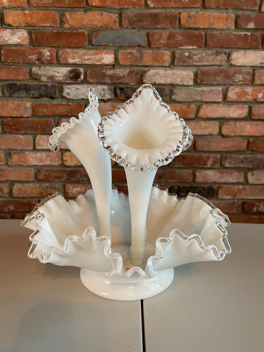 Vintage 4 Piece Fenton White Silver Crest Epergne 3 Horn