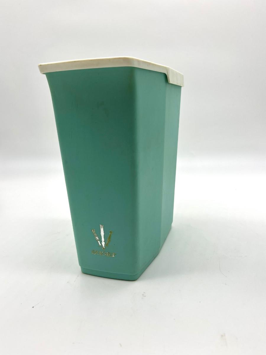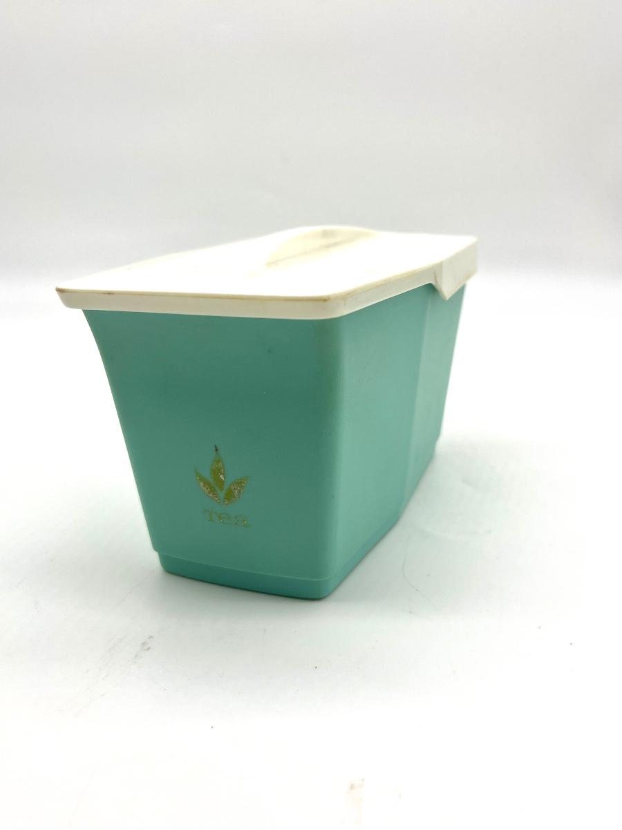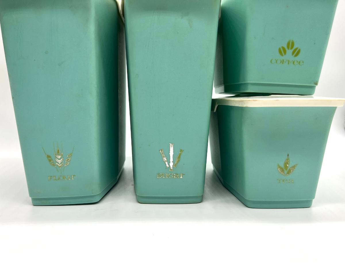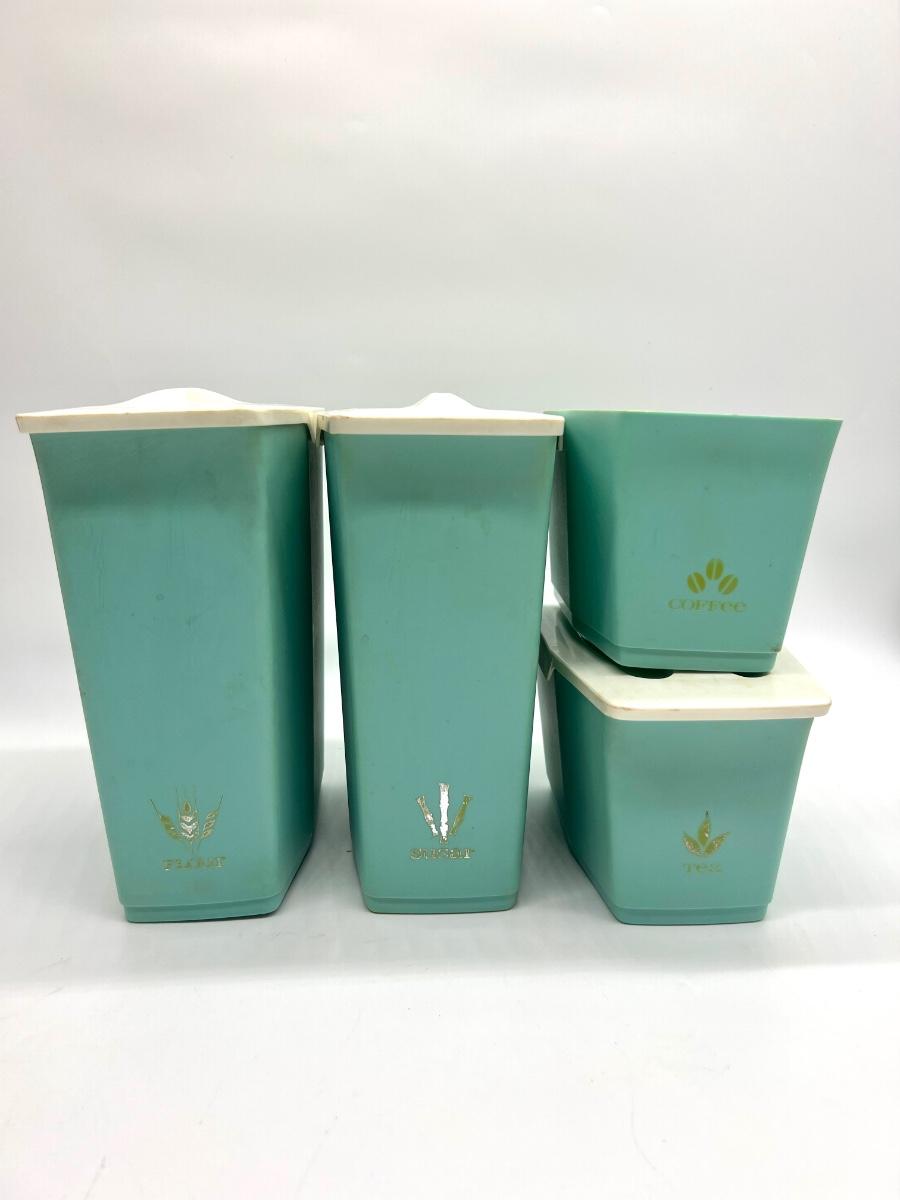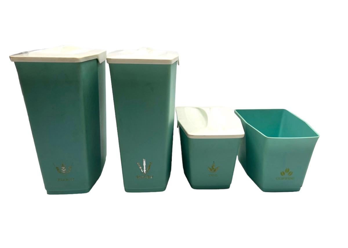Vintage 4 piece storage containers flour, sugar, tea and Coffee.. They do show signs of wear/use and have 3 lids. Still a cool find. See pictures for condition.