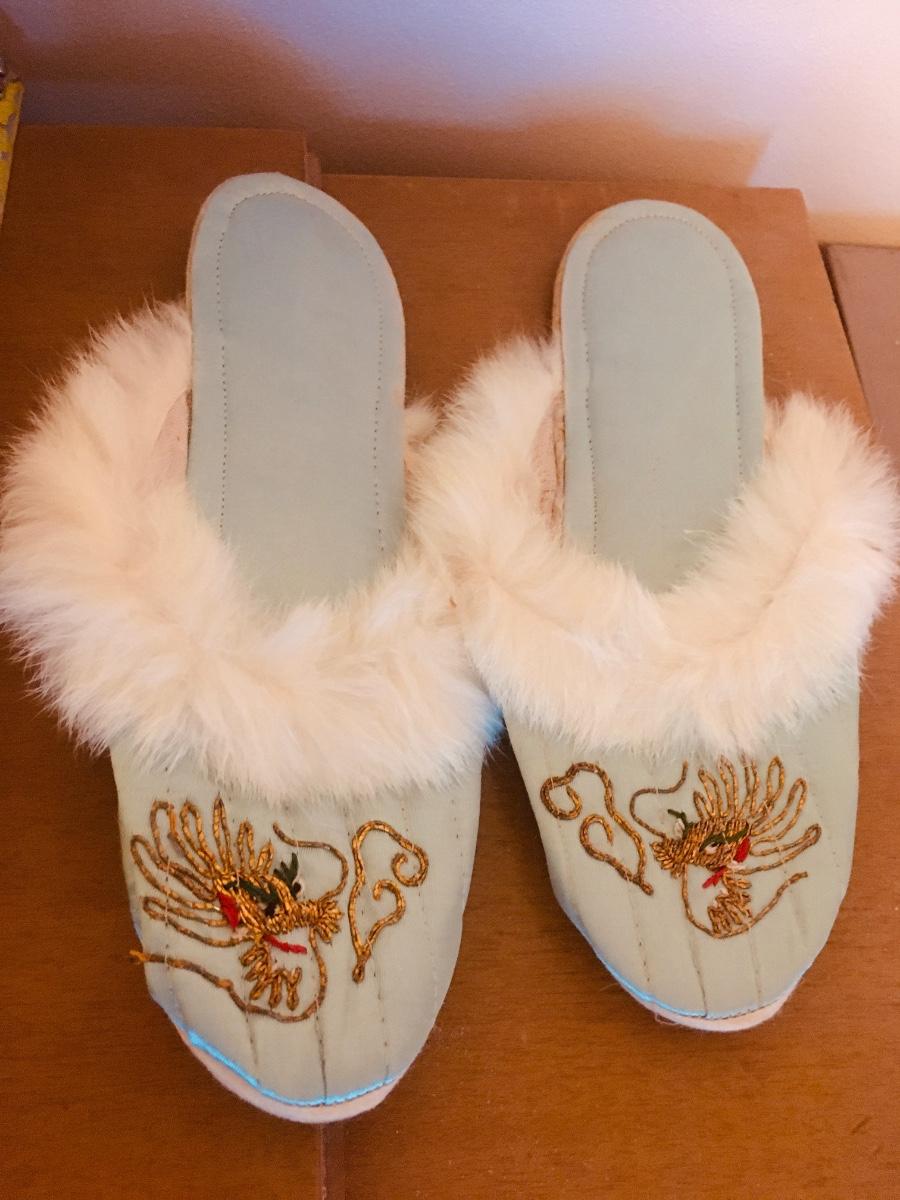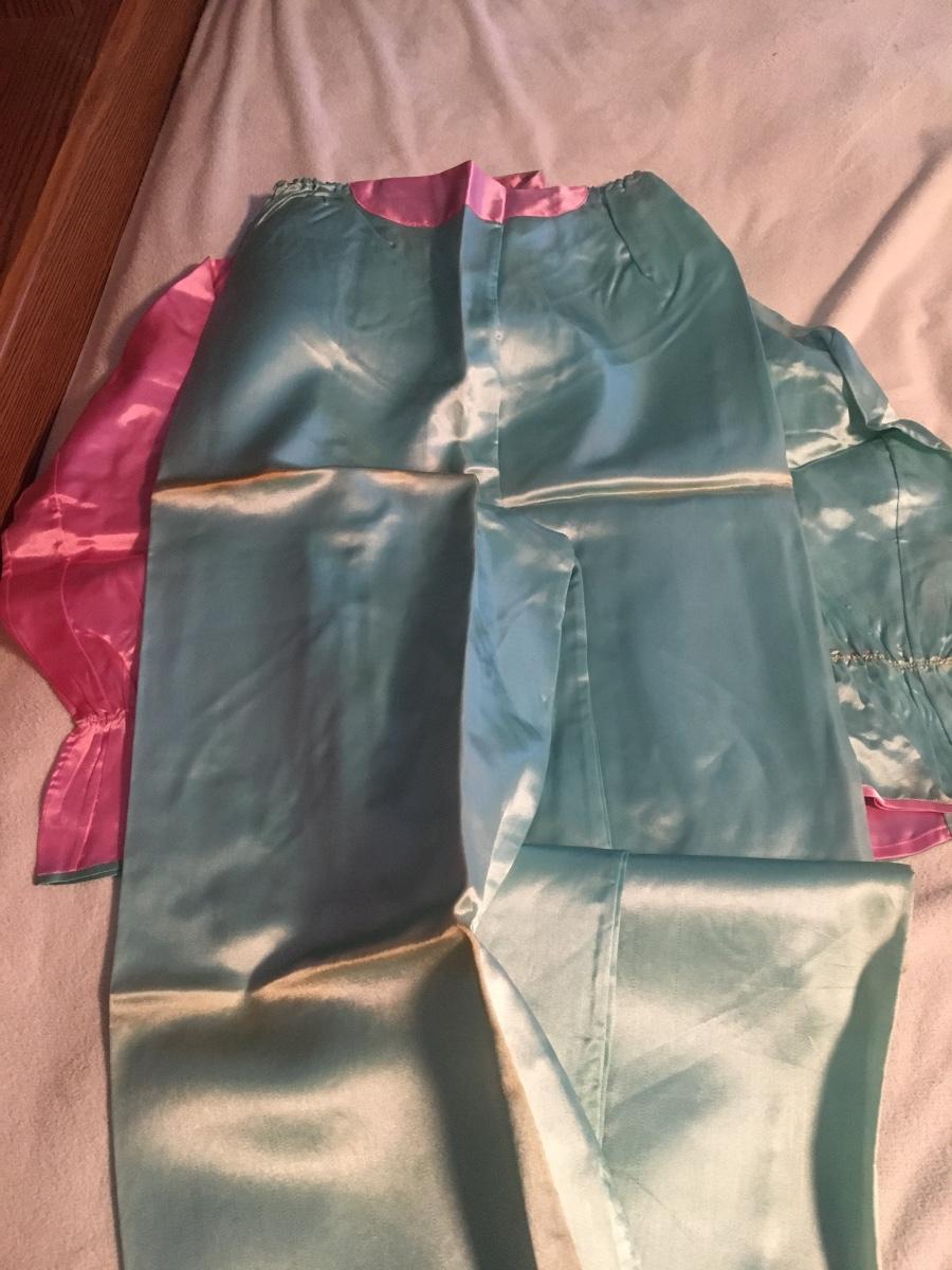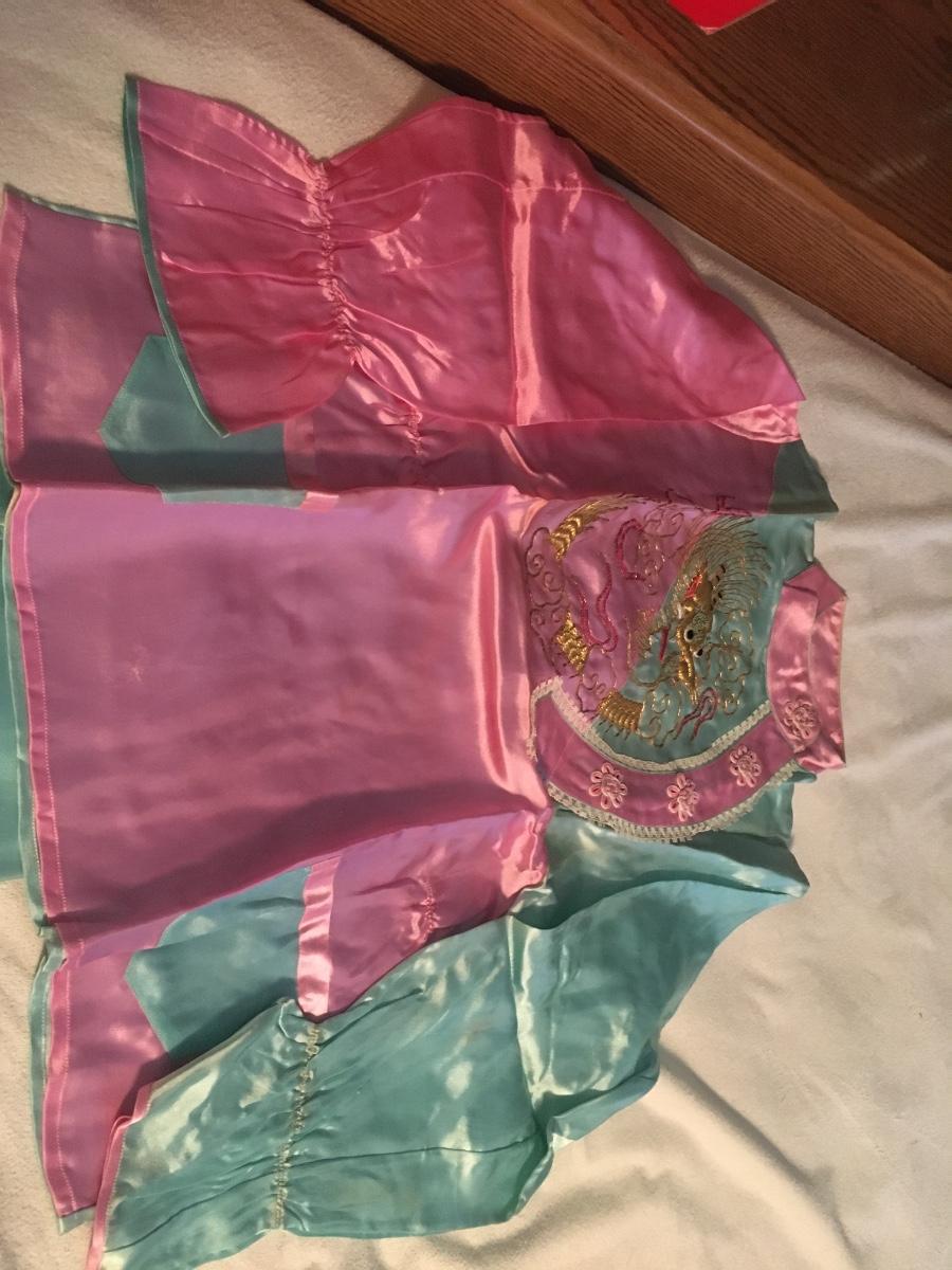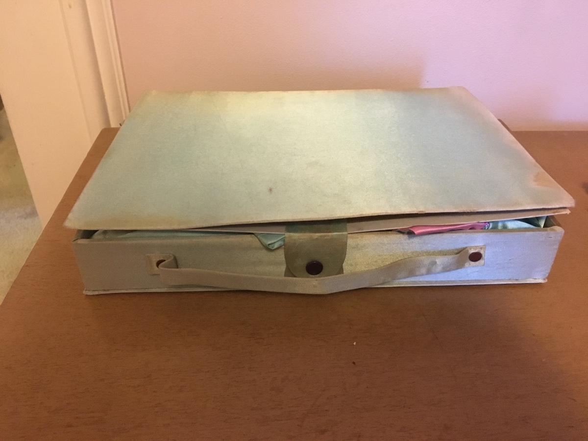 Never worn pj set with slippers and kimono that comes in cloth covered suitcase. Has not been used, but seams have aging that might be able to be laundered. Could have been gift to a new mom. Original gift card. So sweet!