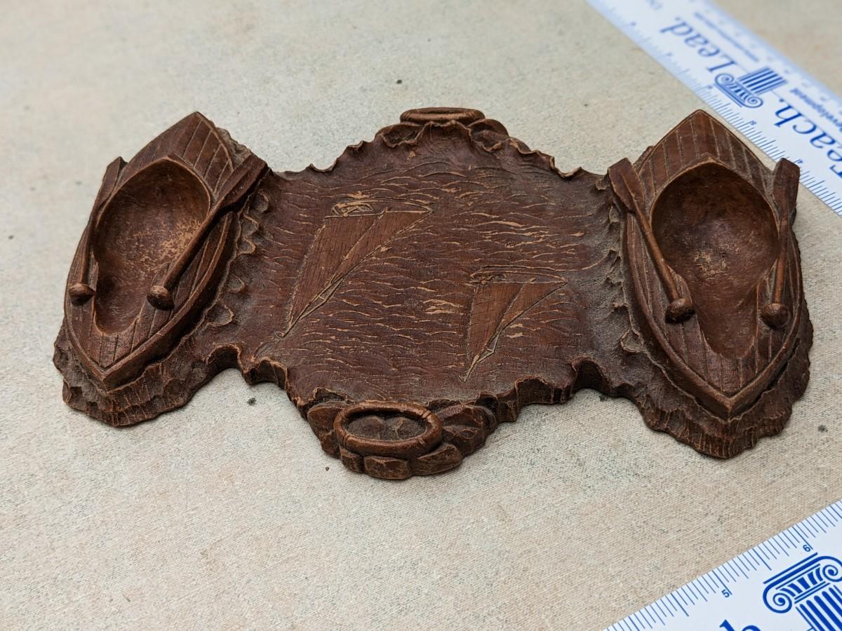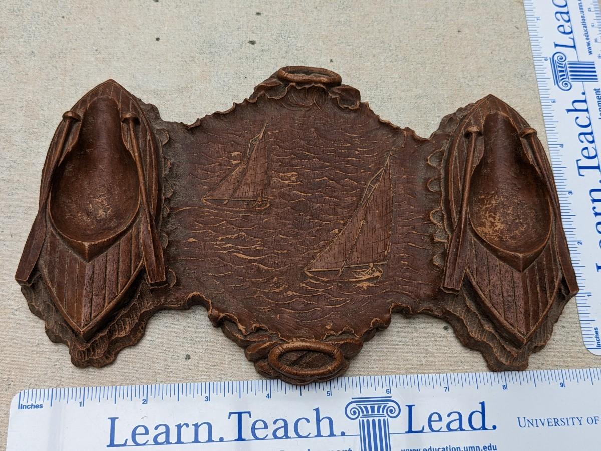 The pressed wood holder has a gorgeous patina and age. It features two pipe holders with a center "plate" divider. The pipe holders are shaped as row boats with etchings of the sailboats on the center plate.
