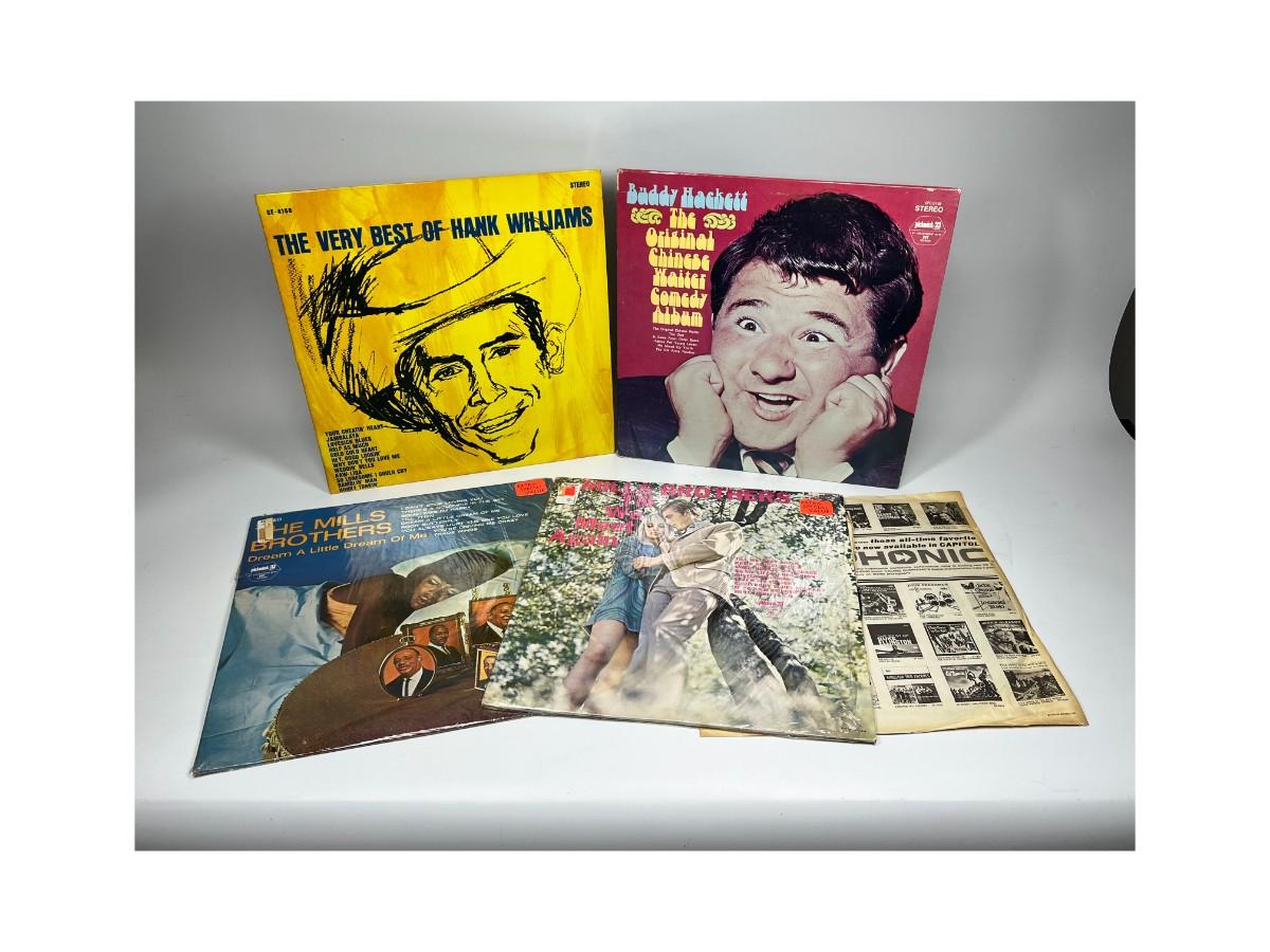 Vintage 5 album lot. Includes Hank Williams, Buddy Hackett, and The Mills Brothers. Untested.