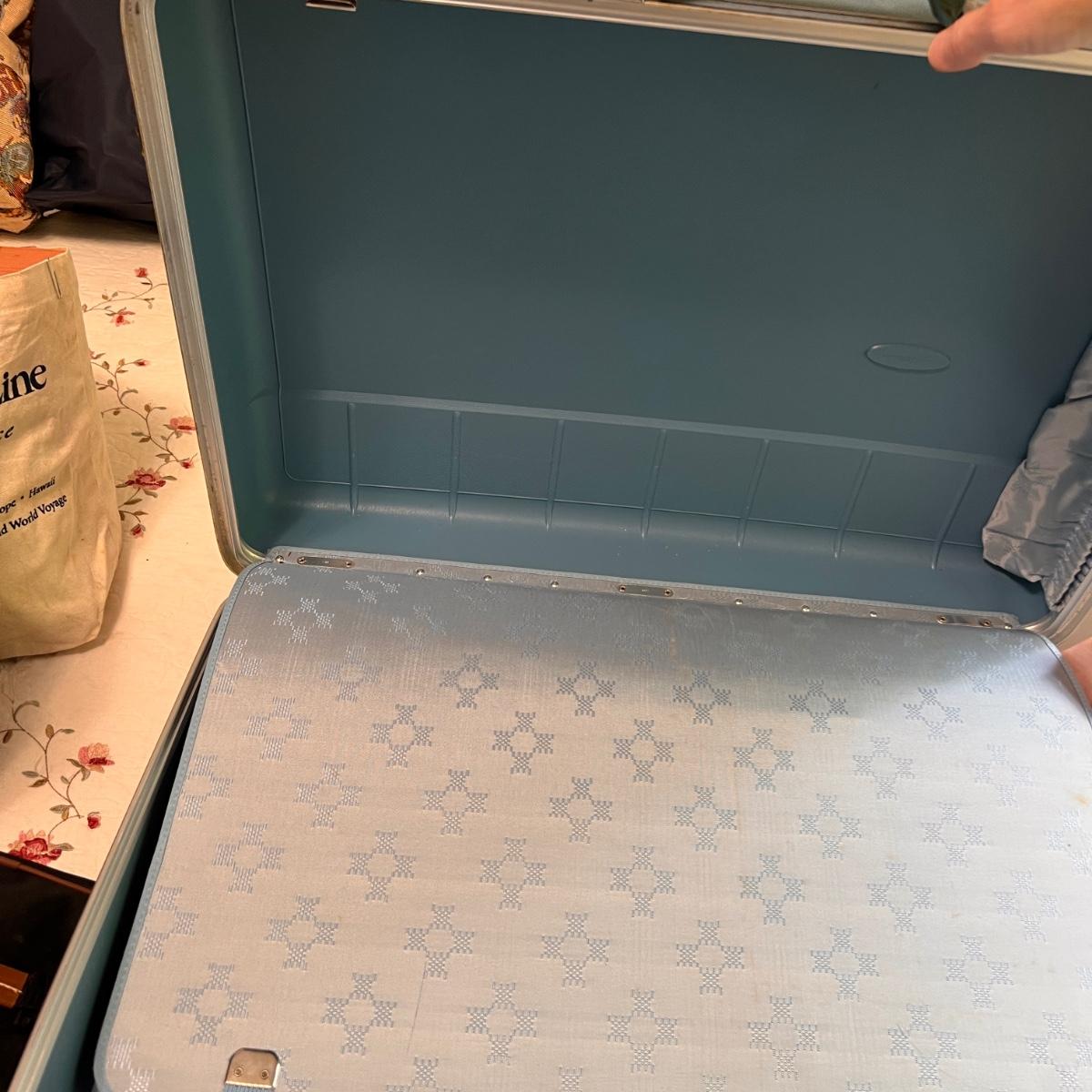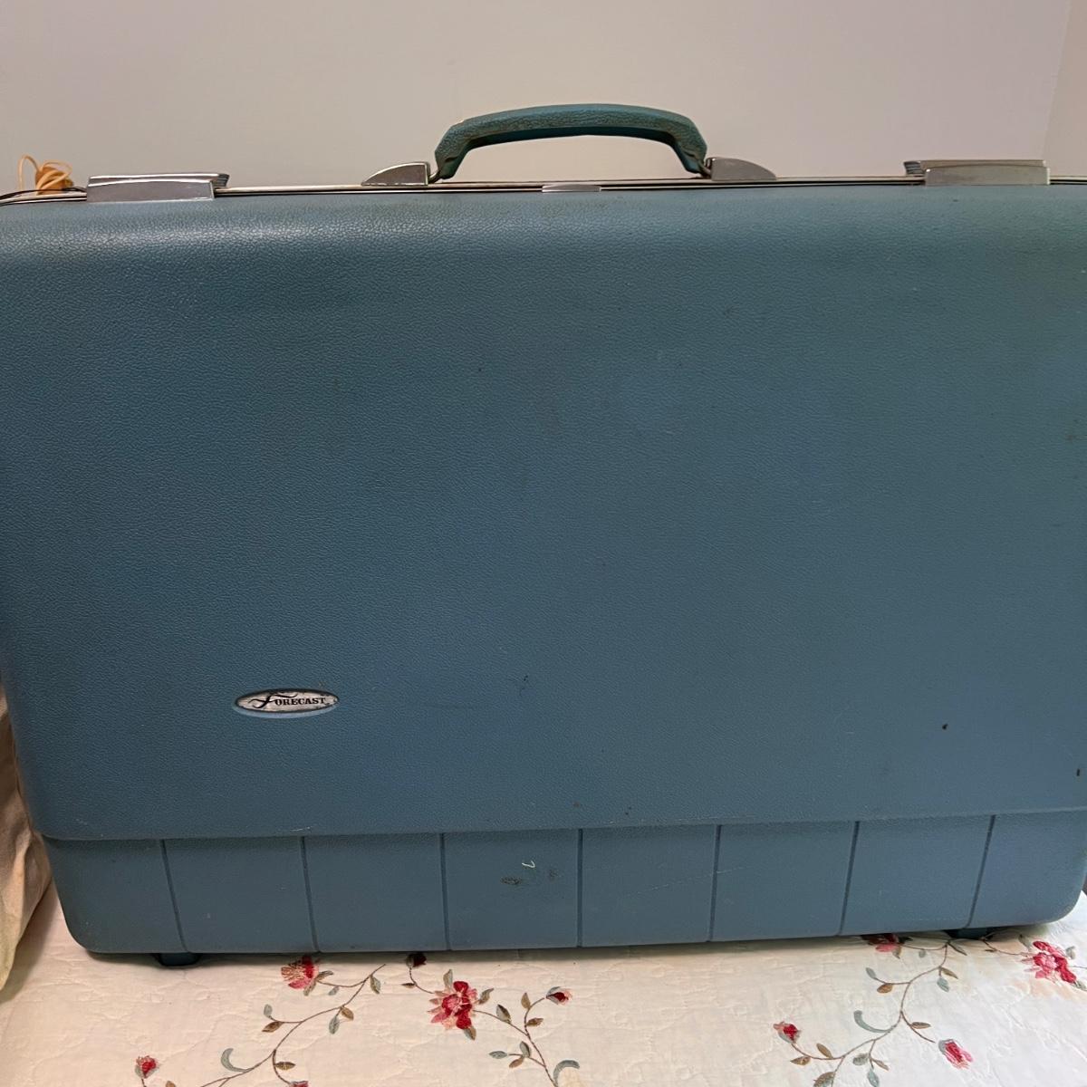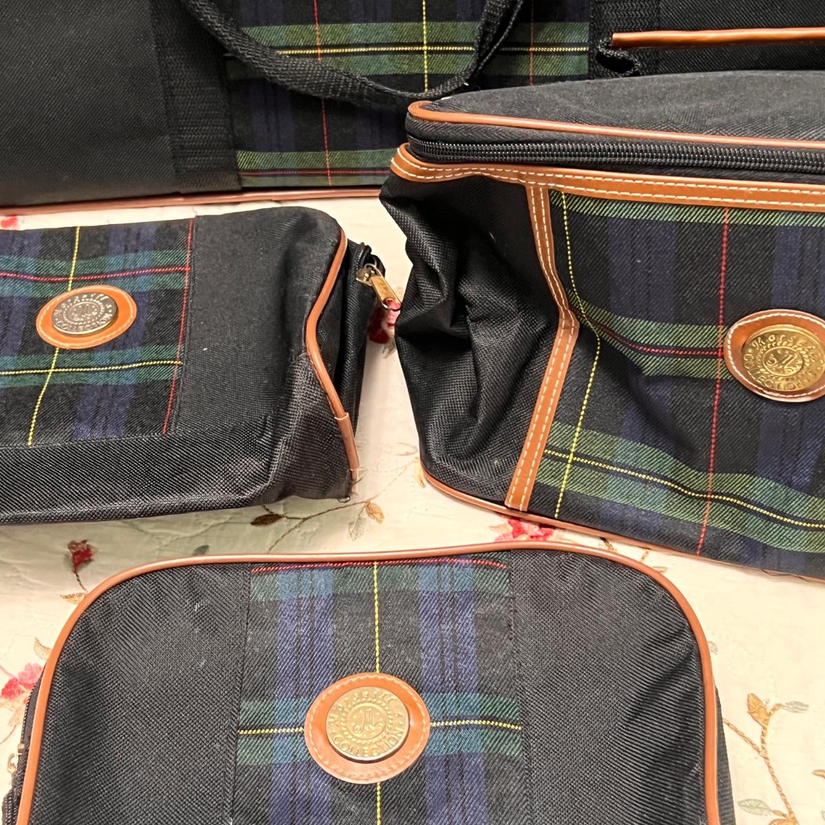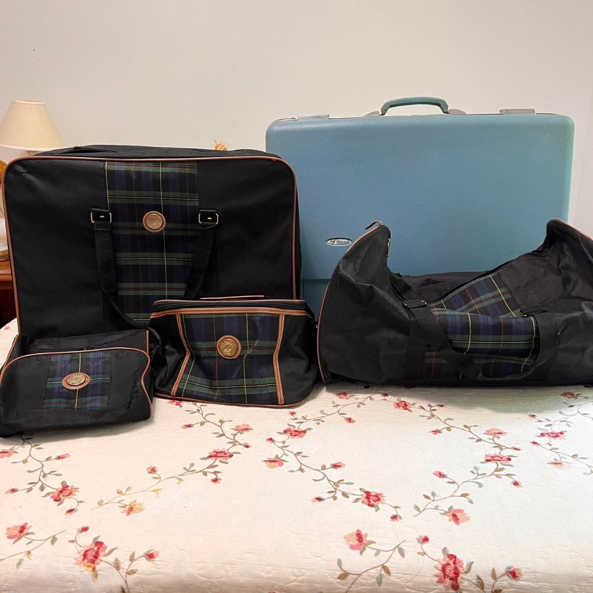 Vintage Morseill Collection 5 piece tartan canvas luggage suitcase travel set. Comes with one suitcase, 1 duffle bag, 1 train case, 2 toiletry bags. In good condition. Plus 1 light blue hard suitcase by Forecaster. Inside is pristine. Outside needs cleaning.