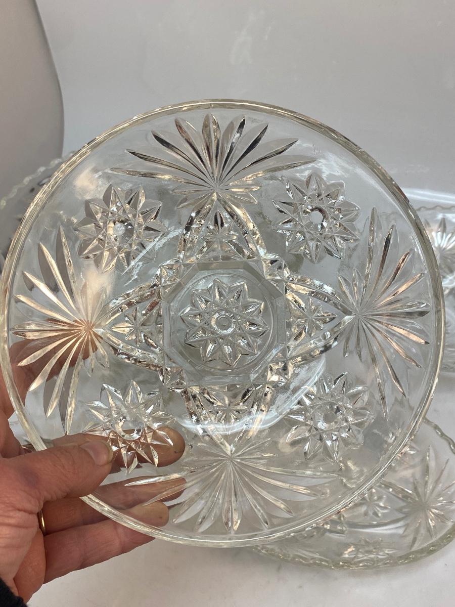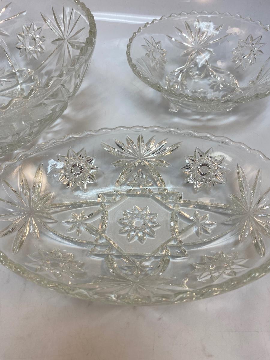 Vintage 5 Piece Set of Pressed Glass Serving Bowls Dishes Same Pattern. Different shape and size dishes all in the same pattern. Good condition, no chips no noticed. See photos.