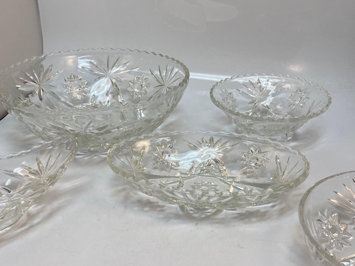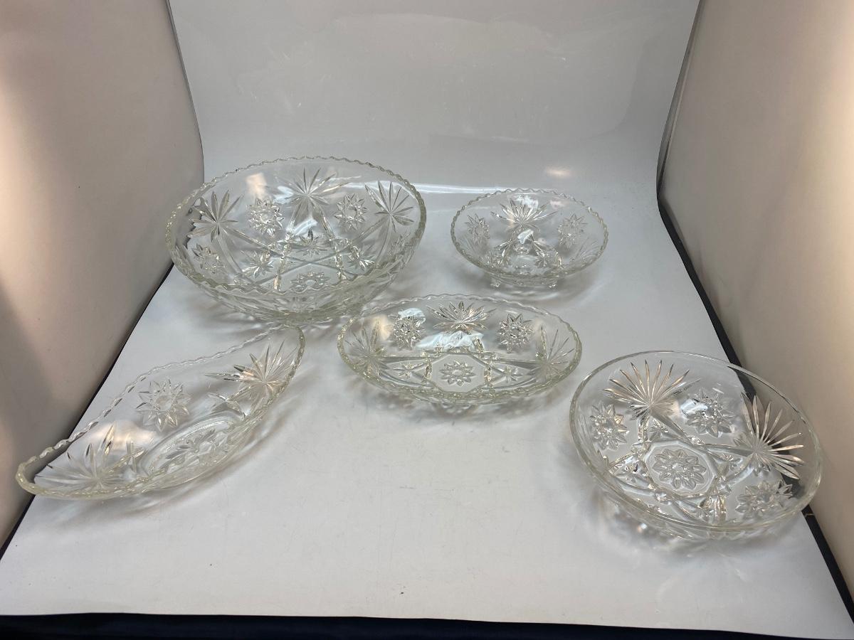Vintage 5 Piece Set of Pressed Glass Serving Bowls Dishes Same Pattern