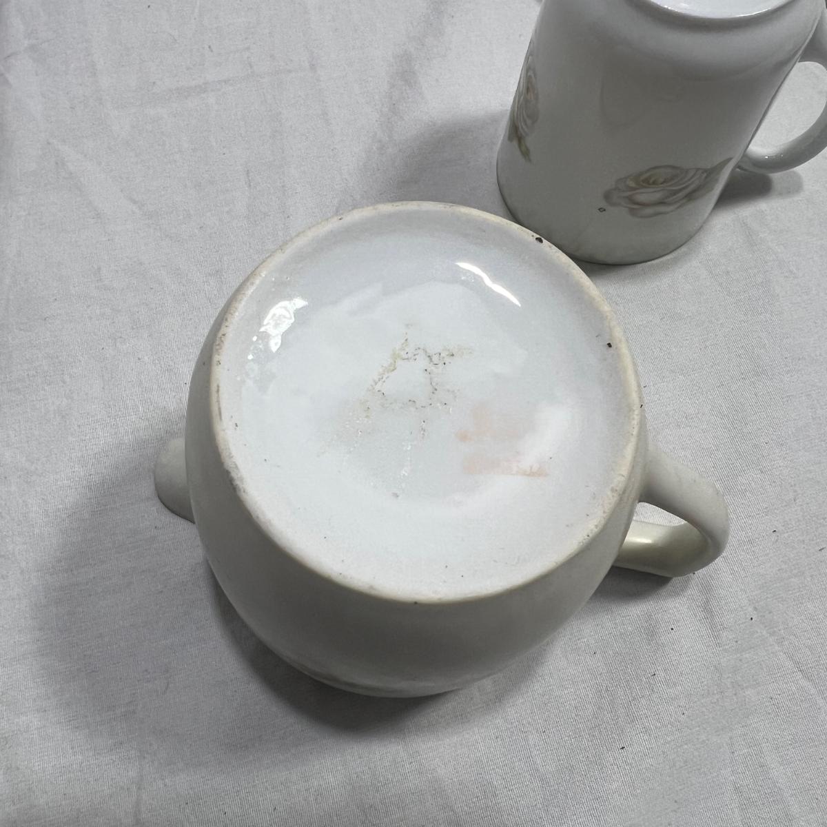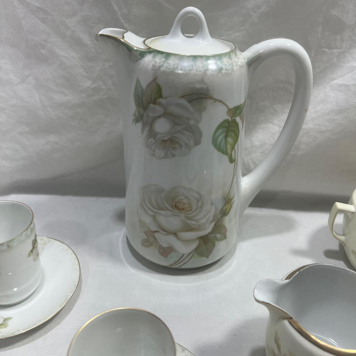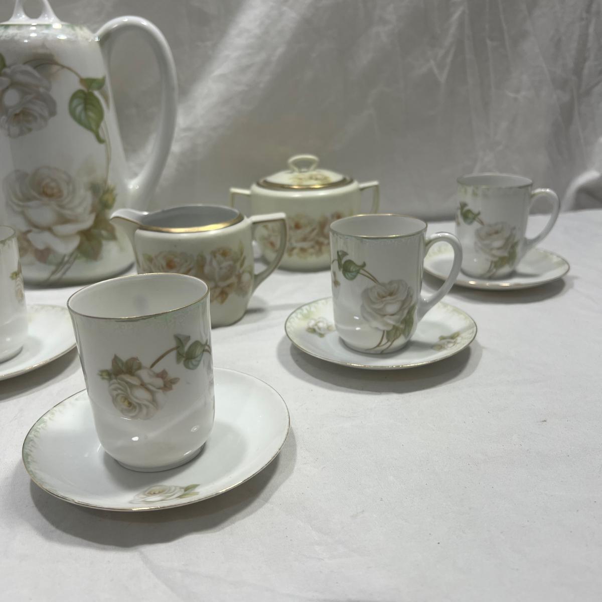 Vintage 5 piece Tea set with white roses including tea kettle, 5 cups, 5 saucers, a cream and sugar dish