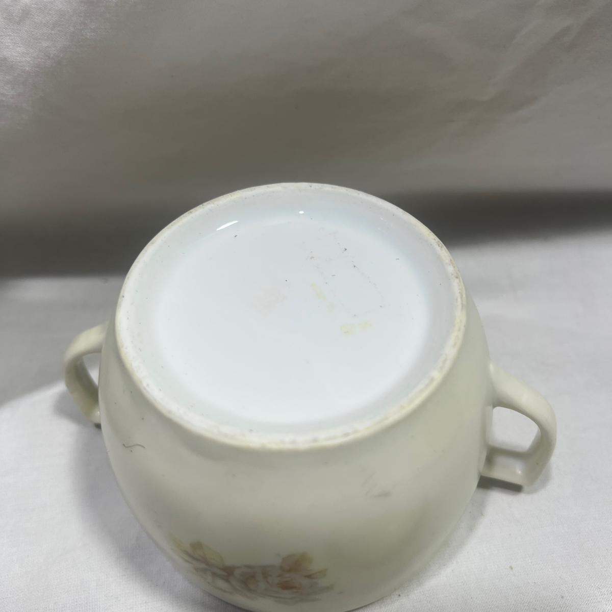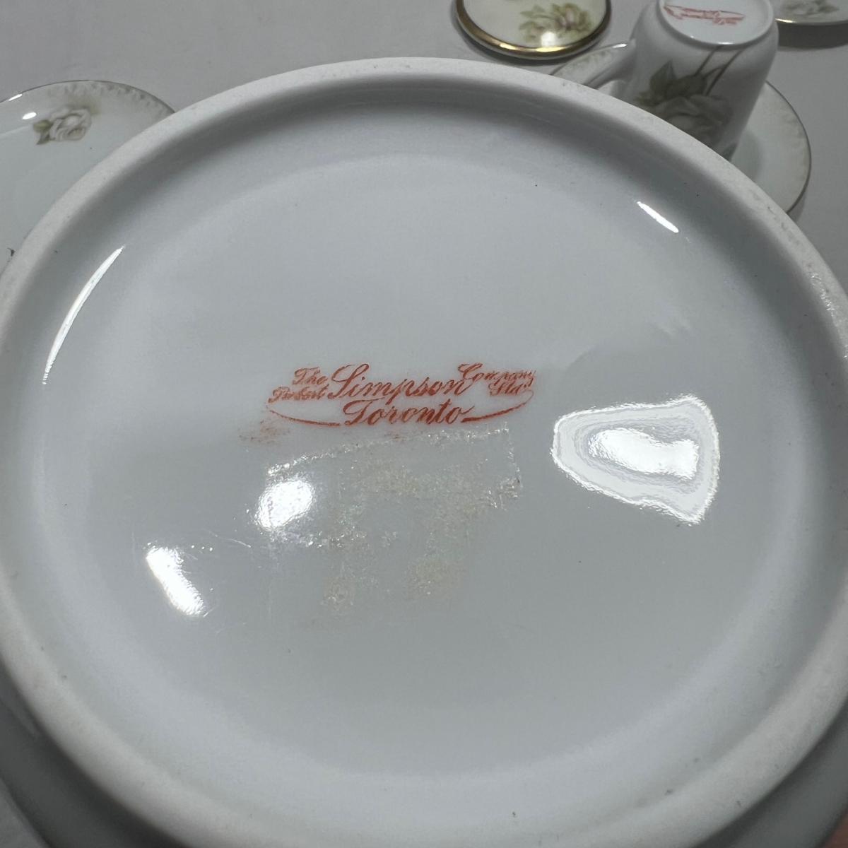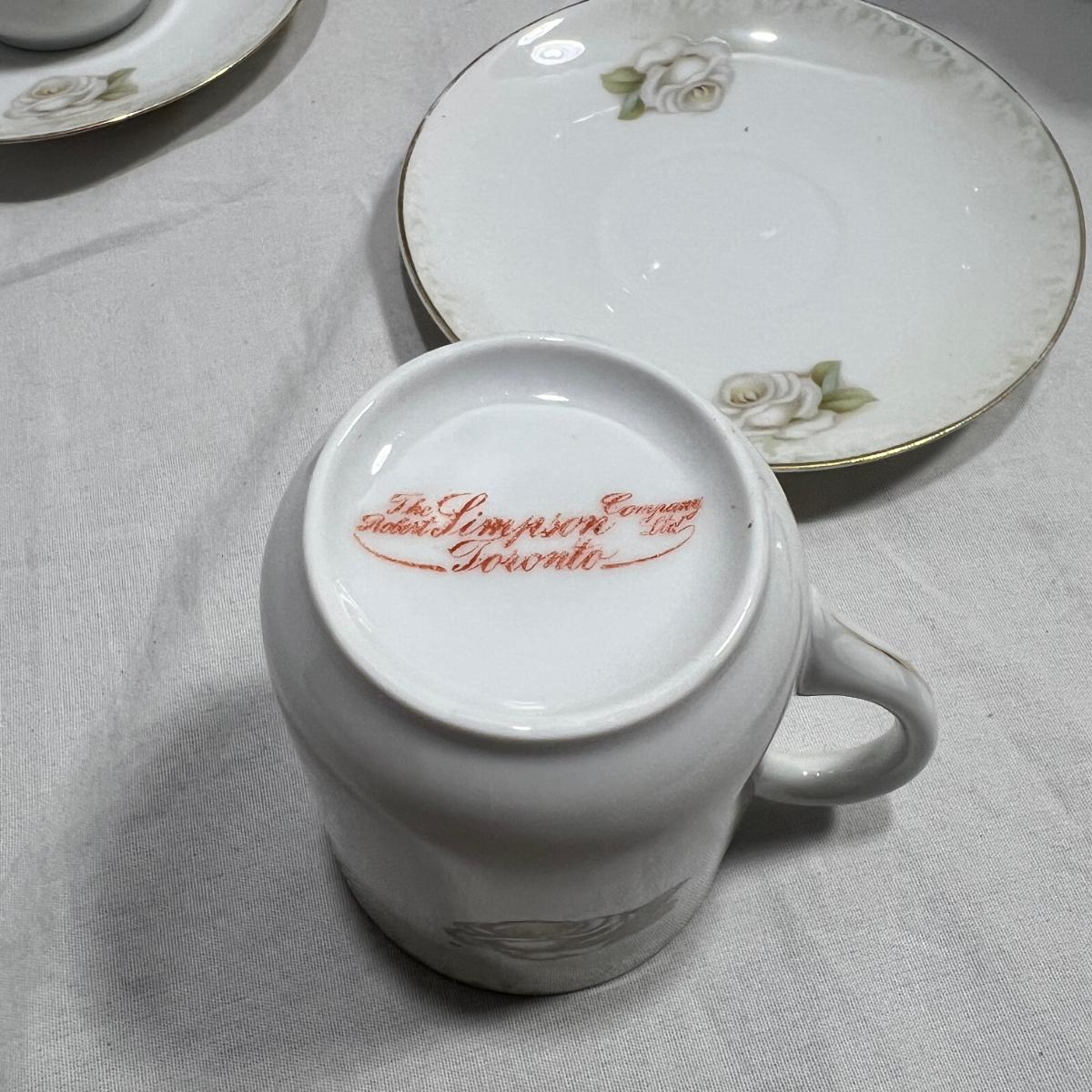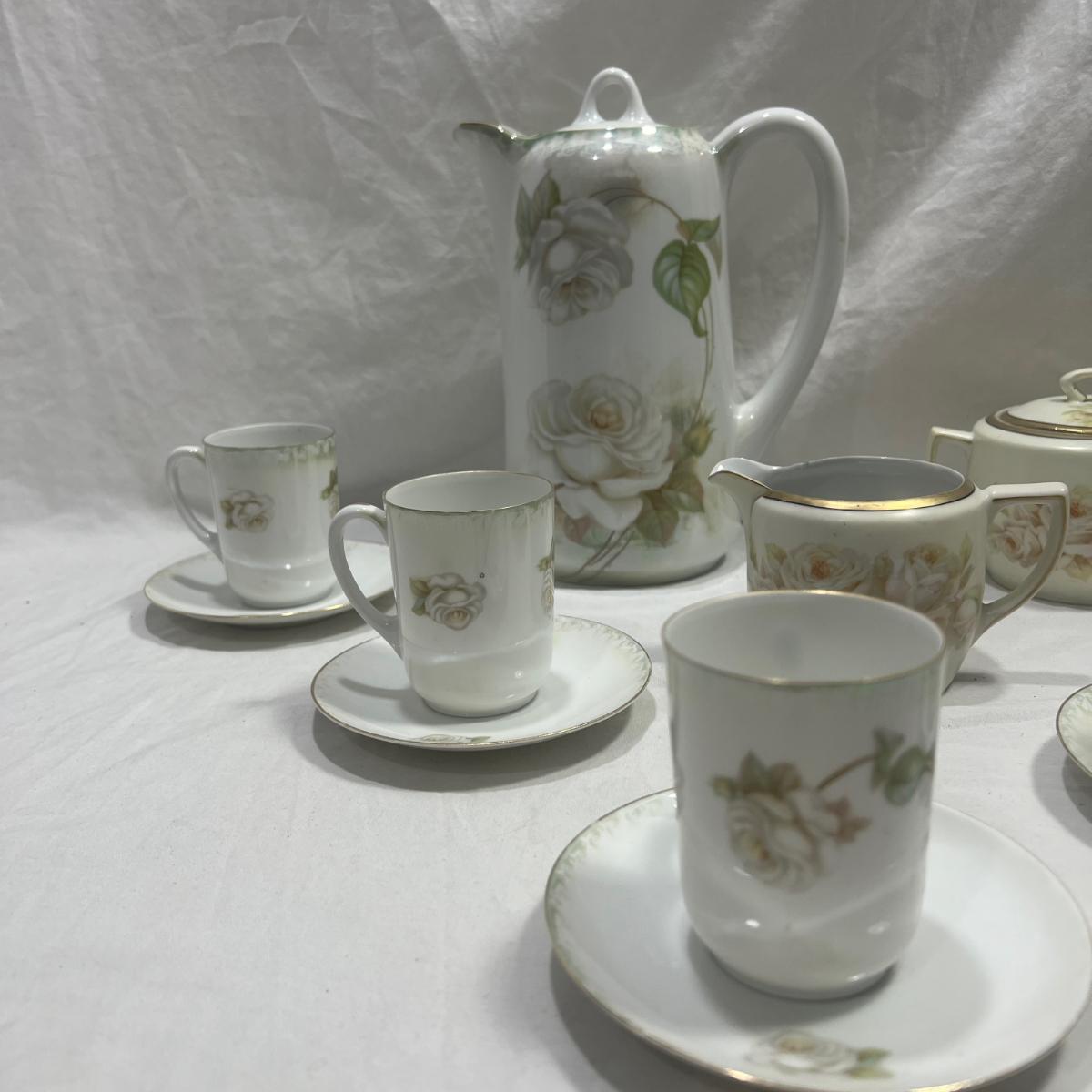 Vintage 5 piece Tea set with white roses including tea kettle, 5 cups, 5 saucers, a cream and sugar dish