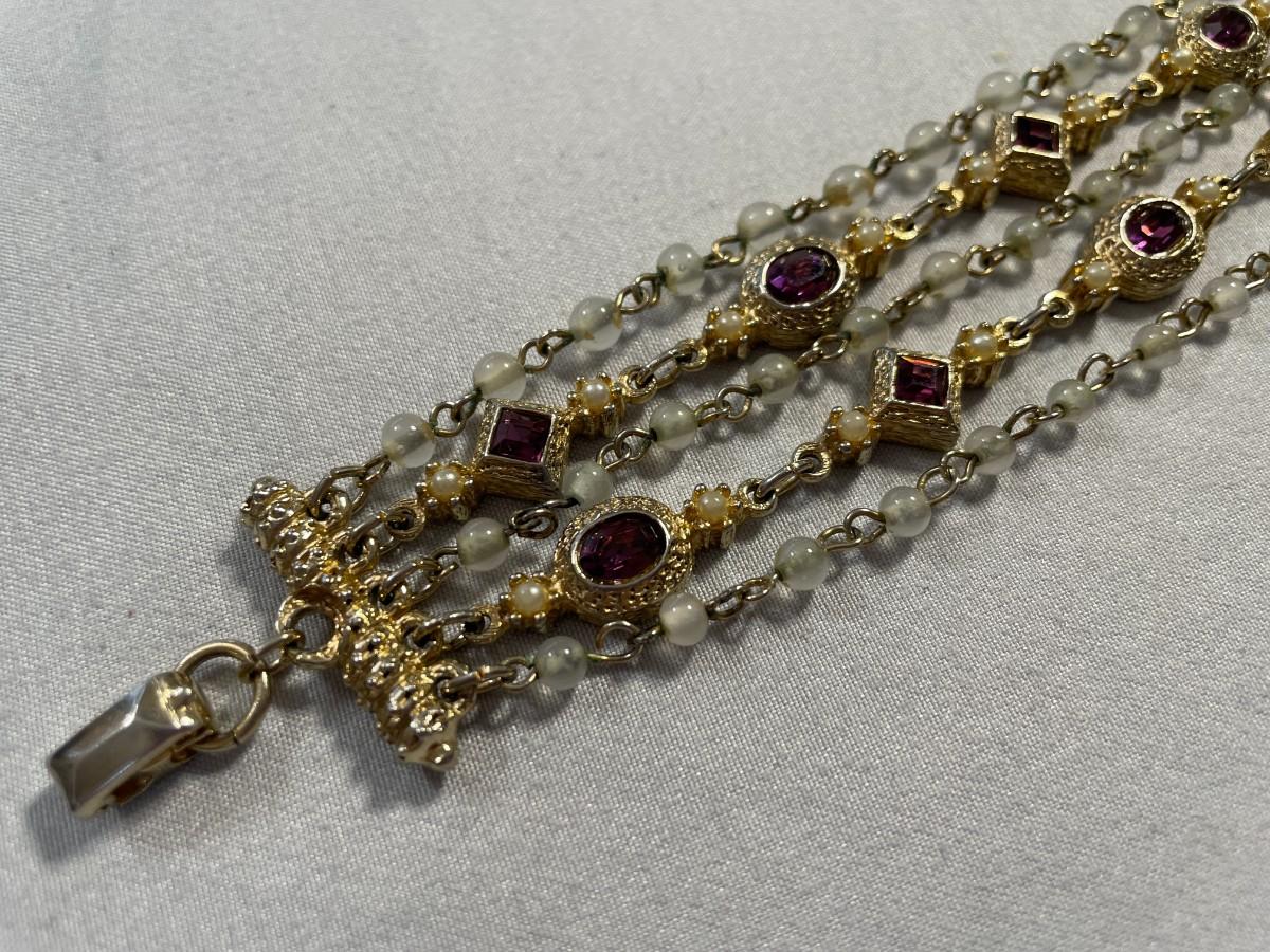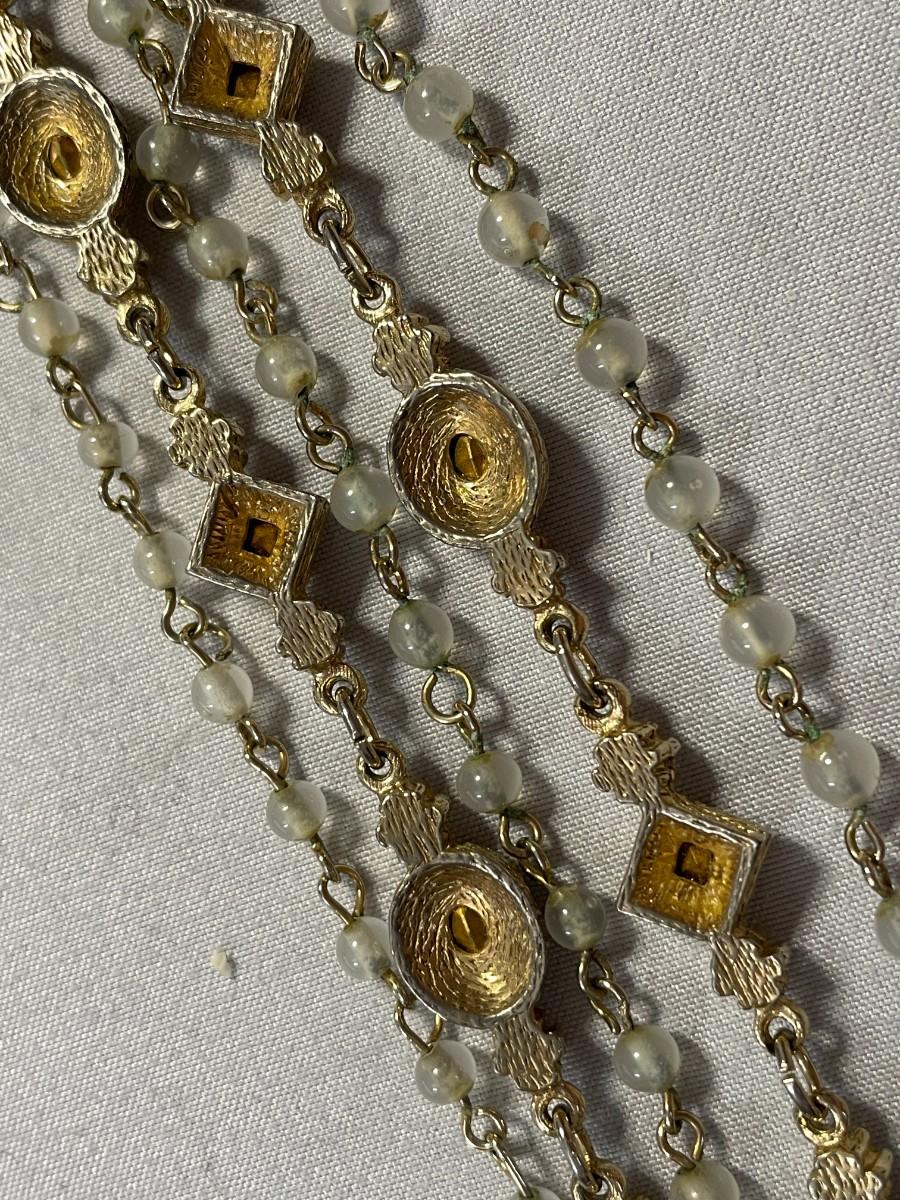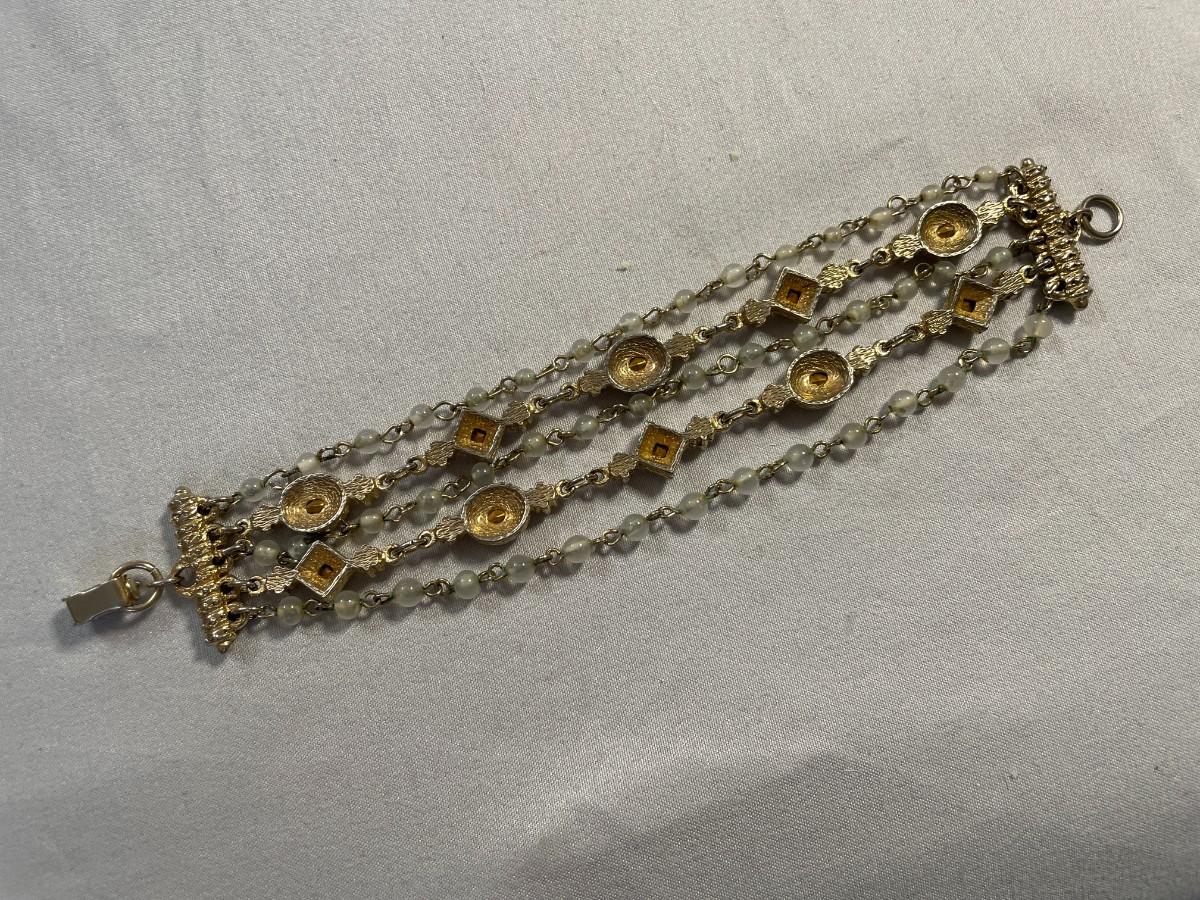 This is a gorgeous piece of jewelry that has five strands connected at either end with an gold tone metal bar. It is just shy of 7 inches in length and in excellent condition.