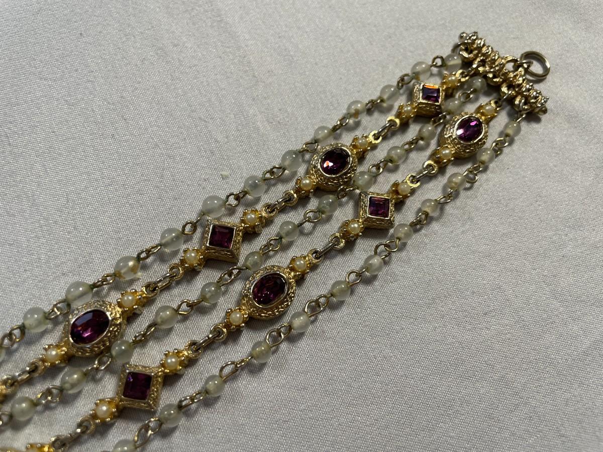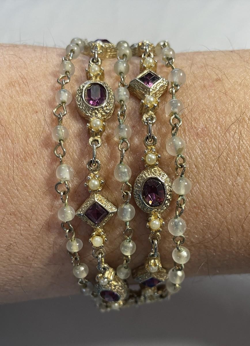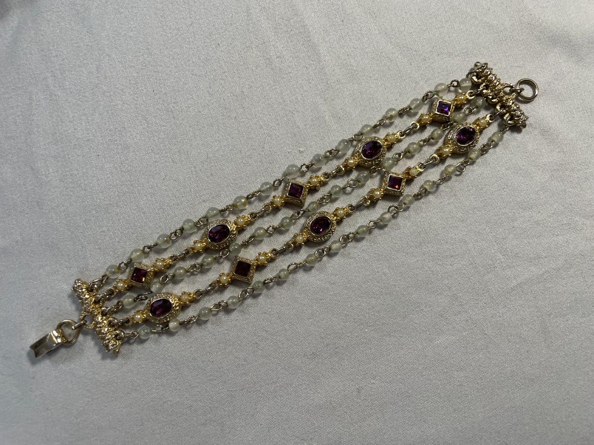 This is a gorgeous piece of jewelry that has five strands connected at either end with an gold tone metal bar. It is just shy of 7 inches in length and in excellent condition.