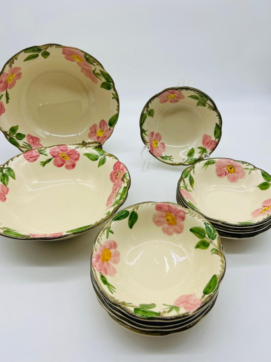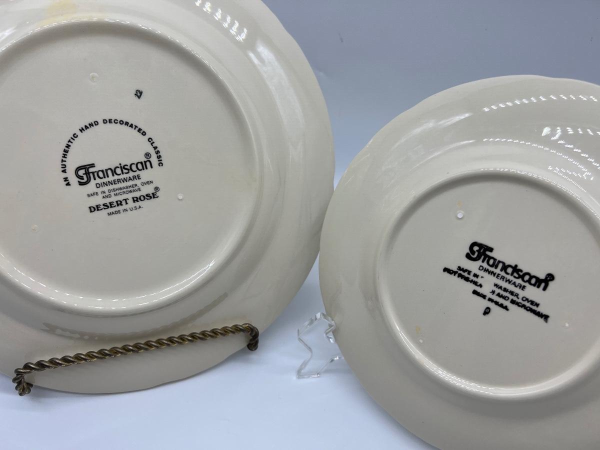 Vintage 51 Piece Franciscan Wear Desert Rose Dishes Include sugar and creamer, butter, dish, 8 cereal bowls, 10 dinner plates, 8 appetizer plates, 7 coffee saucers, 9 coffee cups, 1 gravy boat, 1 platter, 2 serving bowls and salt/ pepper shaker. 51 total