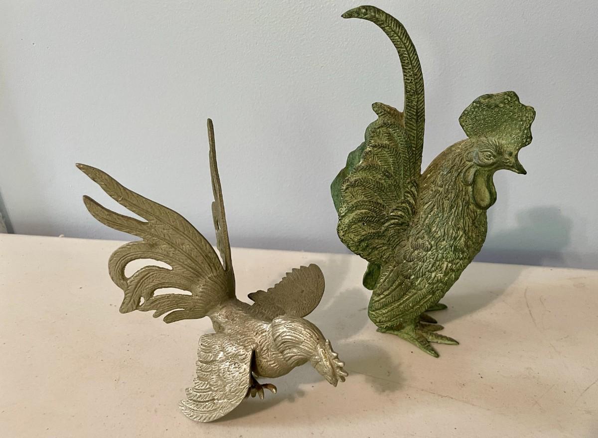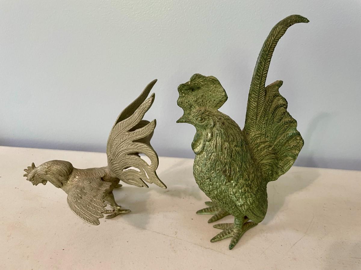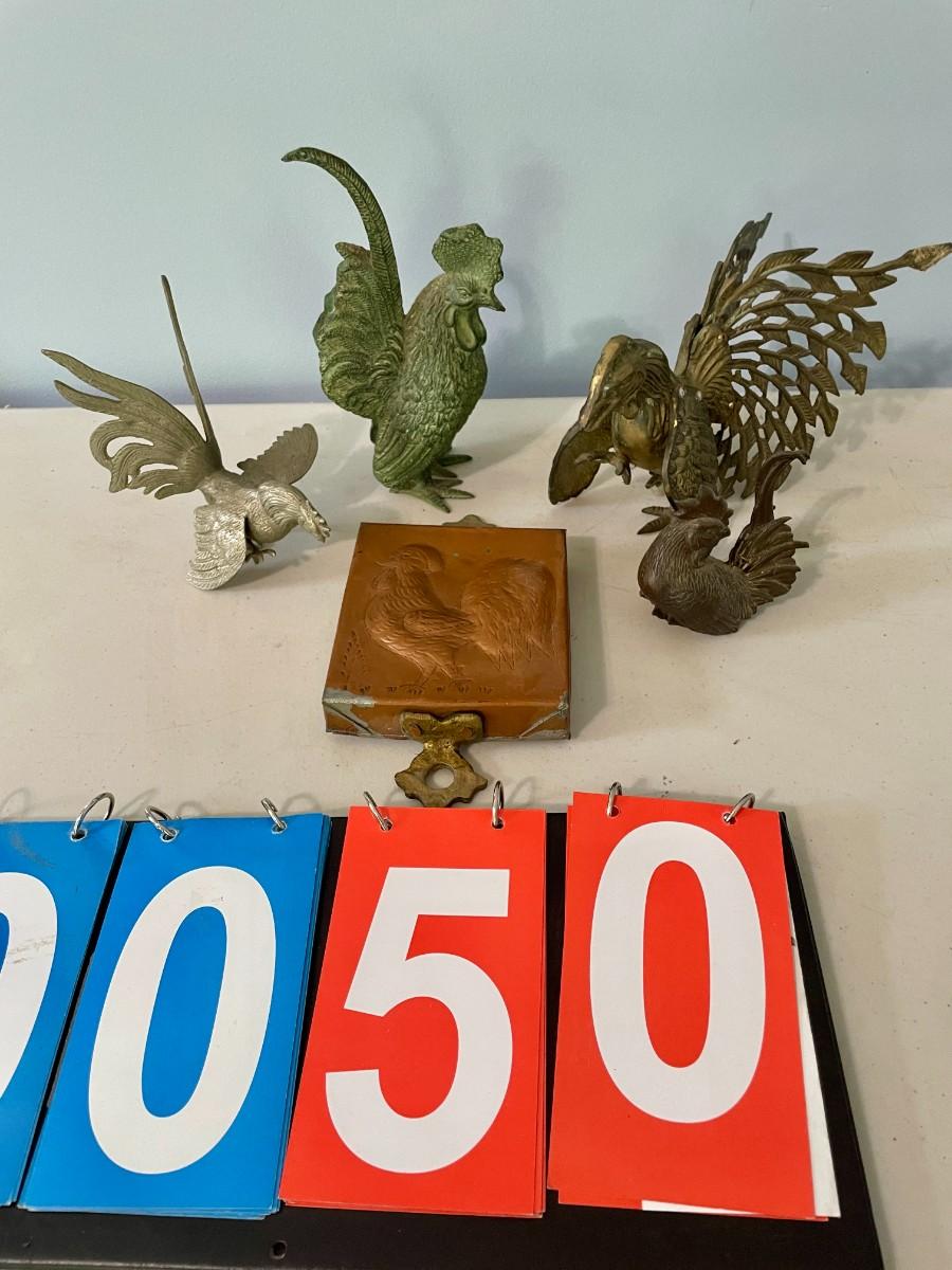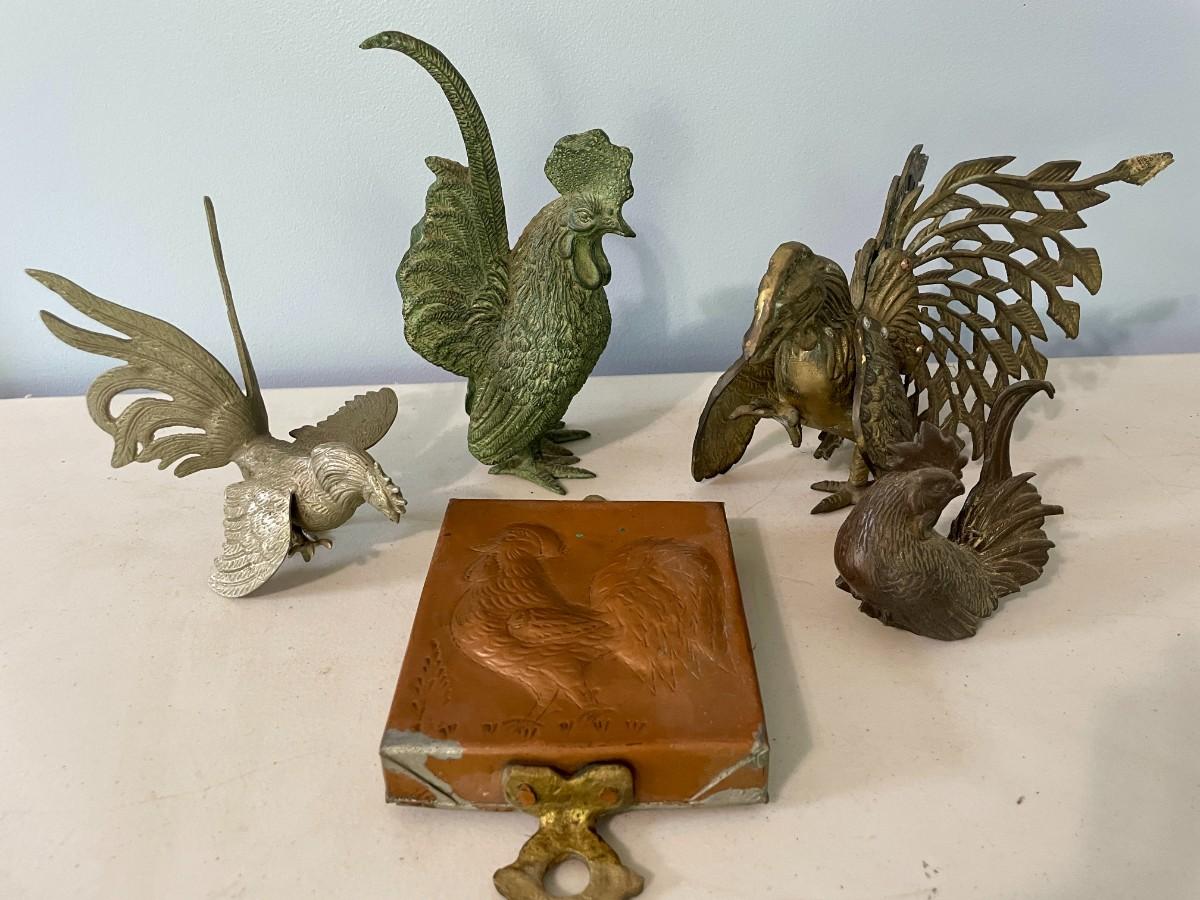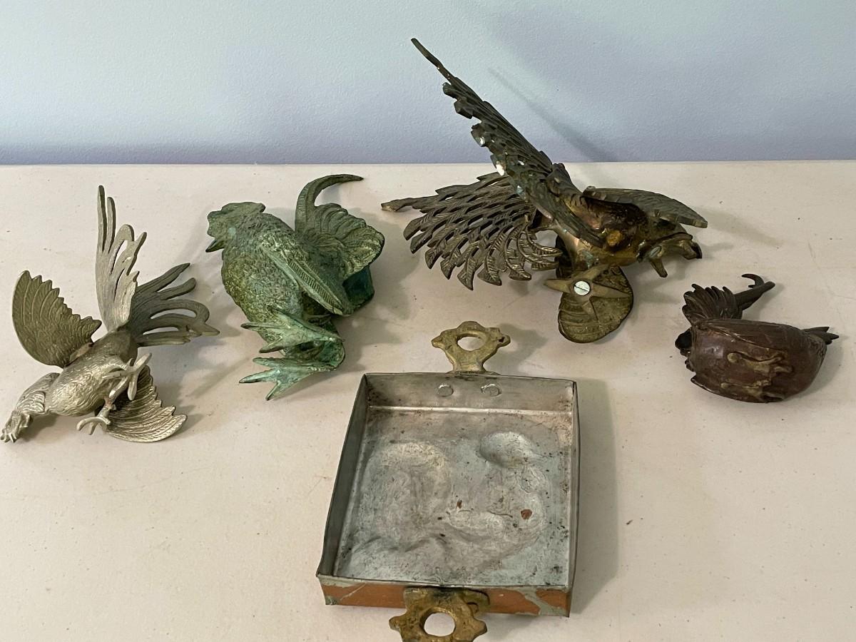 Vintage 5pc lot of metal fighting roosters & copper mold