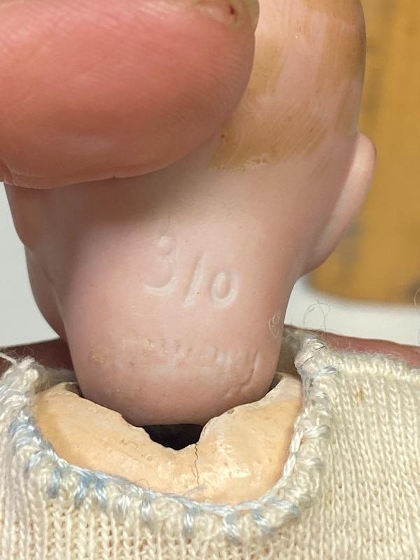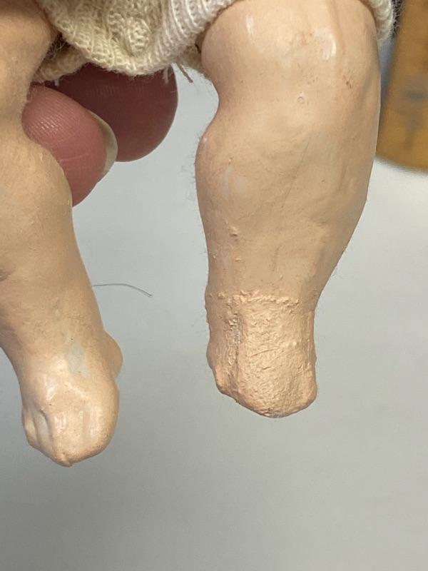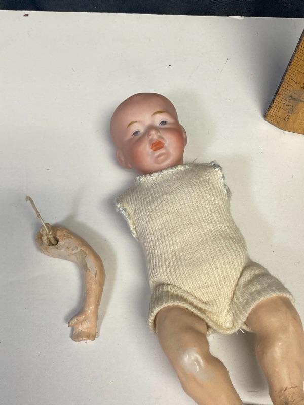 Vintage 6" dollhouse baby doll. Marked 3/0 Germany on back of neck, face has painted features. Unfortunately it is missing one arm and the other is disconnected. Bisque body has damage. The left leg looks like it has been repaired badly.