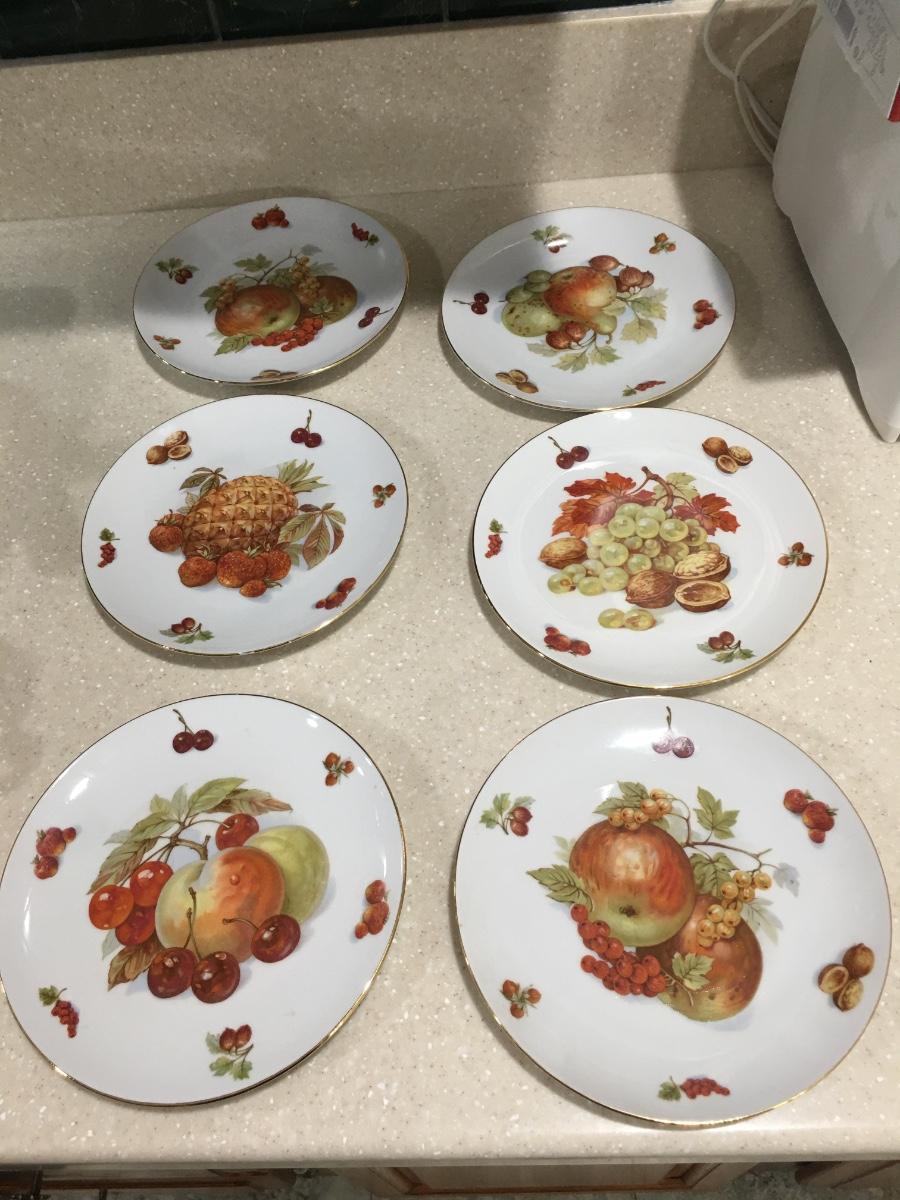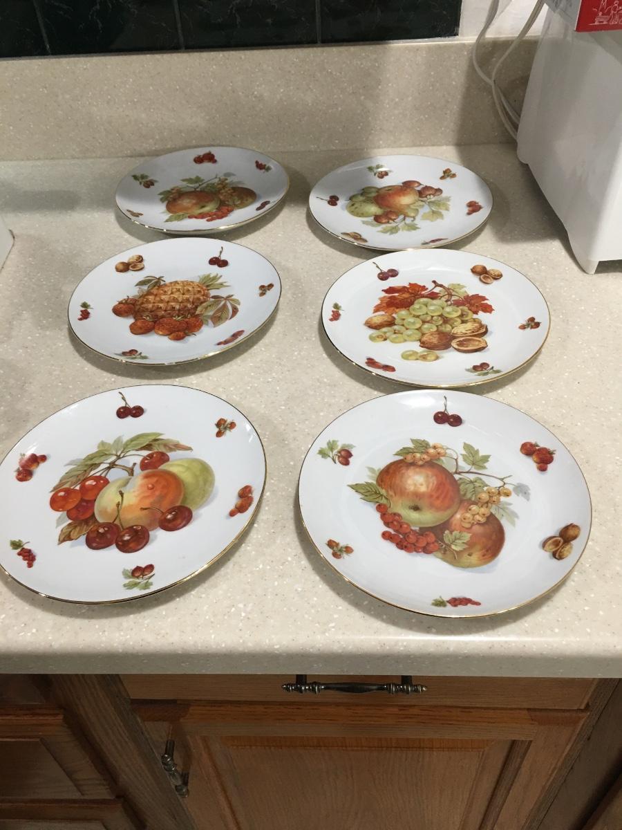 Vintage 6pc Seltmann Weiden Bavaria West Germany salad dessert plates. 7 1/2” in diameter white with gold trim and fruit and nut design. Good condition with no chips or cracks.