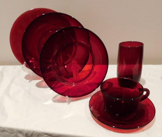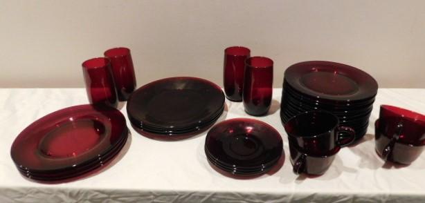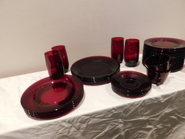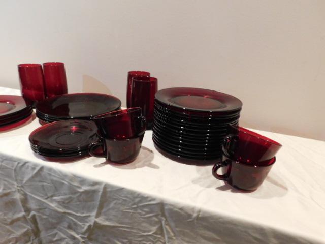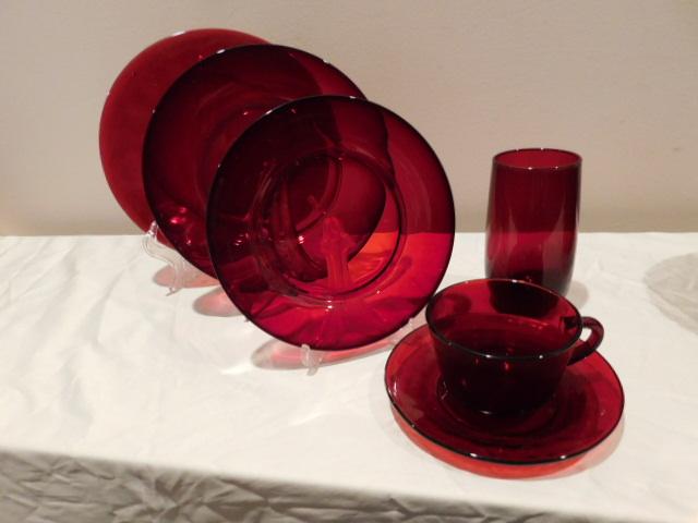 Vintage 6 Piece 4 Place Setting Red Glass Dining Set Plus Four Additional Salad Plates 28pcs