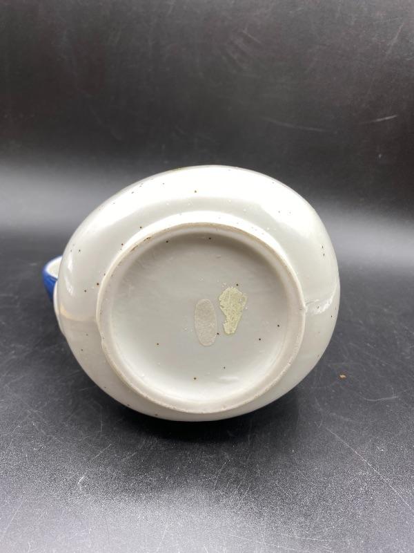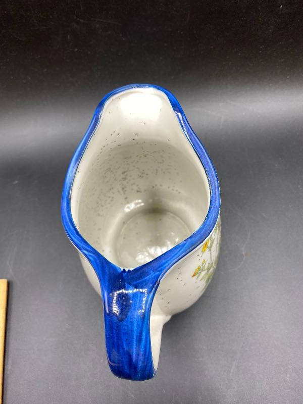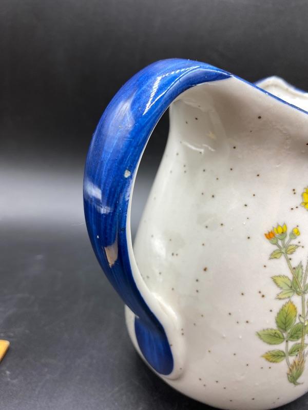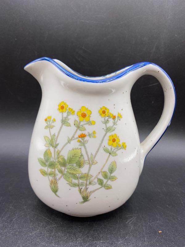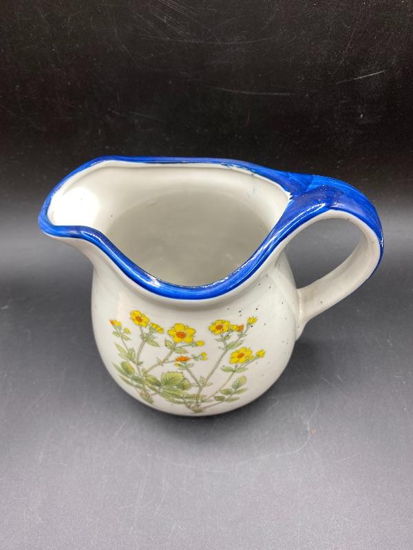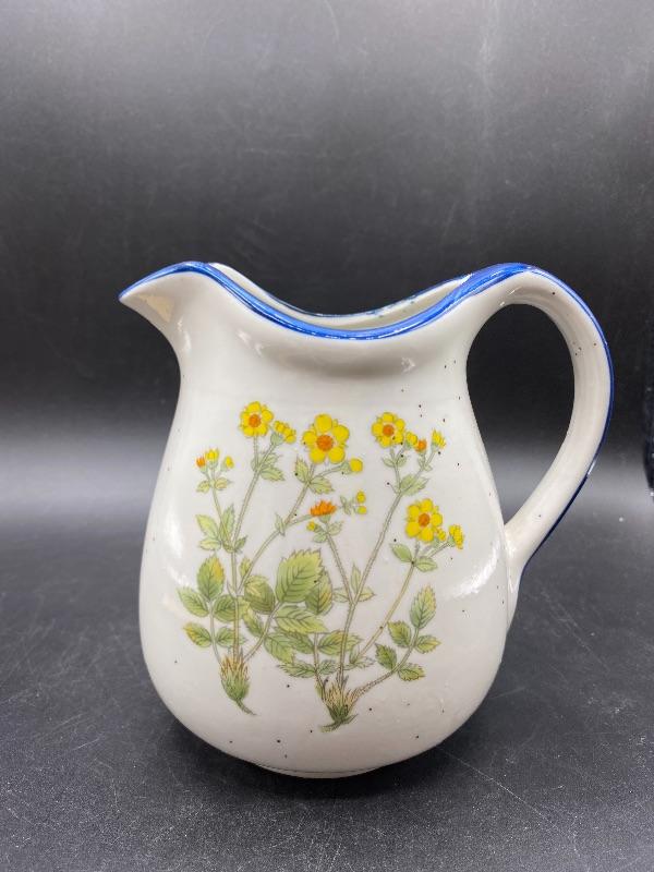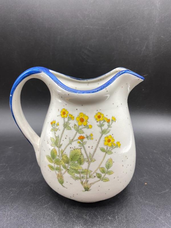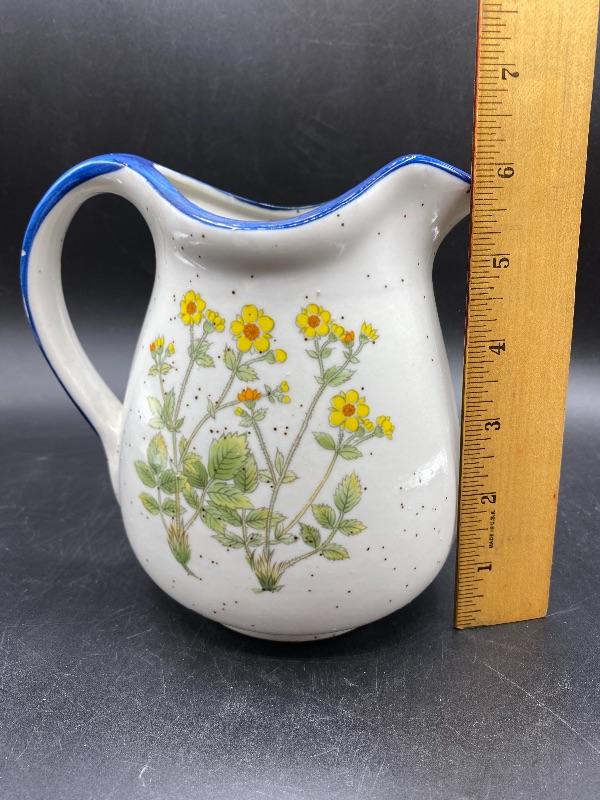 Vintage 6" water pitcher. Speckled ceramic features yellow daisy flower pattern. Has a blue rim and handle. Has a small chip in the paint on the handle, Unmarked.