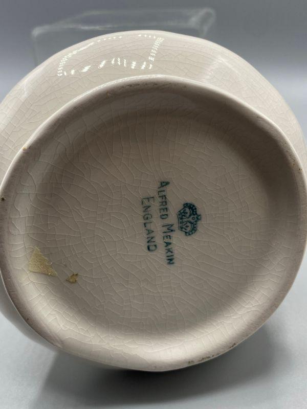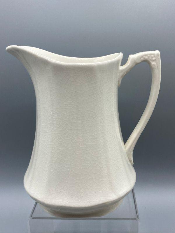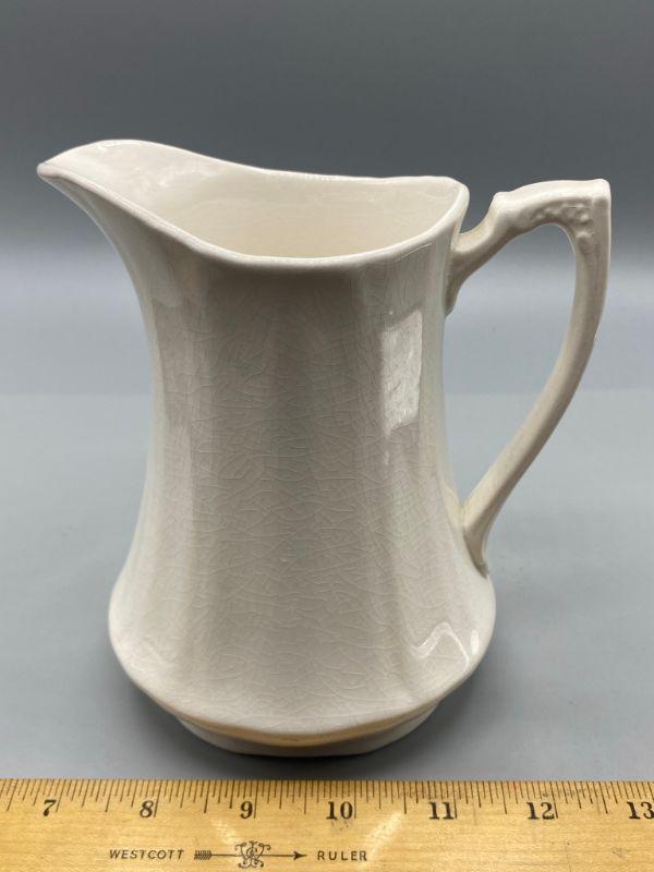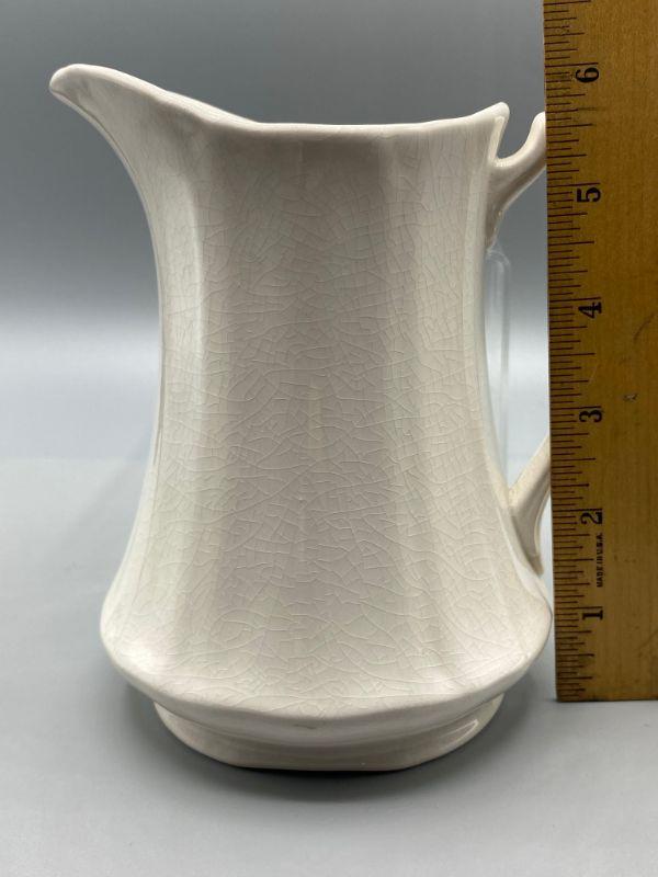 Vintage Alfred Meakin farmhouse decor water pitcher. Made in England. 6" size. Displays nicely, great for a flower vase. Does have crazing all over.