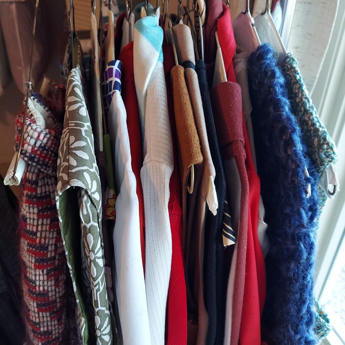 Lot includes approximately 20 pieces of vintage clothing from the 1960s/1970s in roughly size medium to large. Some overall condition issues due to age. Please see photos for details. Shipping available. Clothing racks are props and are not included in the auction!