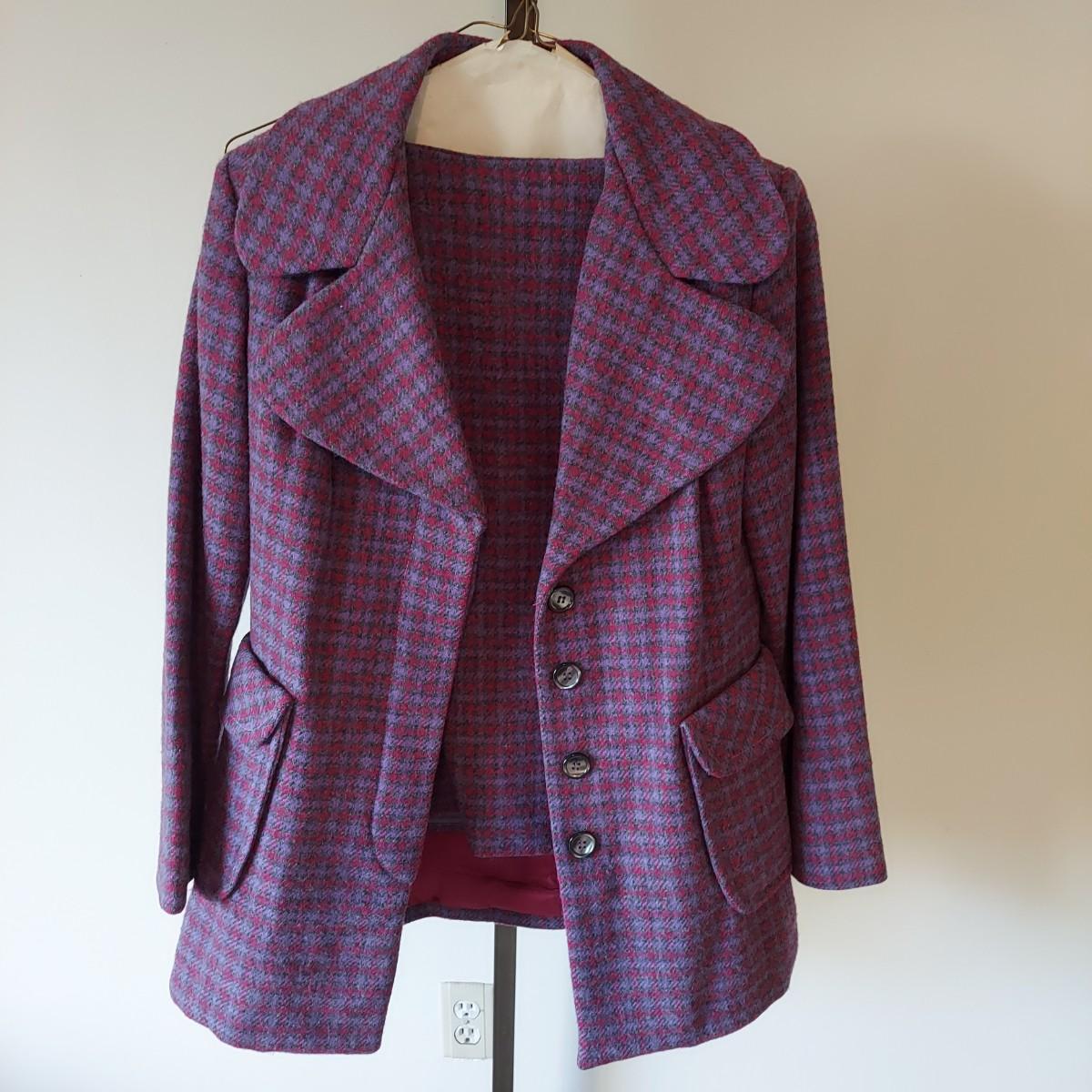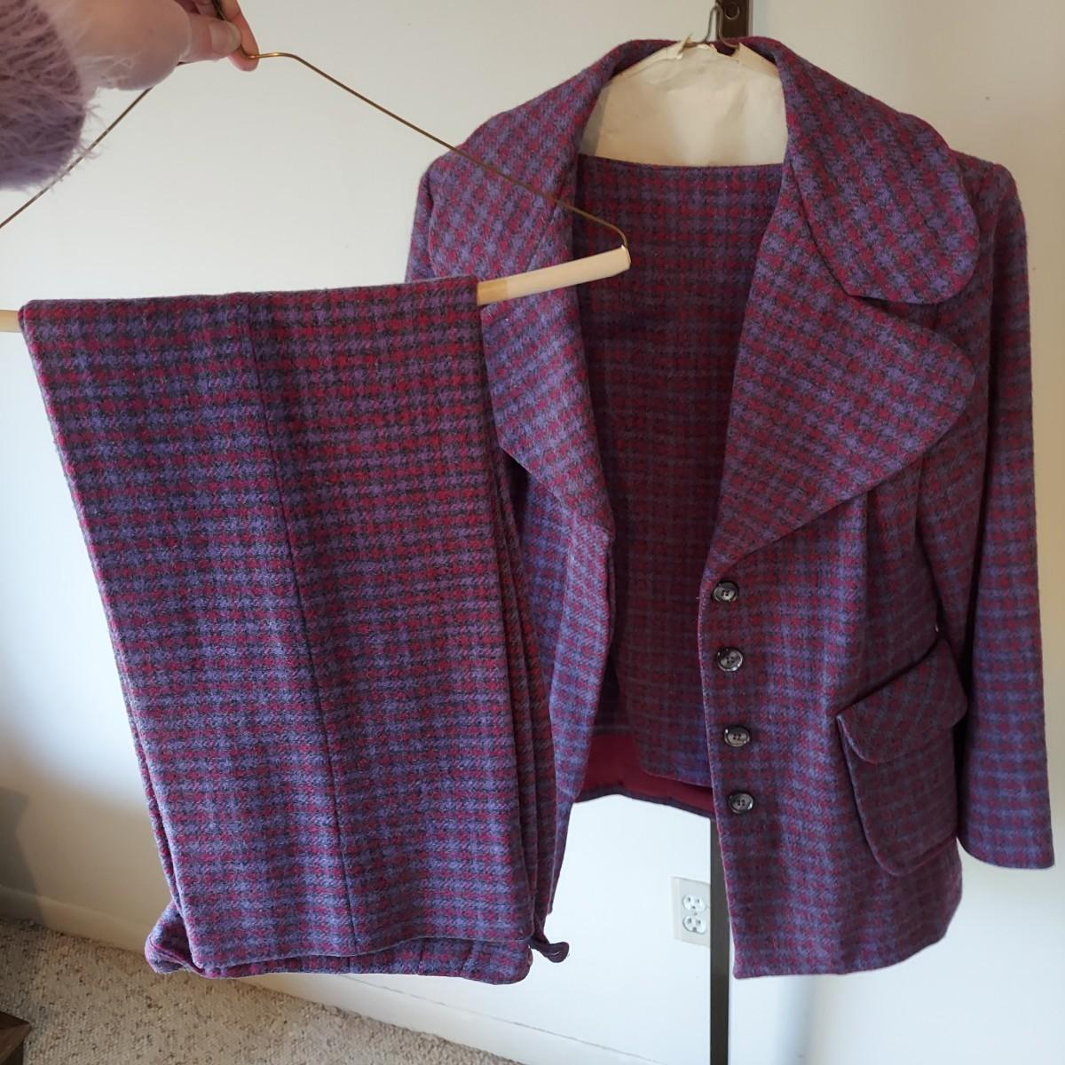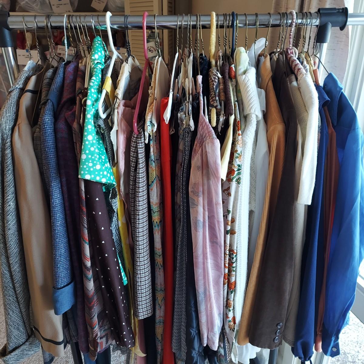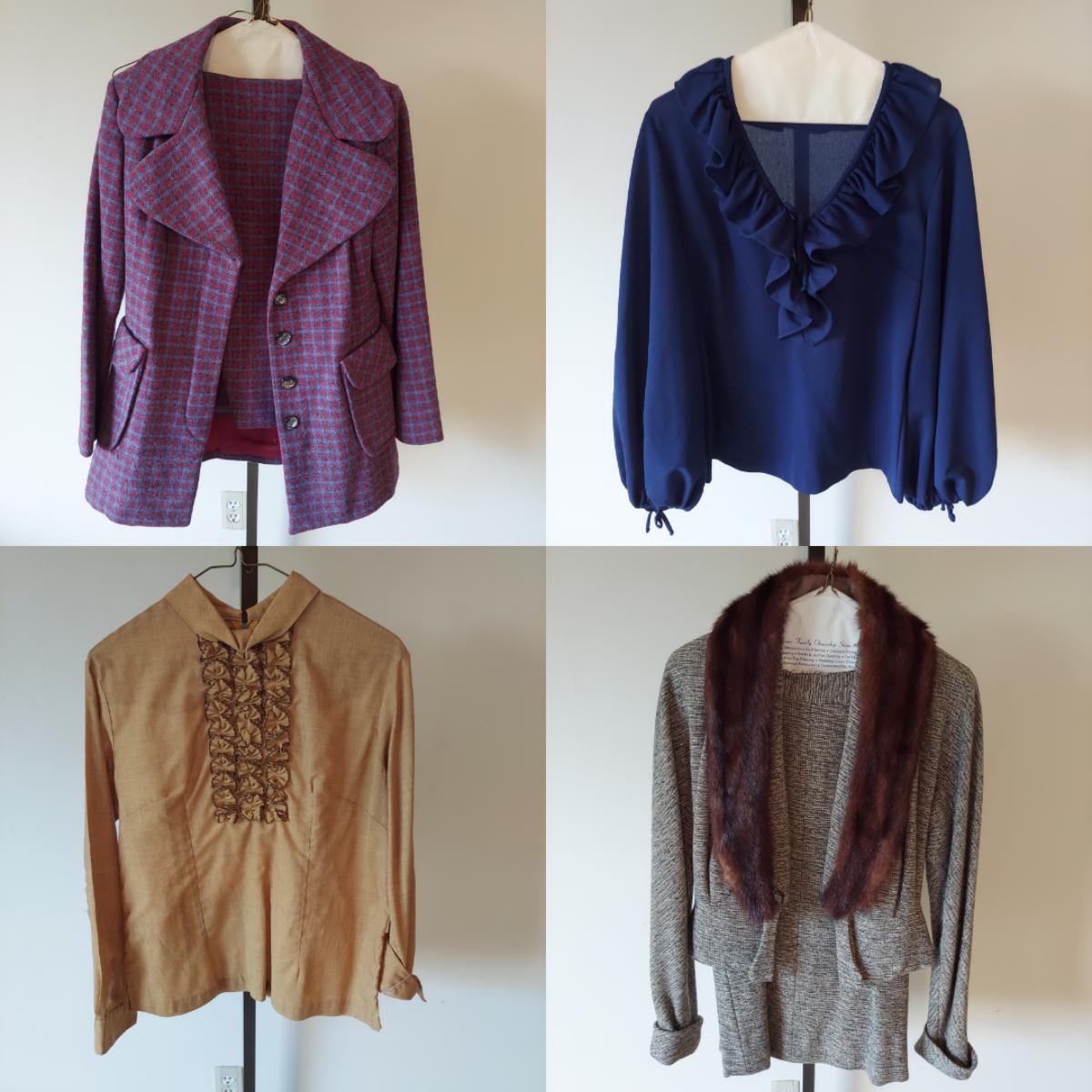 Lot includes approximately 40 pieces of 1960s/1970s vintage clothing in roughly size small. There are matching sets, skirts, trousers, blouses and jackets. Some condition due to age. Please see photos for details. Shipping available. Clothing racks are props and are not included in the auction!