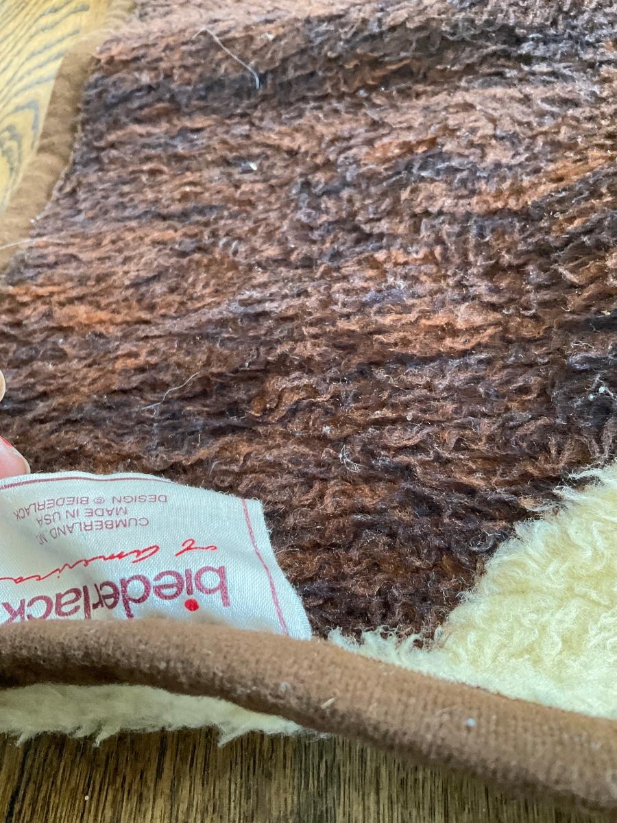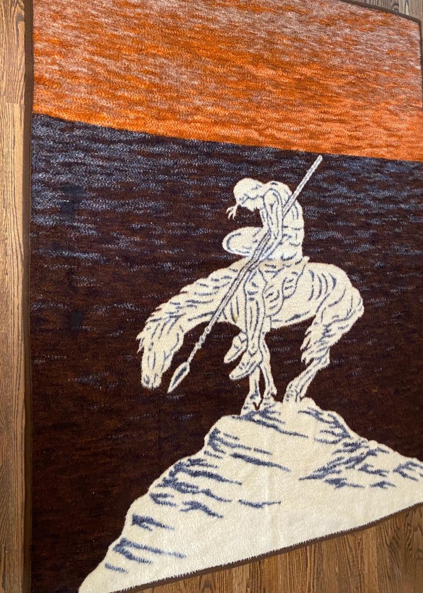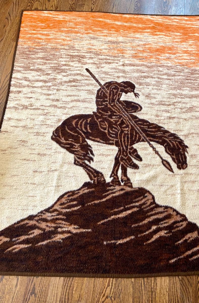 Cool old fuzzy throw by Biederlack featuring reversible orange/brown/cream design of sad Indian warrior on a mountain peak. Measures 58” x 72” . No damage of note, still fluffy , no pilling.