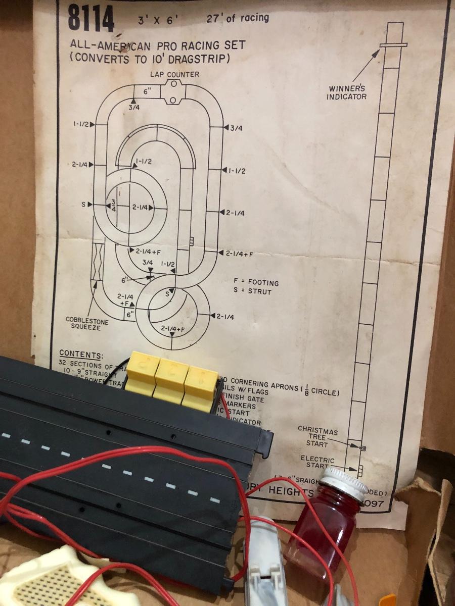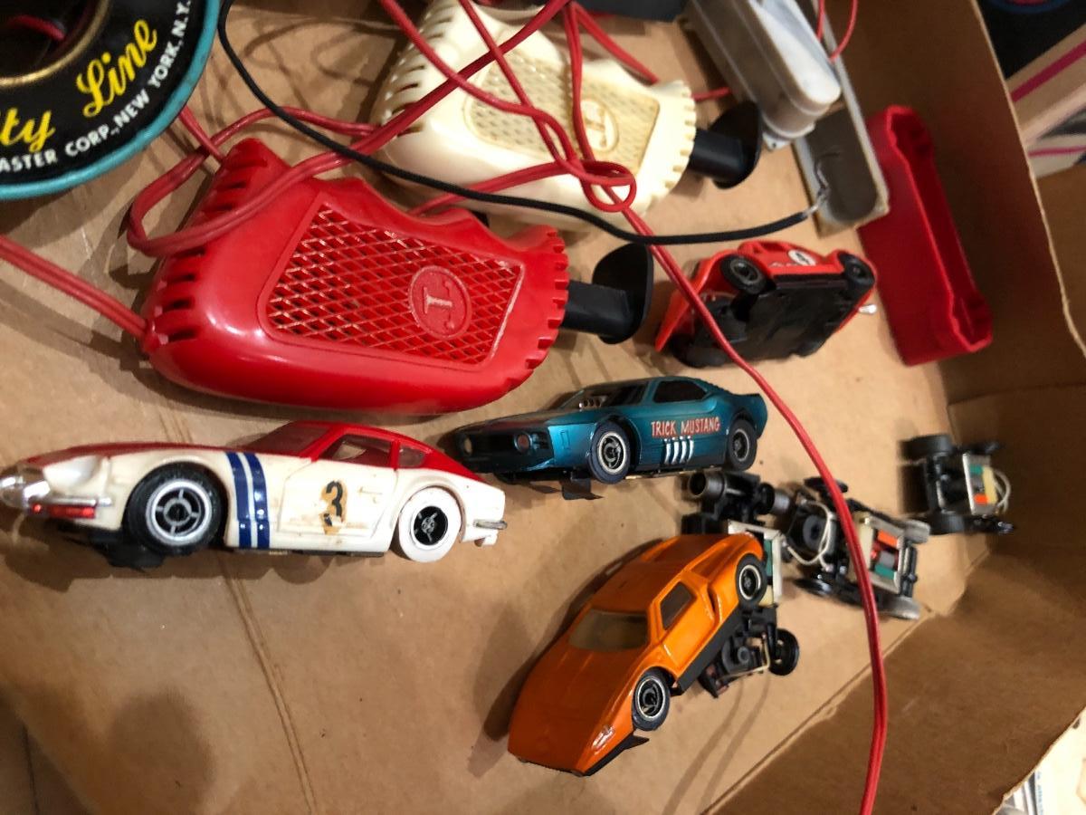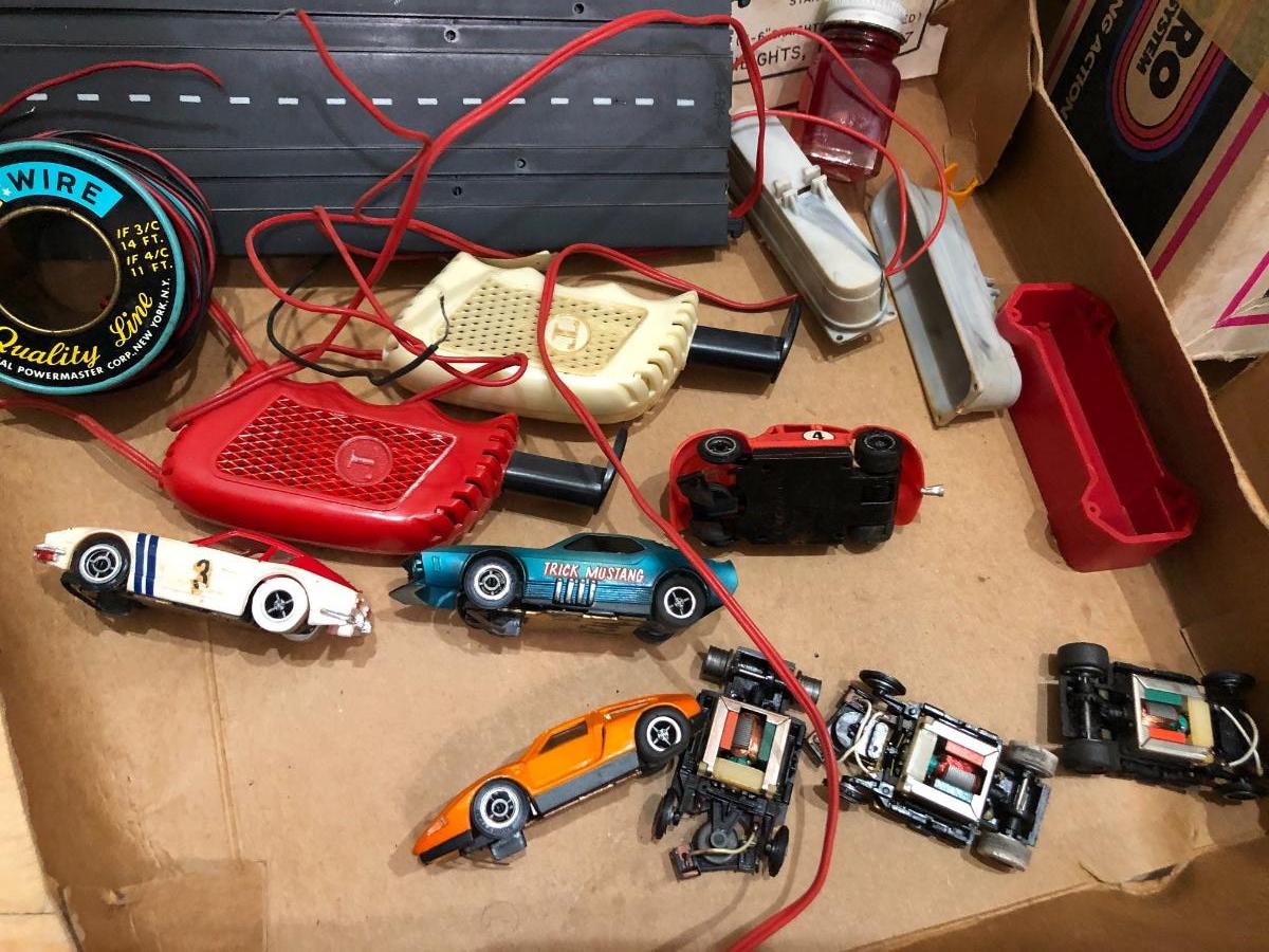 All items are sold as is, as found in the estate. Please see all photos for content, measurements and condition. This item is untested due to age of electrical plug. Set includes 8 cars and 10 car shell / body covers.