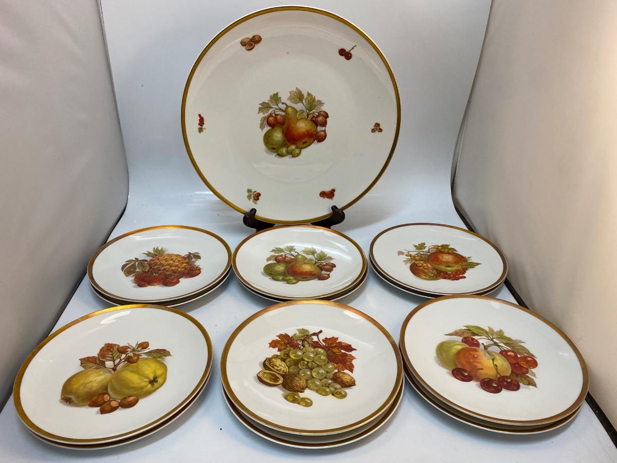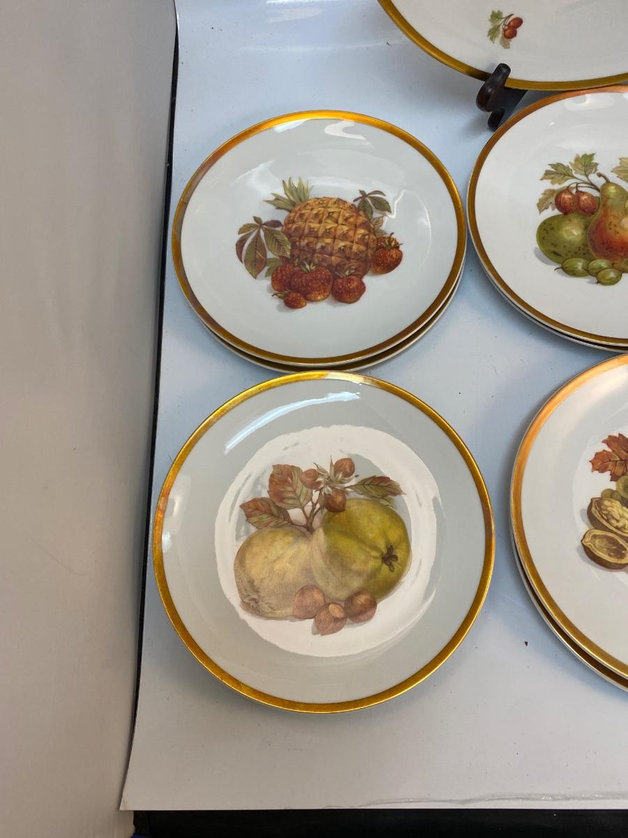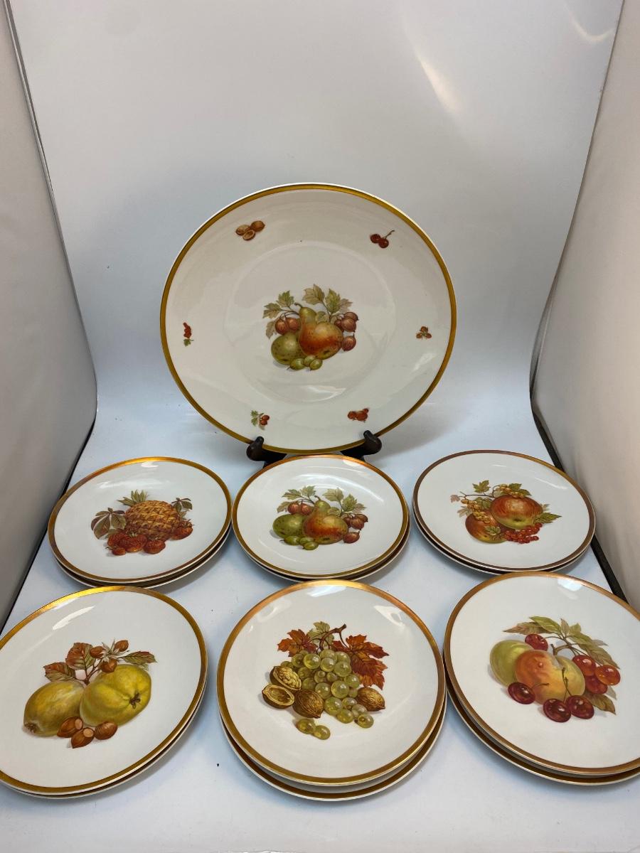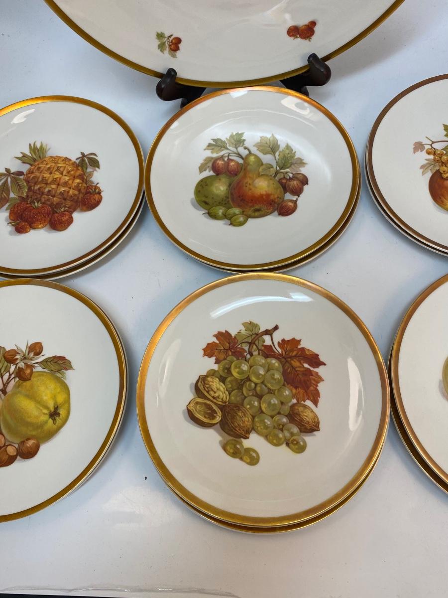 Vintage Golden Crown E&R PMR Bavaria Harvest Pattern Cake Dessert Serving Plate Set. Beautiful vintage china set in "Harvest" pattern featuring a cake plate and 12 dessert plates. Plates feature fruit in the center with gold edge. 6 different patterns on plates. In good vintage condition, no chips or cracks, very little wear or utensil marks. Great for the holidays.