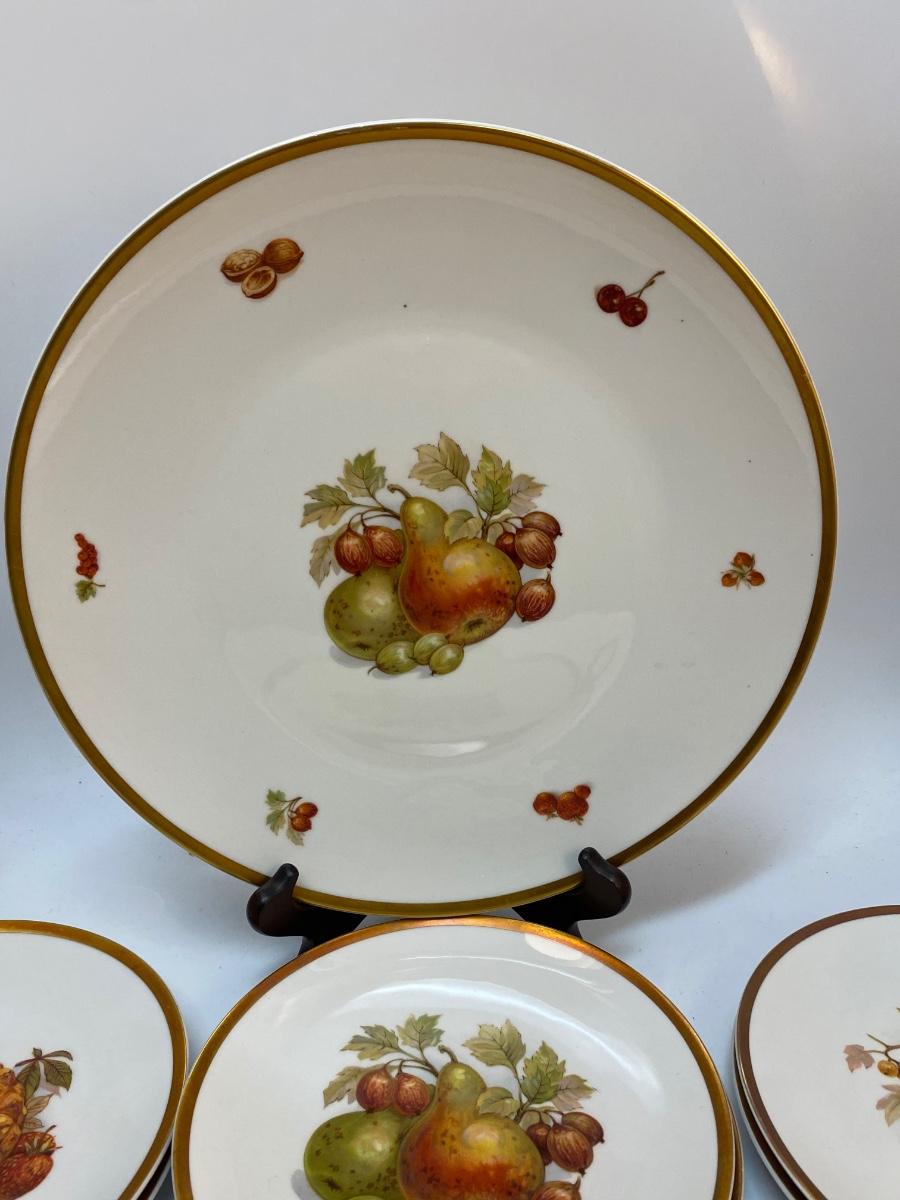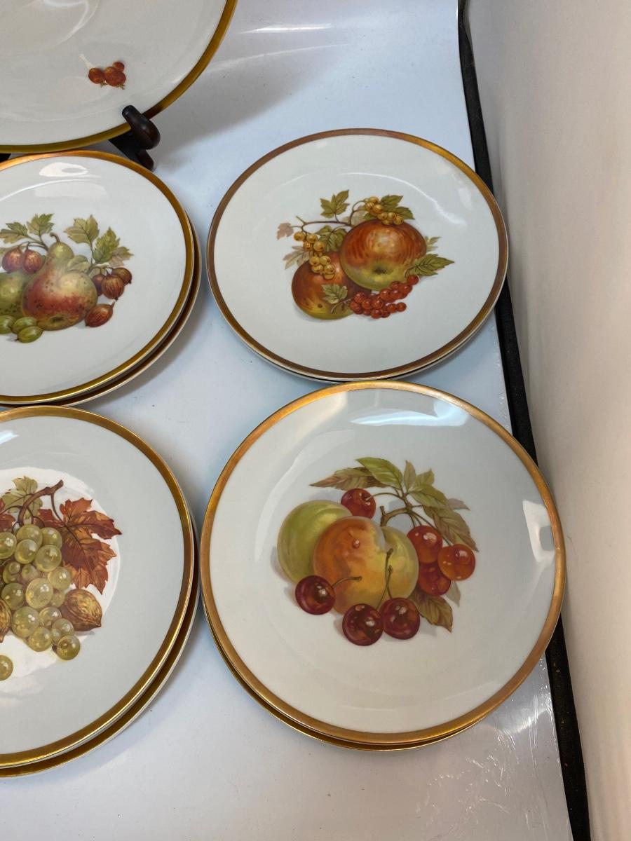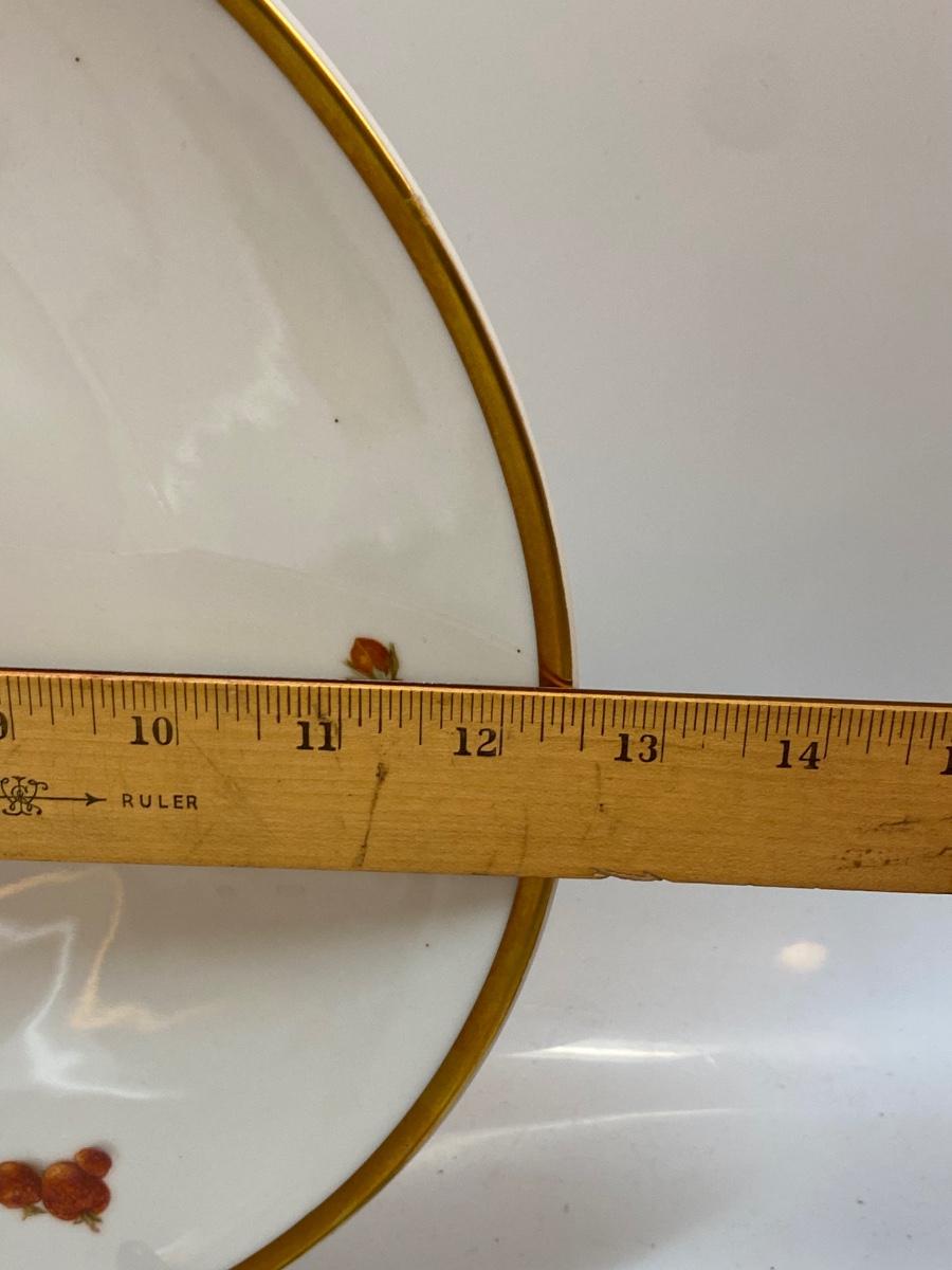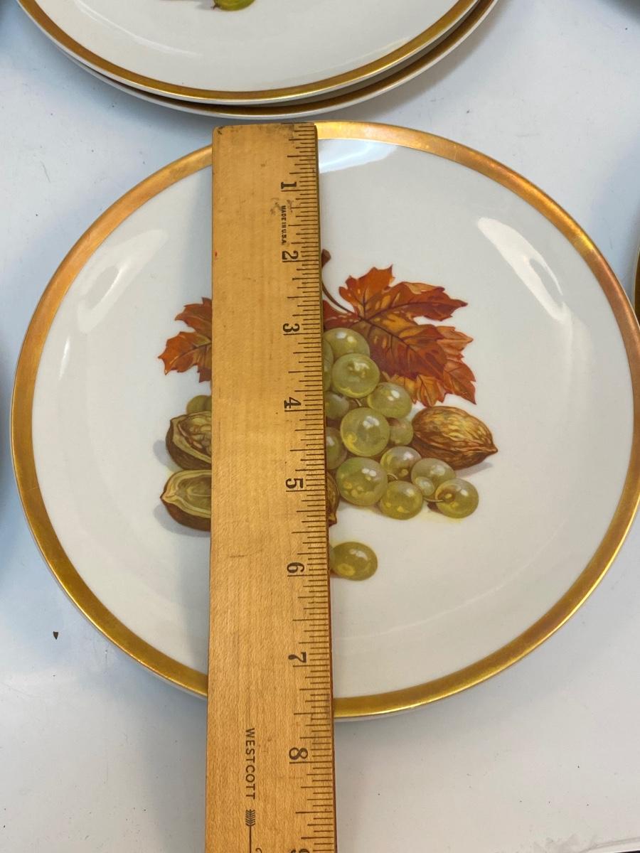 Vintage Golden Crown E&R PMR Bavaria Harvest Pattern Cake Dessert Serving Plate Set. Beautiful vintage china set in "Harvest" pattern featuring a cake plate and 12 dessert plates. Plates feature fruit in the center with gold edge. 6 different patterns on plates. In good vintage condition, no chips or cracks, very little wear or utensil marks. Great for the holidays.