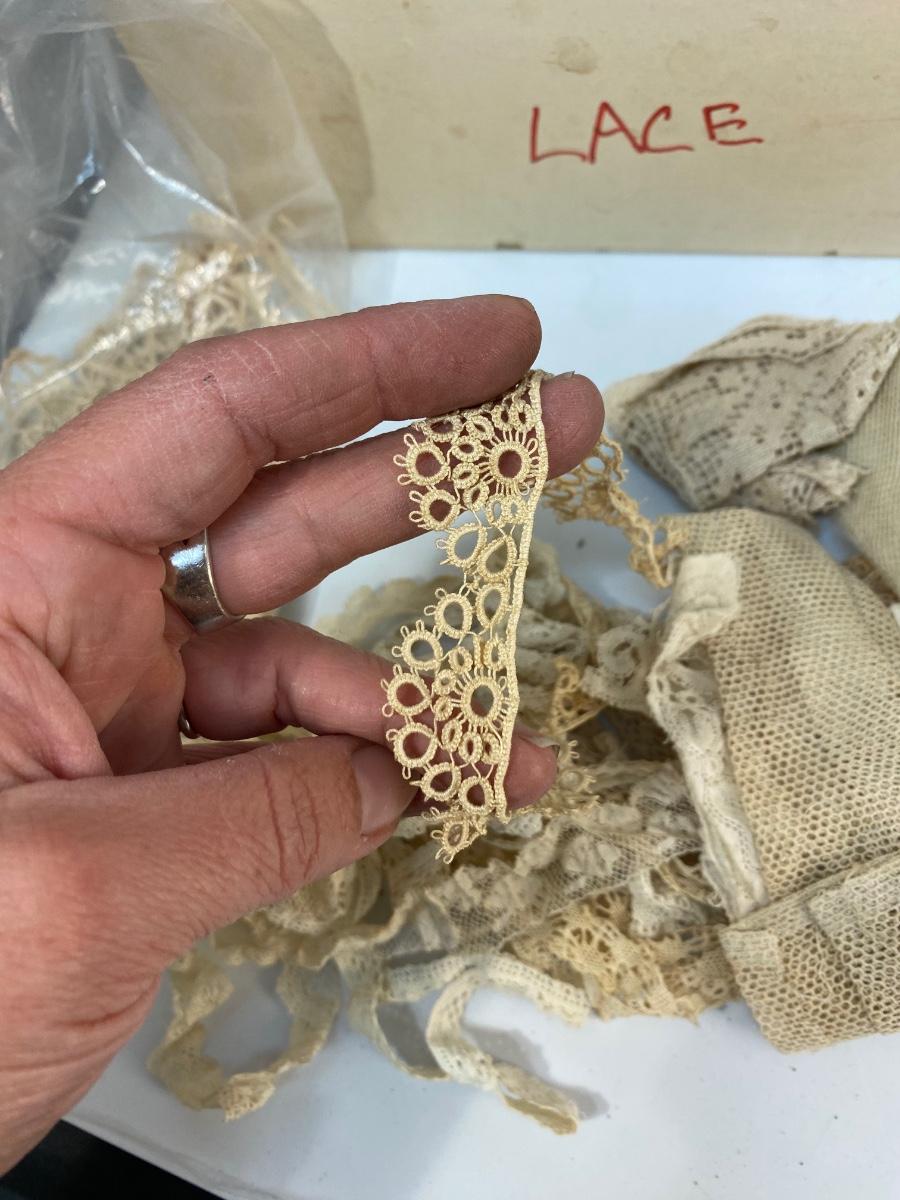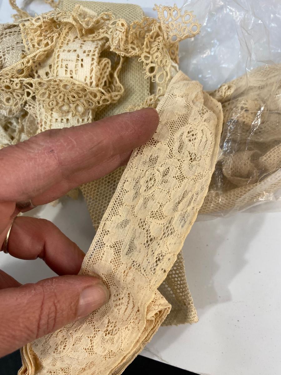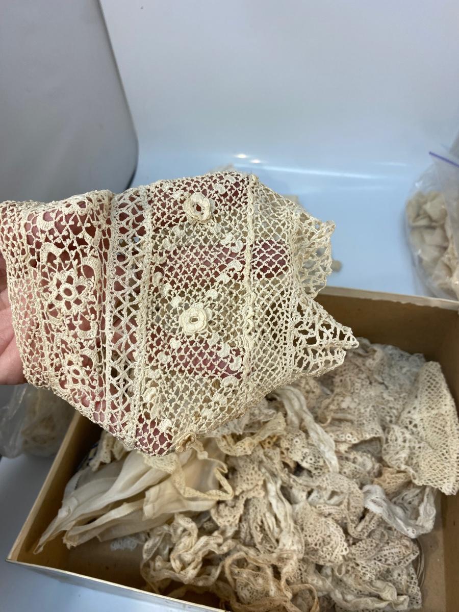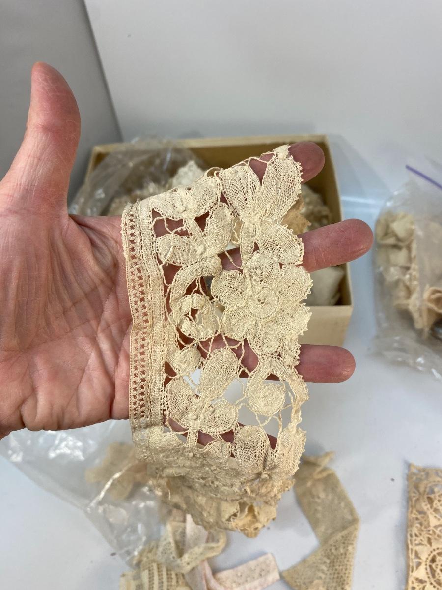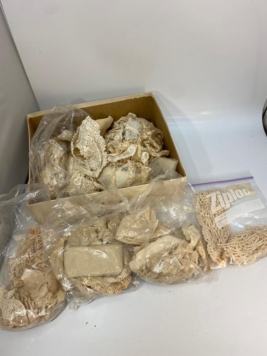 Vintage Antique Small Box & Bags of Ecru Off-White Lace Trim Remnants & Pieces. Different styles and patterns. Various lengths. See photos for better idea of styles included.