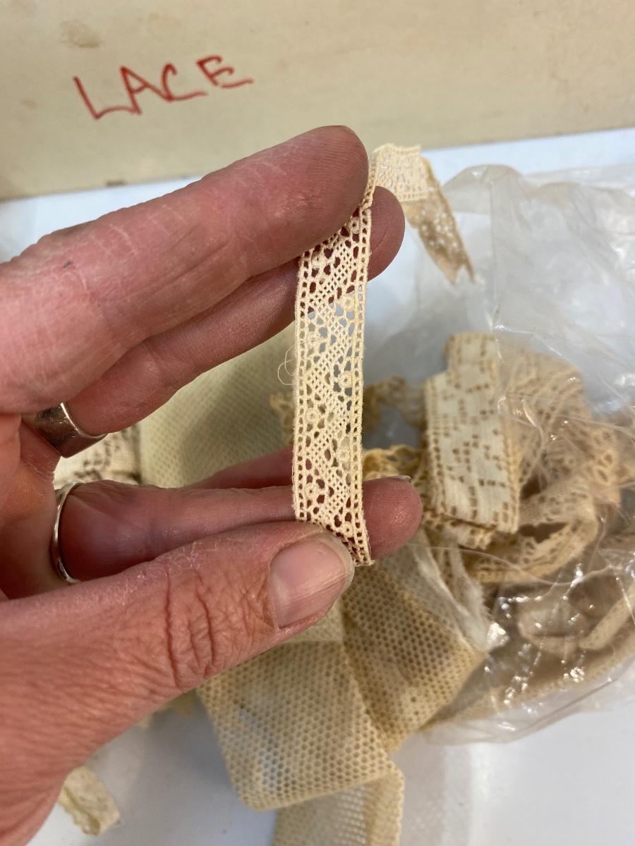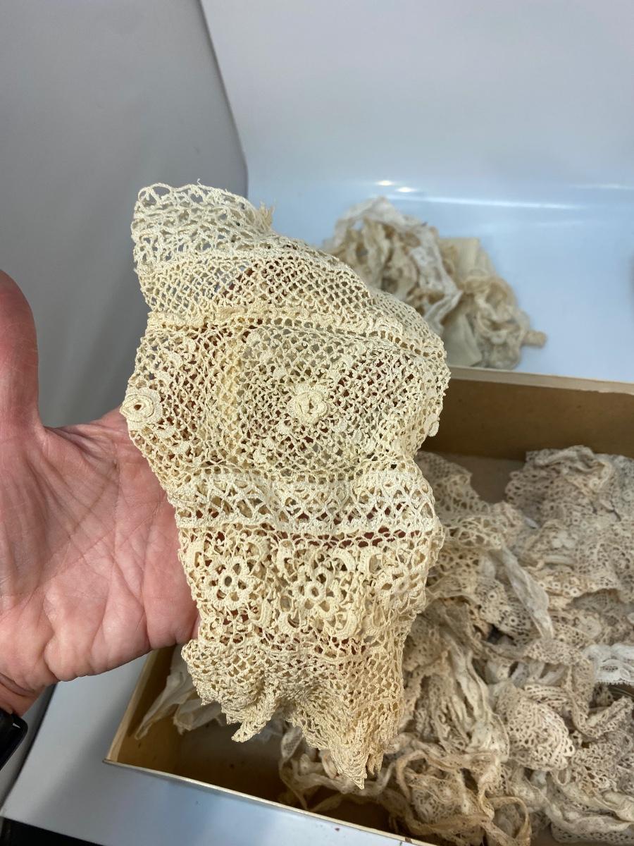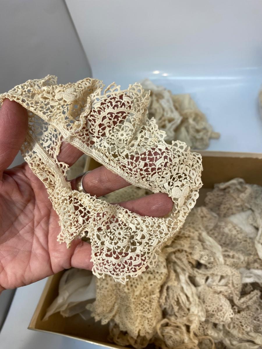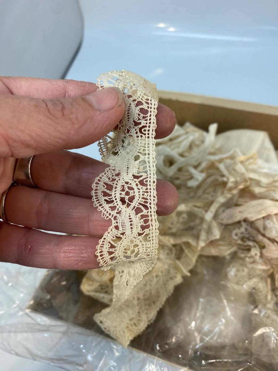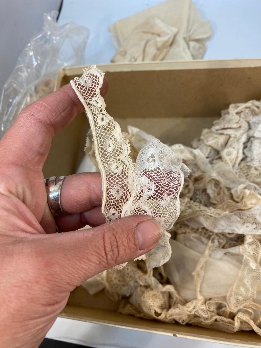 Vintage Antique Small Box & Bags of Ecru Off-White Lace Trim Remnants & Pieces. Different styles and patterns. Various lengths. See photos for better idea of styles included.