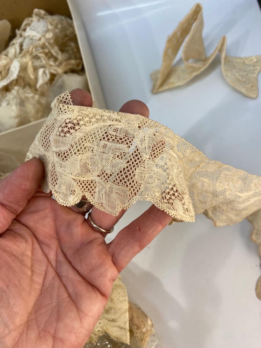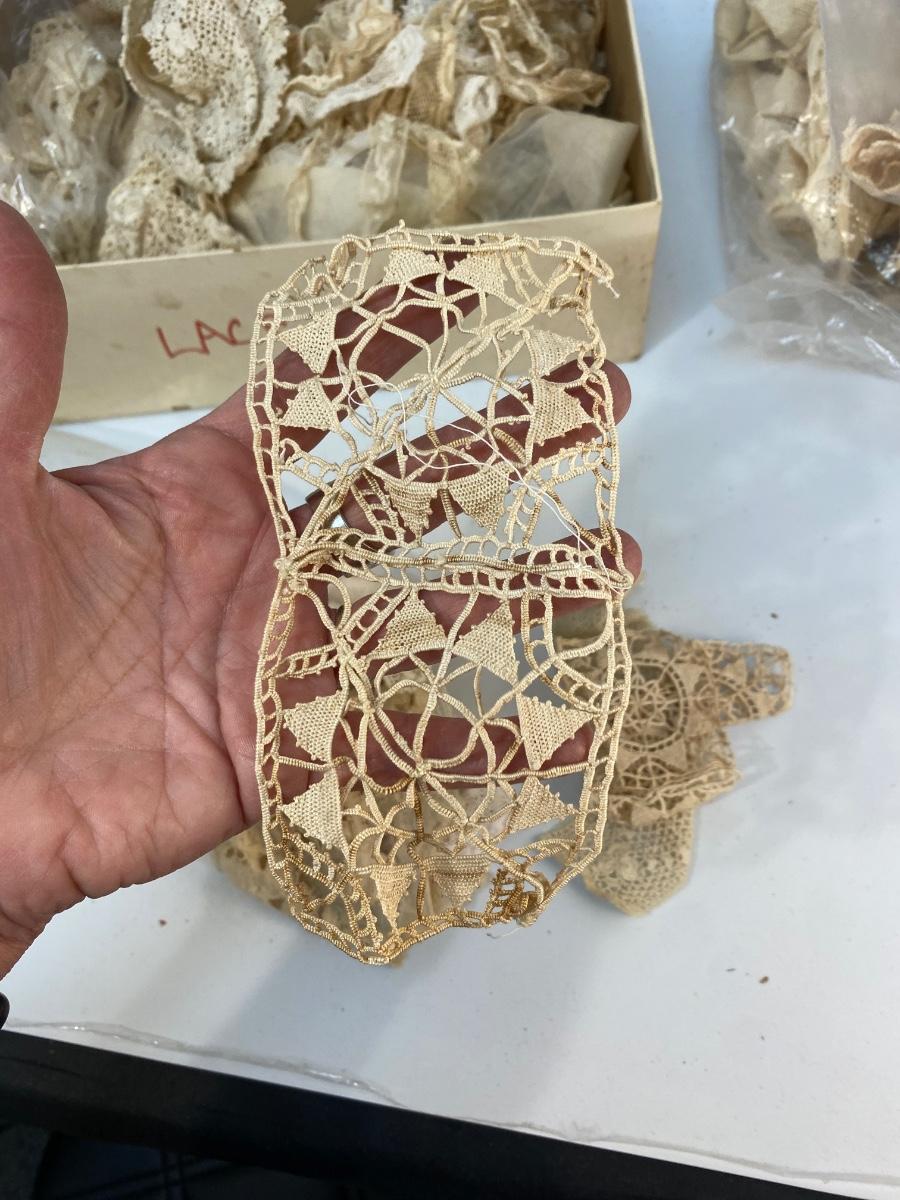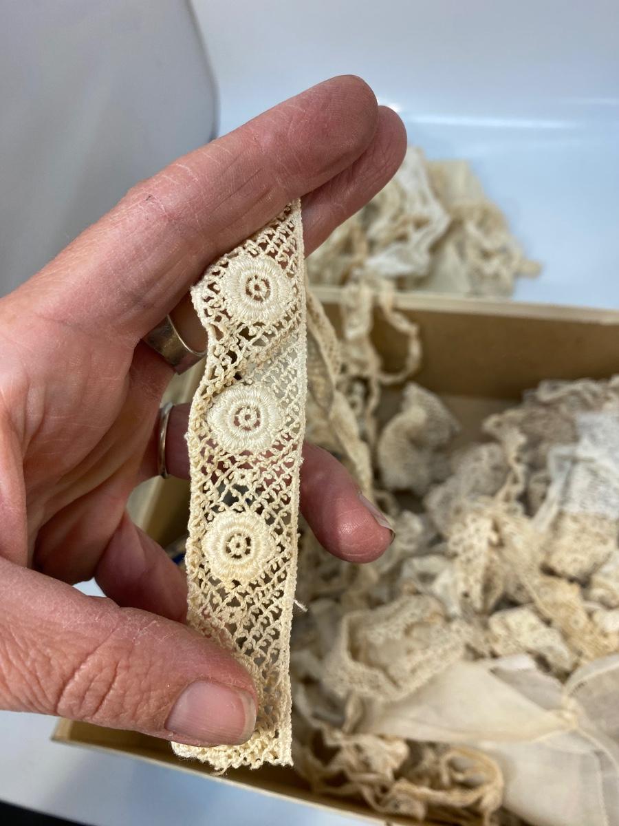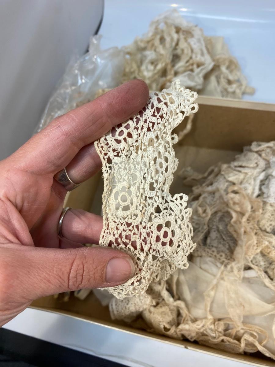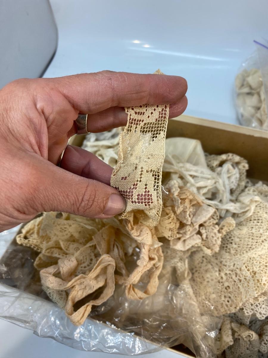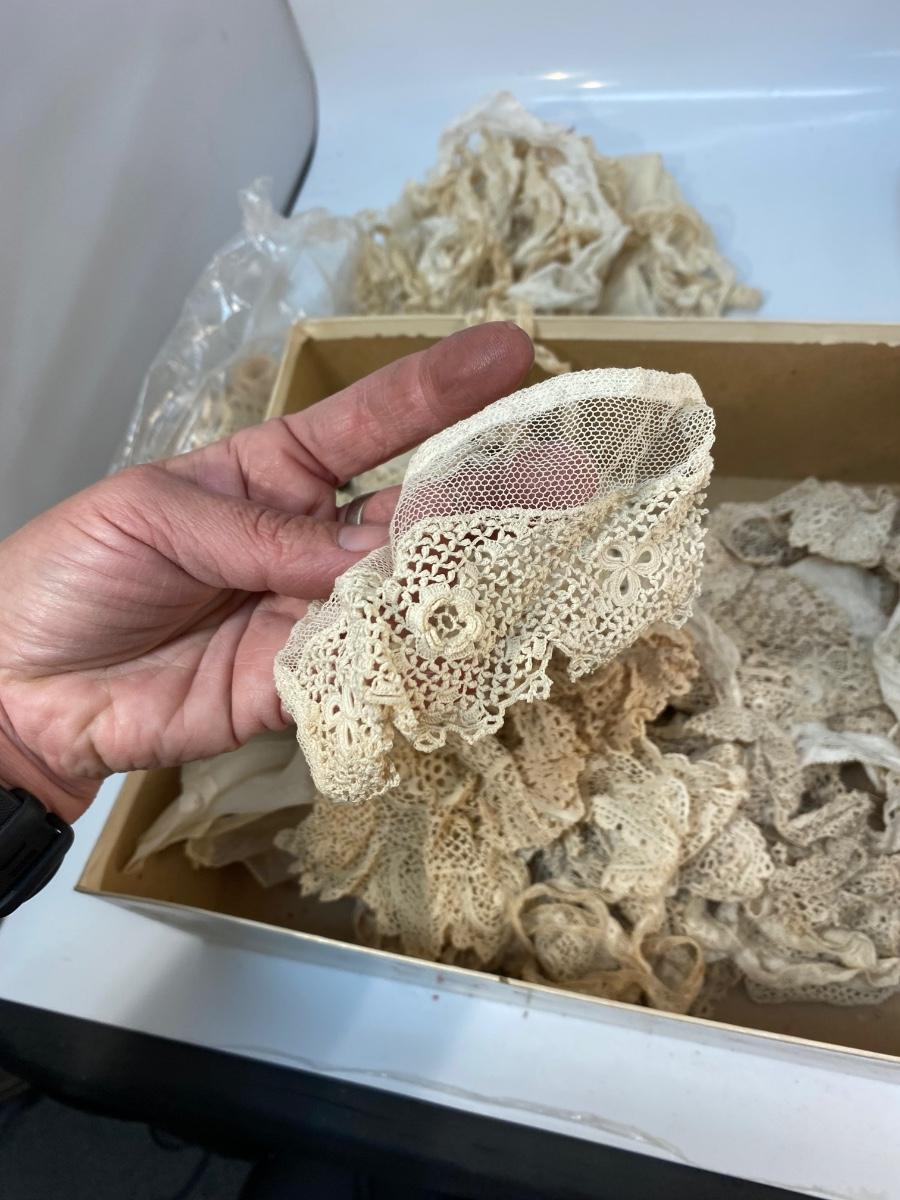Vintage Antique Small Box & Bags of Ecru Off-White Lace Trim Remnants & Pieces. Different styles and patterns. Various lengths. See photos for better idea of styles included.