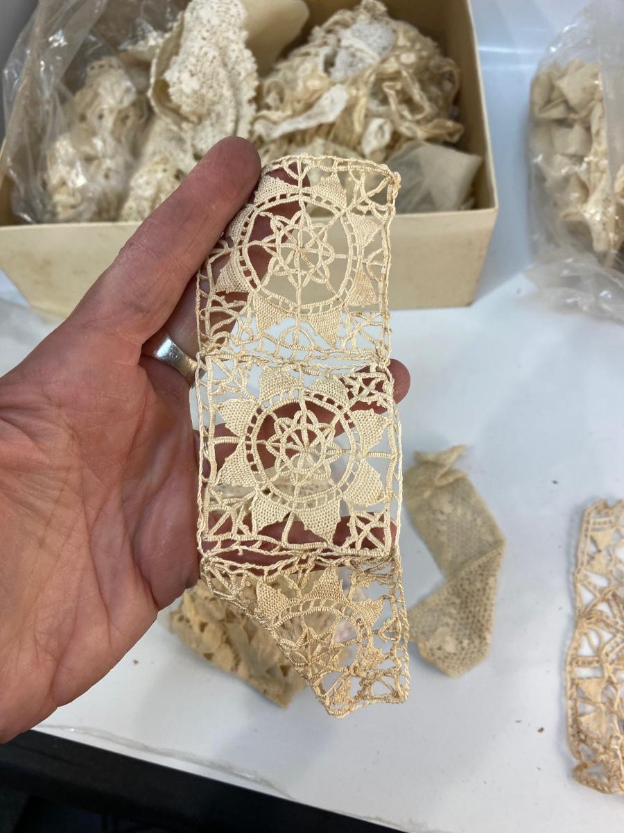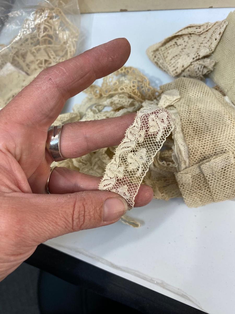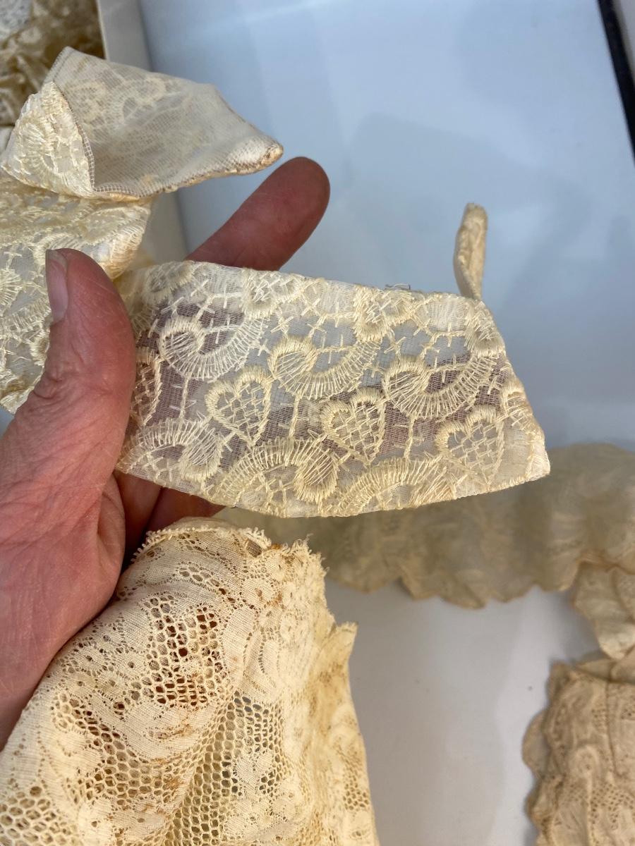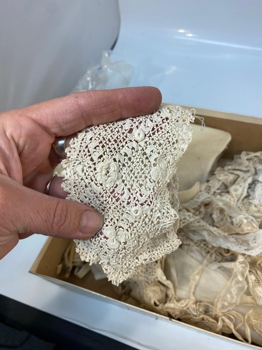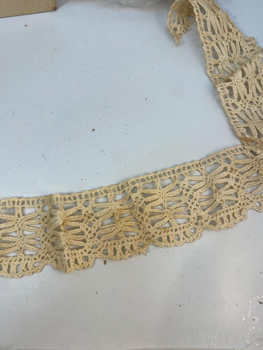 Vintage Antique Small Box & Bags of Ecru Off-White Lace Trim Remnants & Pieces. Different styles and patterns. Various lengths. See photos for better idea of styles included.