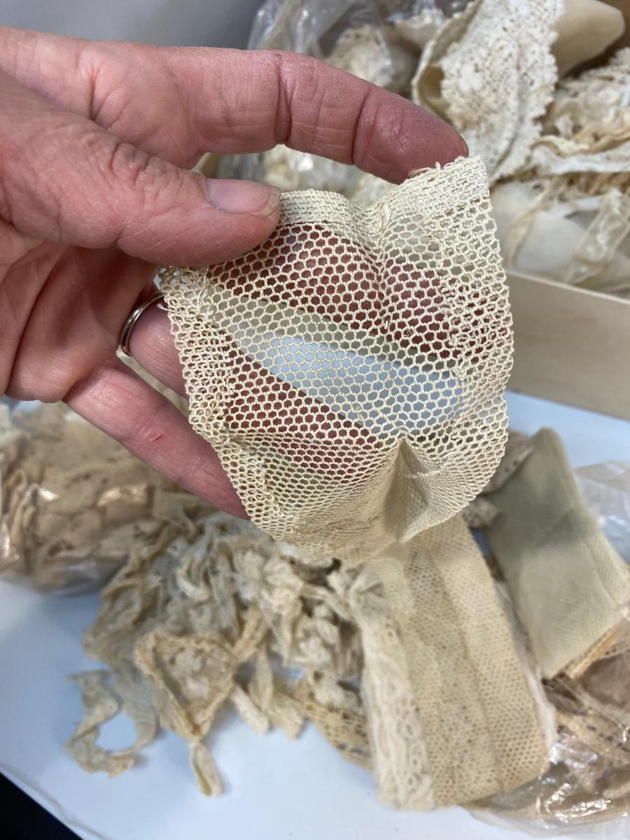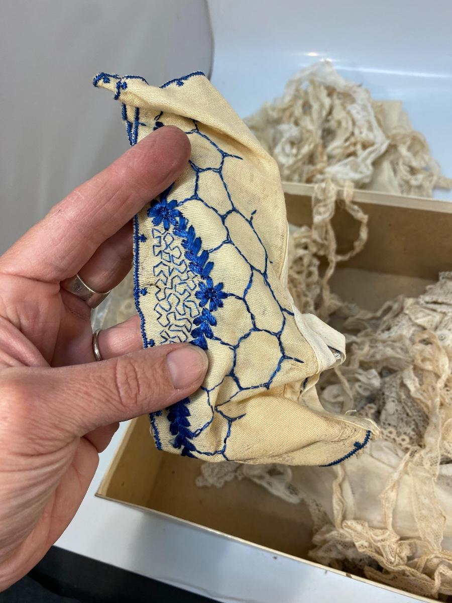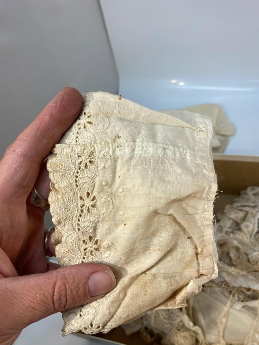 Vintage Antique Small Box & Bags of Ecru Off-White Lace Trim Remnants & Pieces