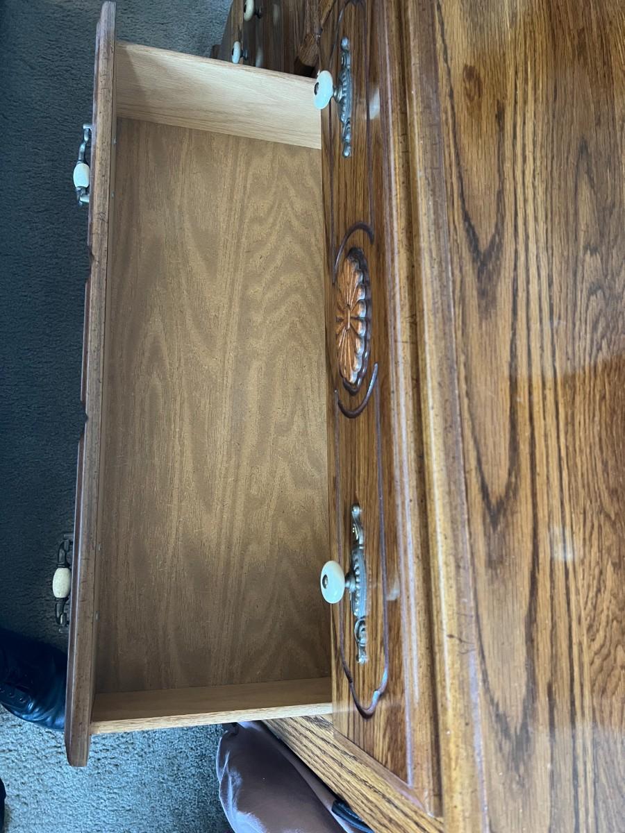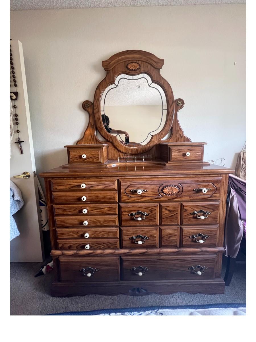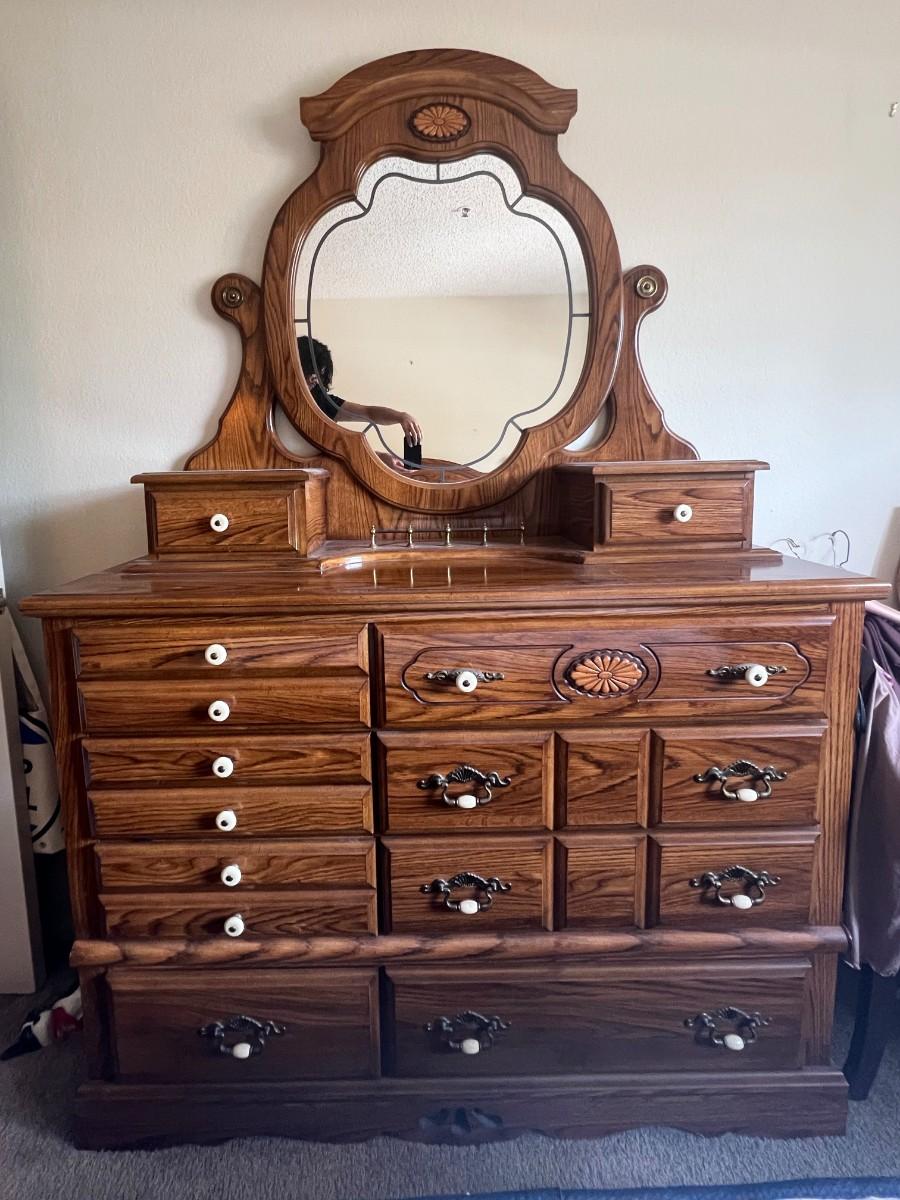 Vintage 8 Drawer Dresser with Two Drawer Mirrored Hutch. In good condition. Over 6' total height, hutch does come off dresser. **Off site in Brea, owner downsizing. Pick up will be as early as July 30th at 2pm, must be scheduled before the 29th.**