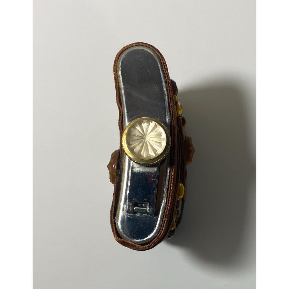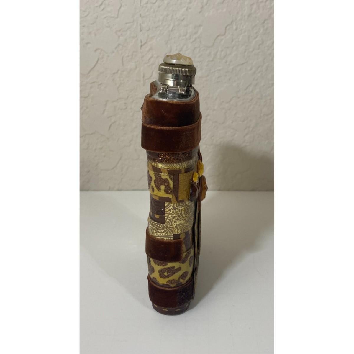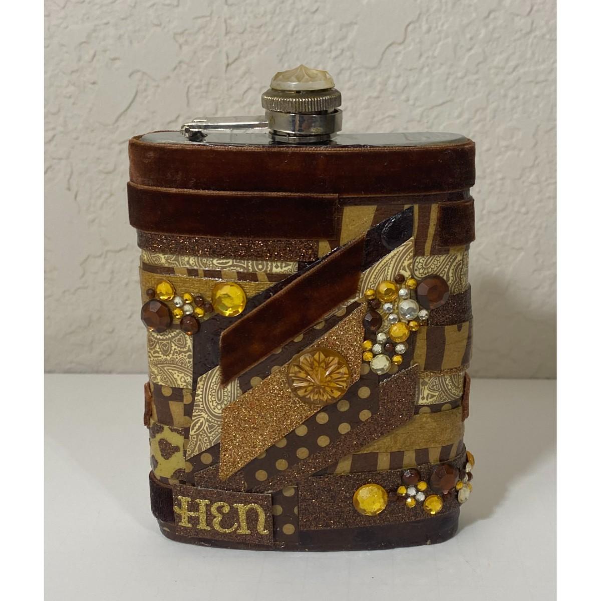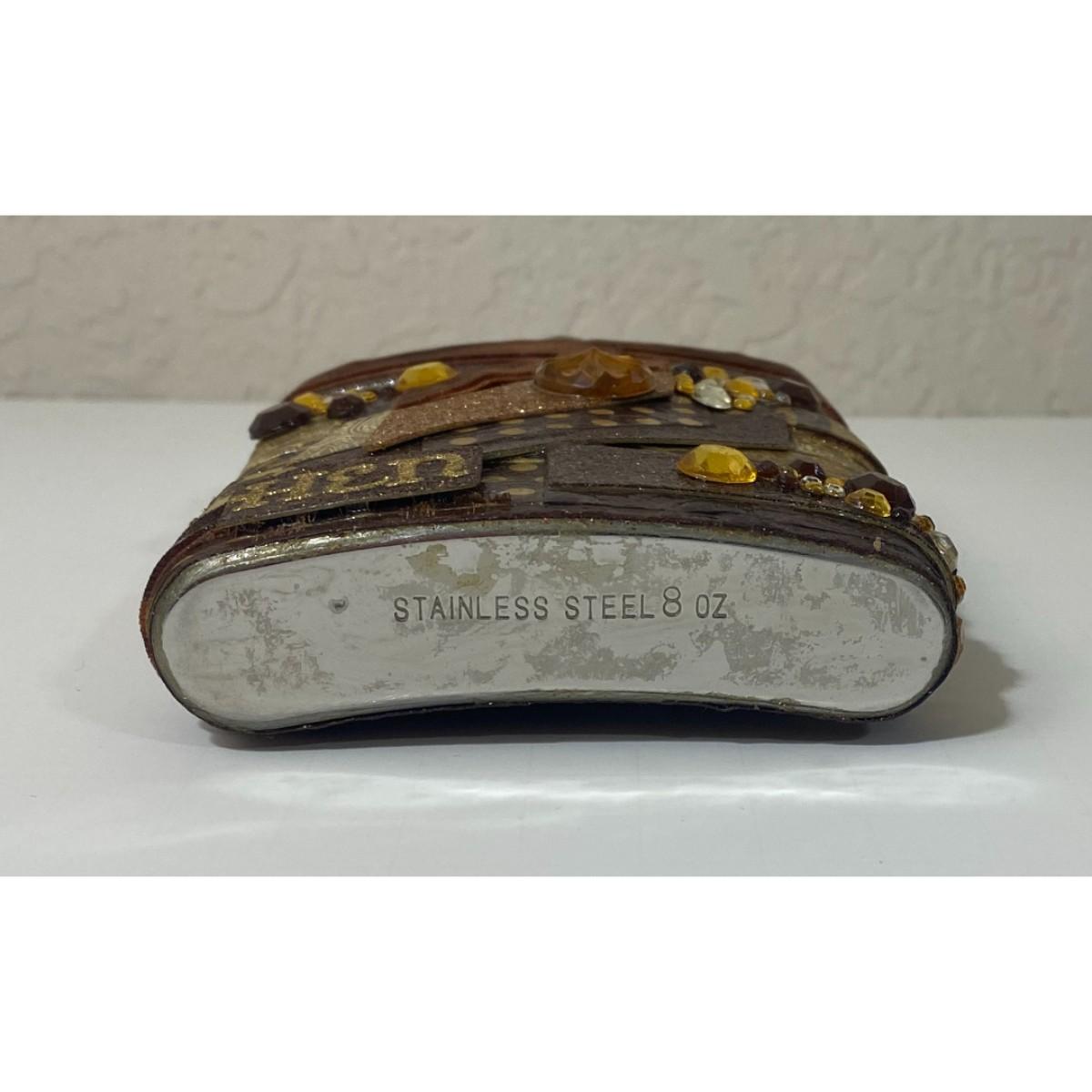 Vintage 8 oz. Stainless Steel Flask With Velour & Plastic Jewels Brown Amber