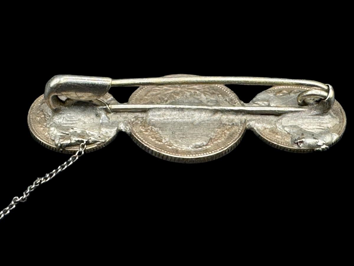[9.20g] This piece features three coins, mounted on a pin. The pin appears to have been replaced, and the piece may or may not be complete. The weight is overall. Silver content confirmed using Niton XRF precious metals analyzer. Measurement: 1 7/8”L. [BK]
