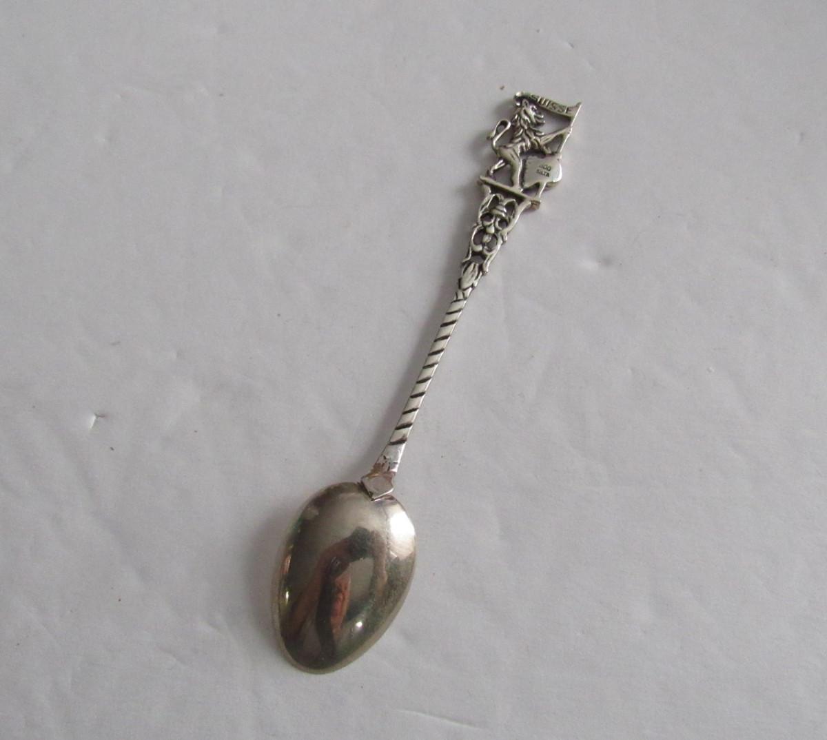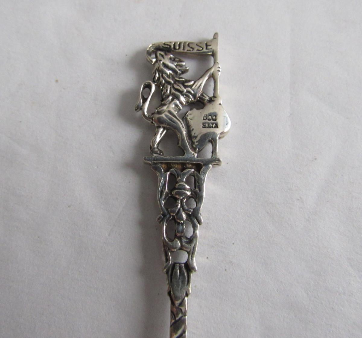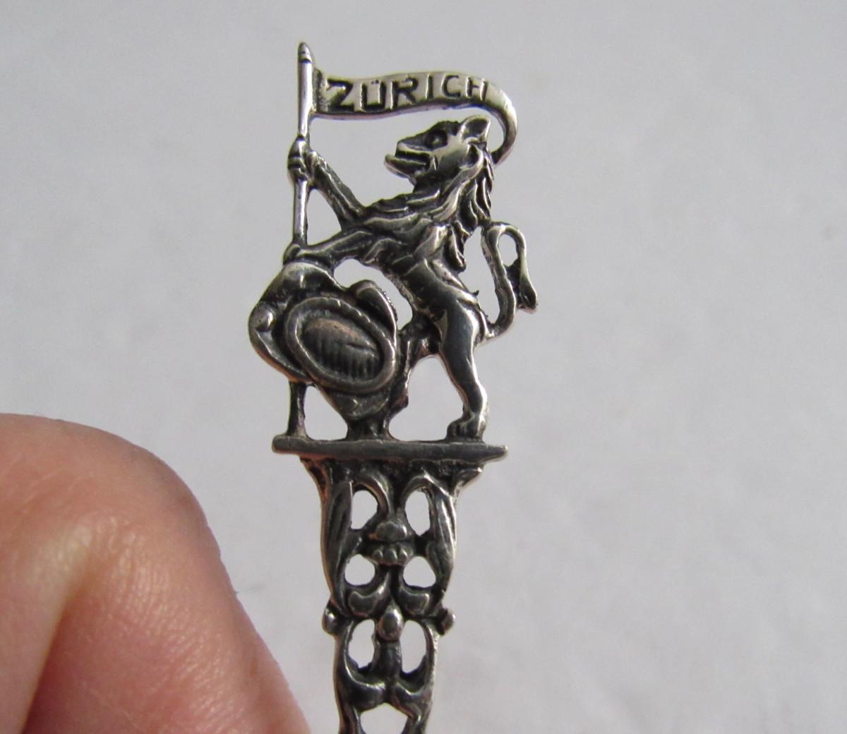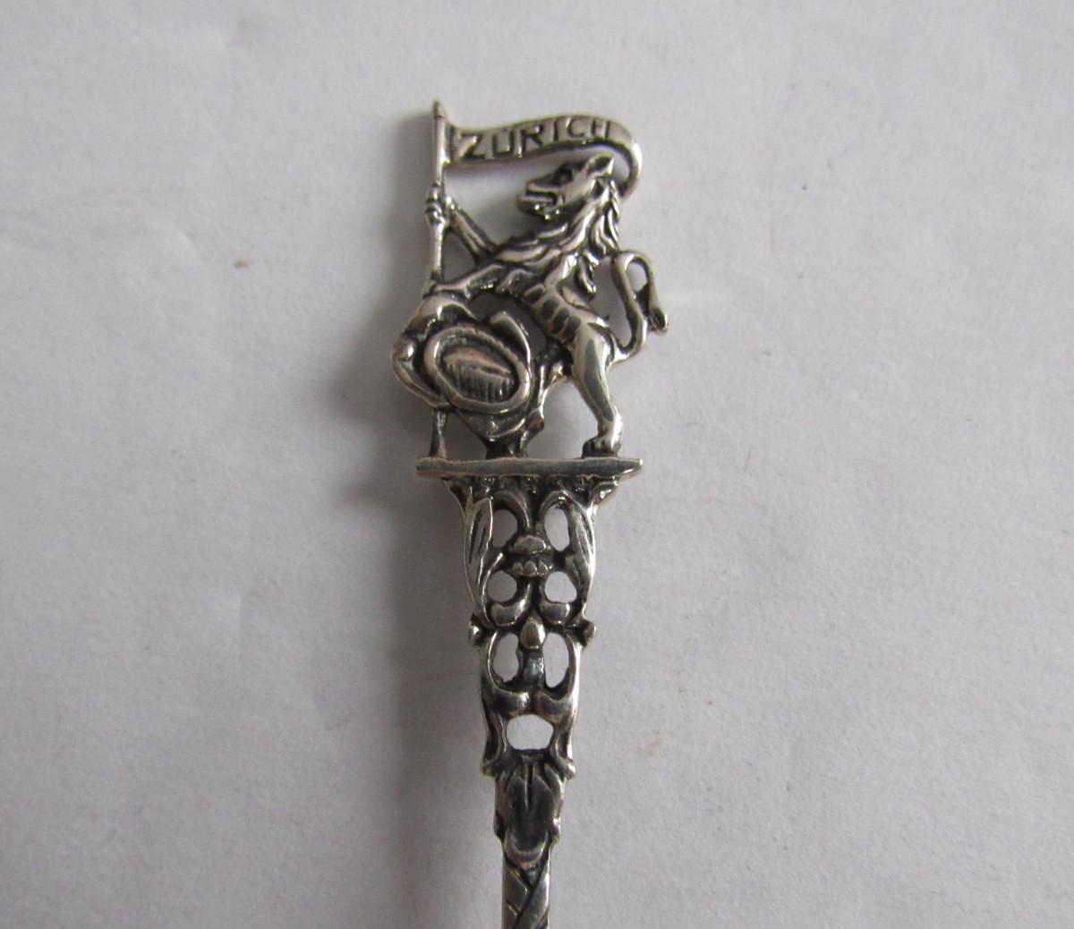 Vintage 800 silver spoon with a Lion ? and Zurich on the handle. It is small, 4" or so long, narrow. It is marked 800 and Silta on the back of the handle. It is nice quality and is in very nice shape with very little use wear. Shipping is available at actual shipping cost plus $5.00 handling fee per box for supplies/labor. See our terms for details. All sales are final. Condition notes may not be all inclusive, we may miss some issues as most vintage items are not in mint condition and have some degree of wear, paint loss, etc, but we always try to note obvious damage.