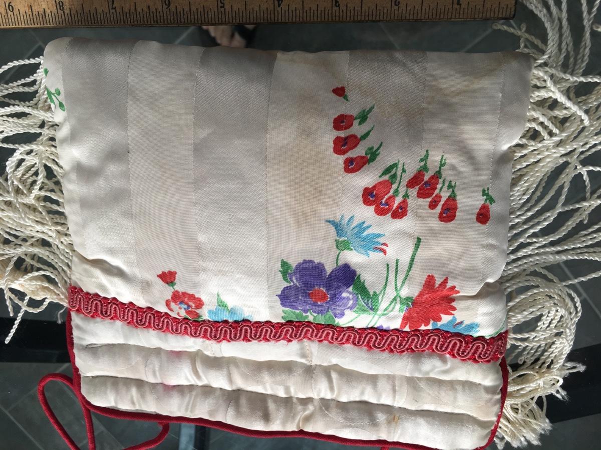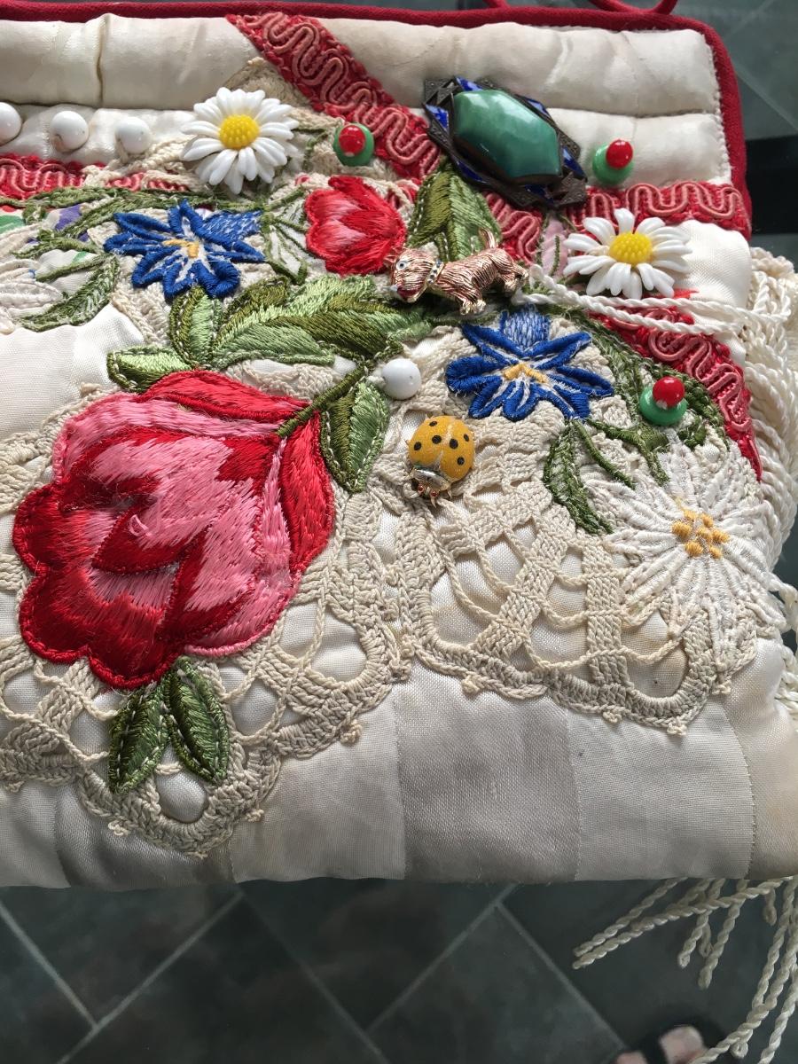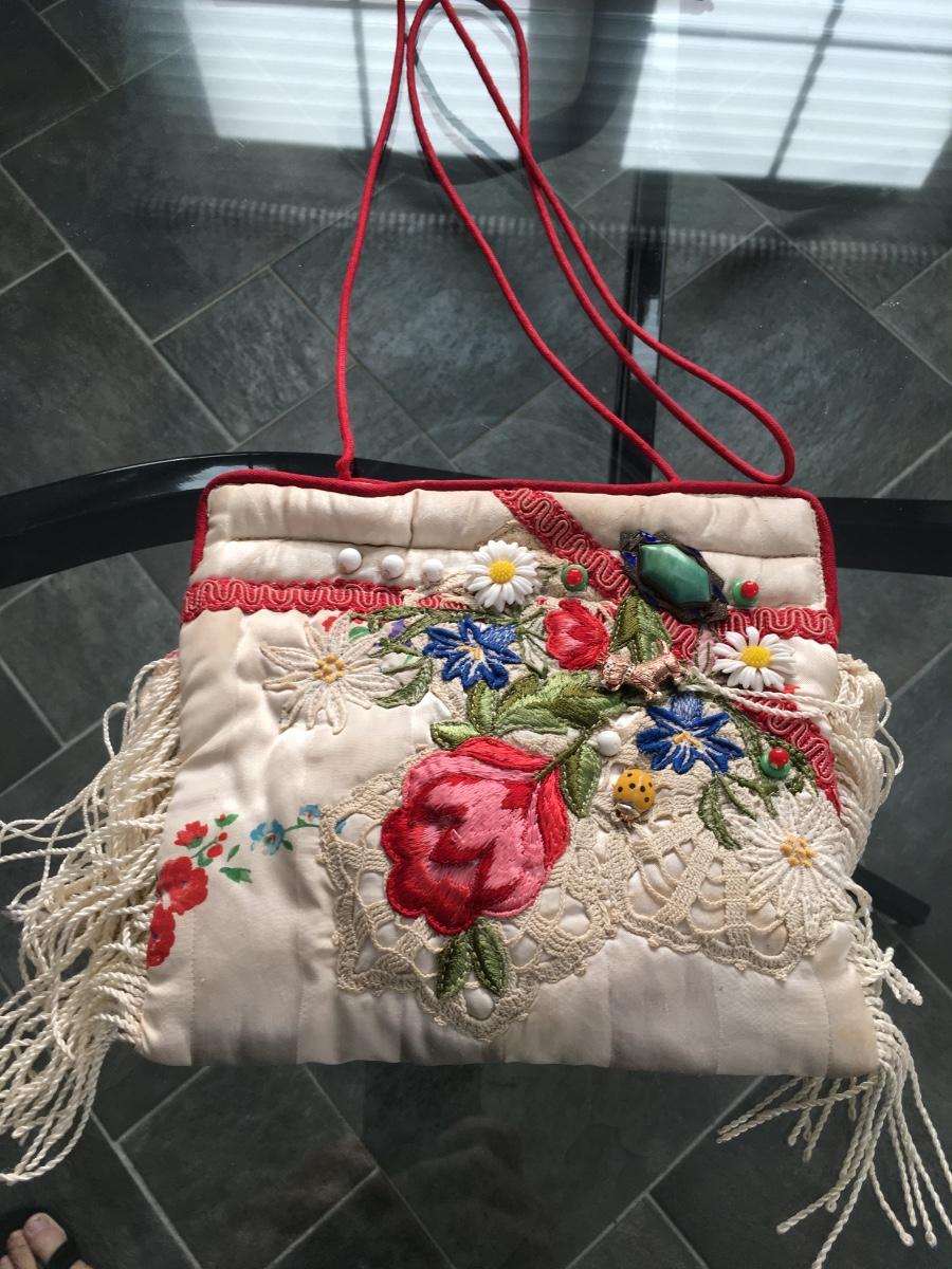 FUn clother purse with jewelry and lace accents. Some signs of wear.