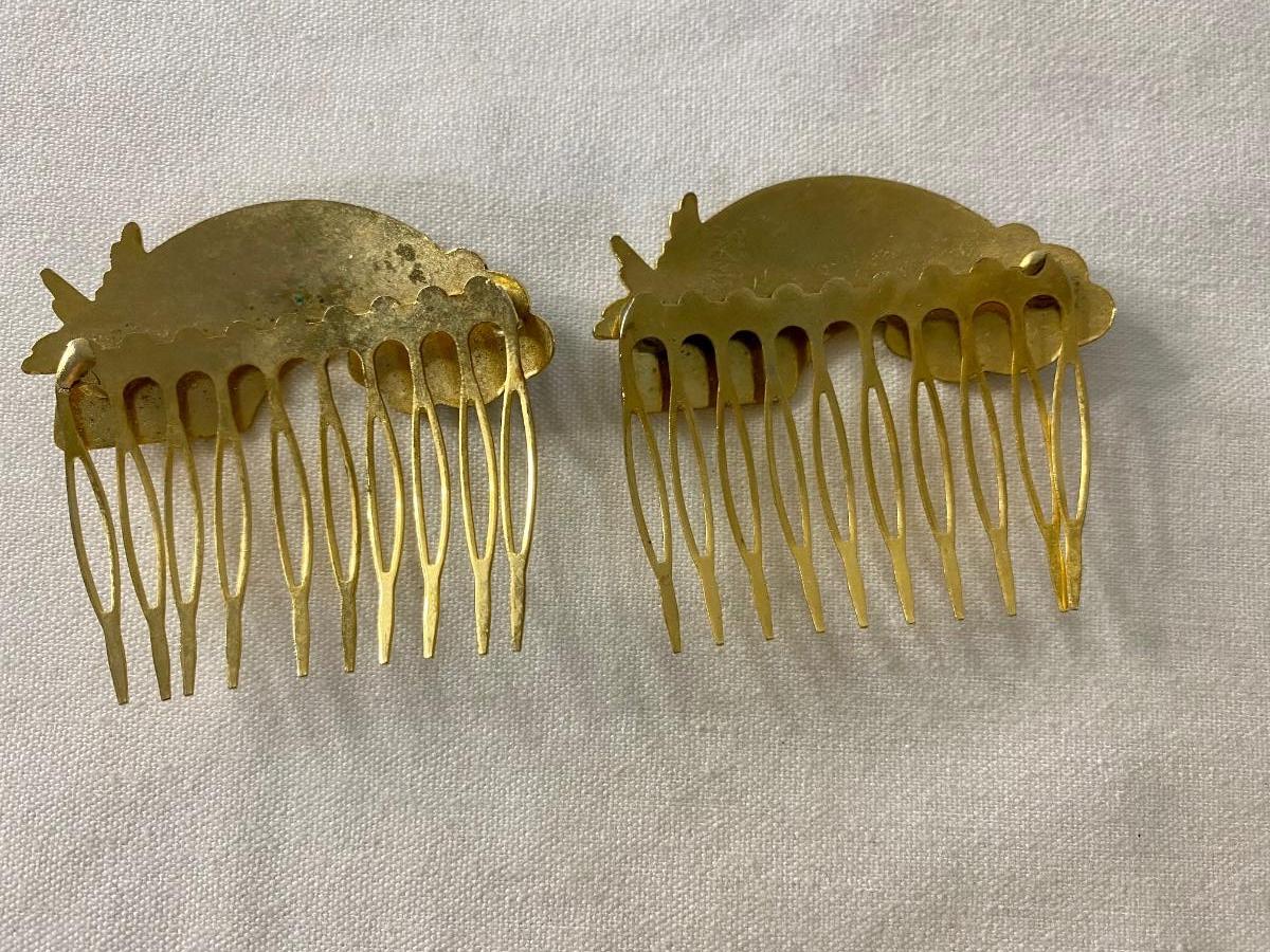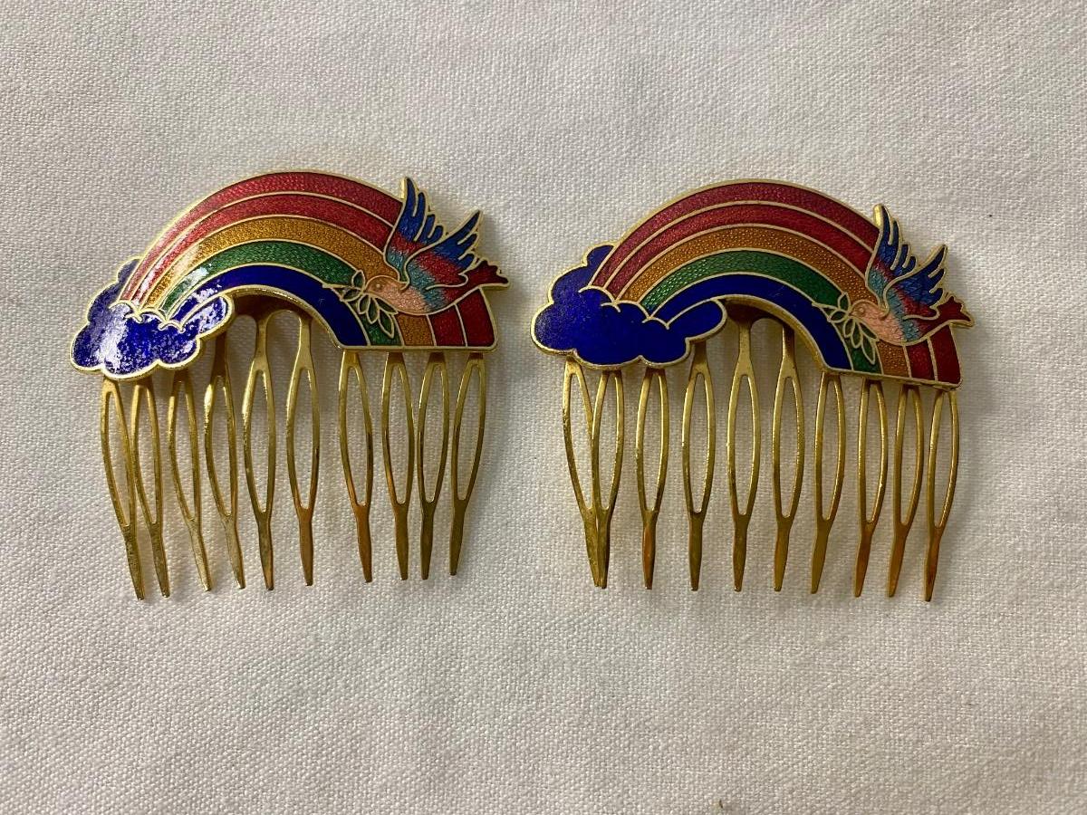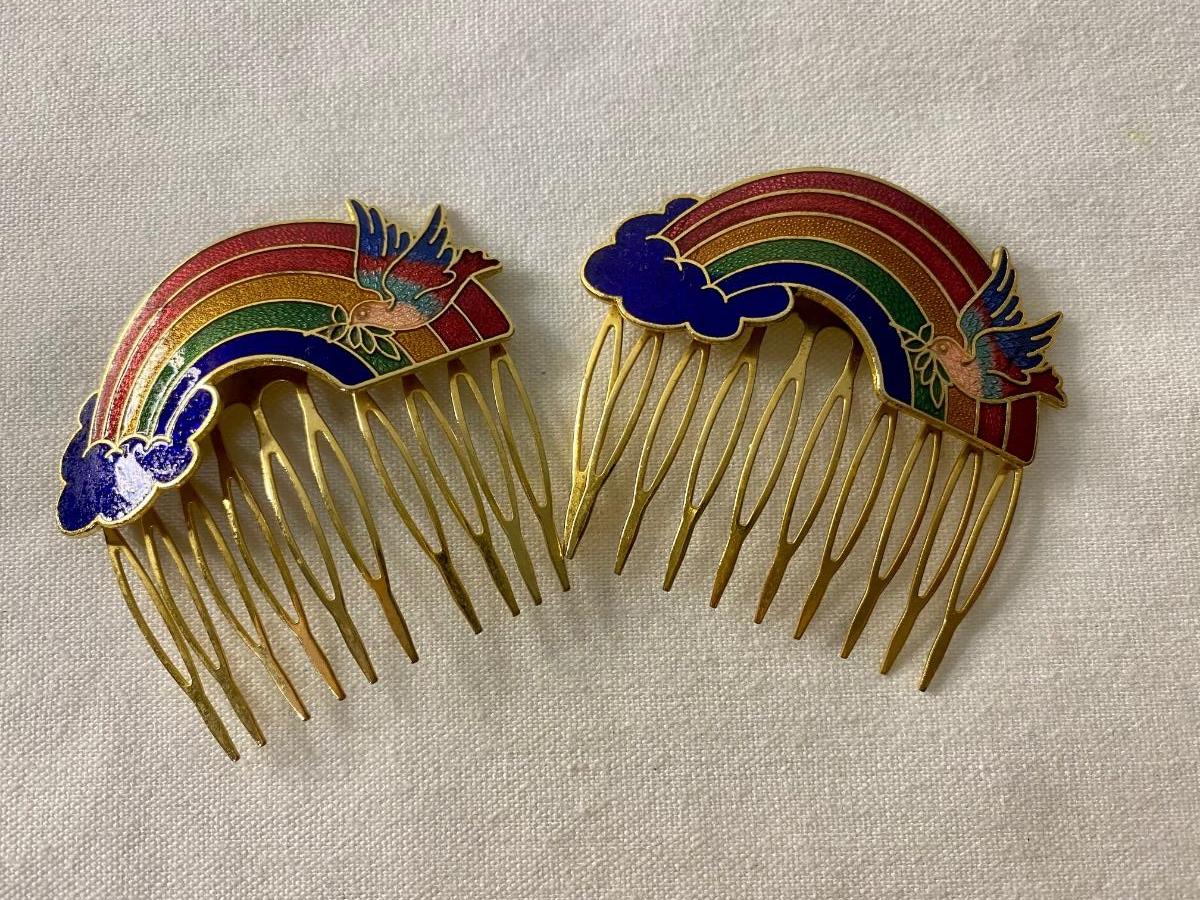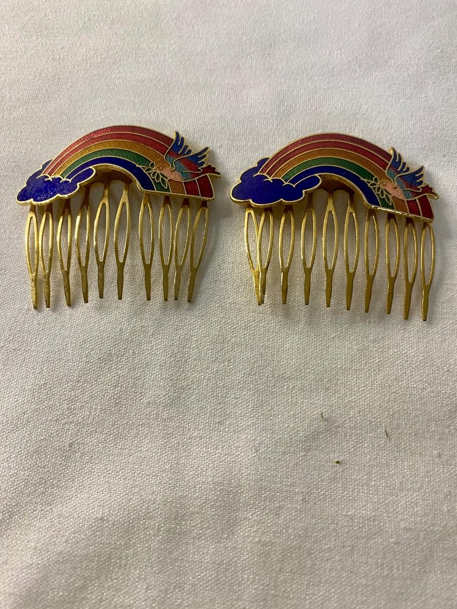 Set of 2 vintage Cloisonné Hair Combs with rainbow and dove. 2’X2’