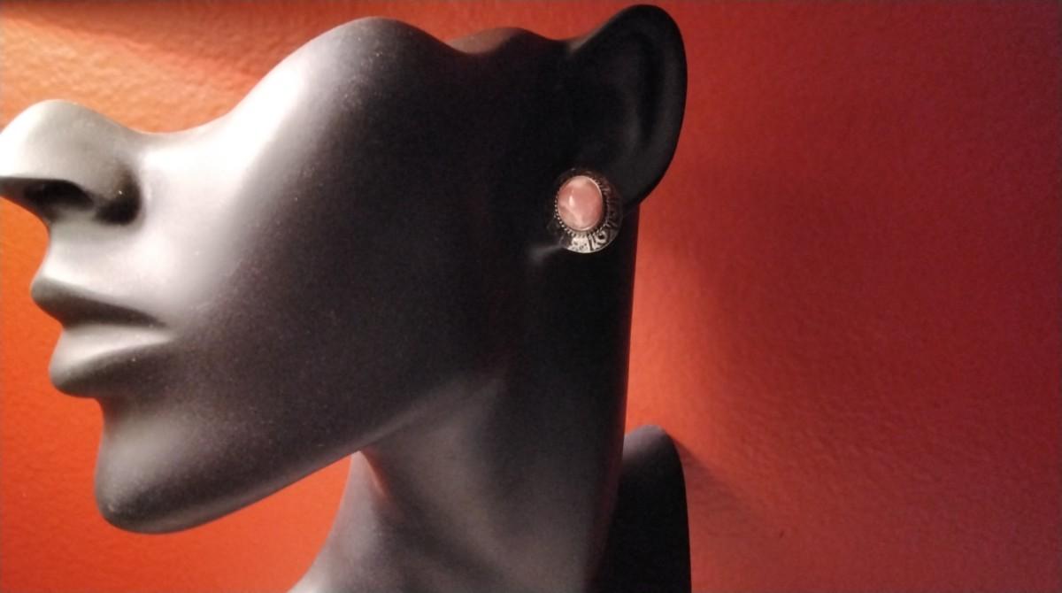Beautiful vintage earrings with intricate scrollwork surrounding the rhodochrosite.