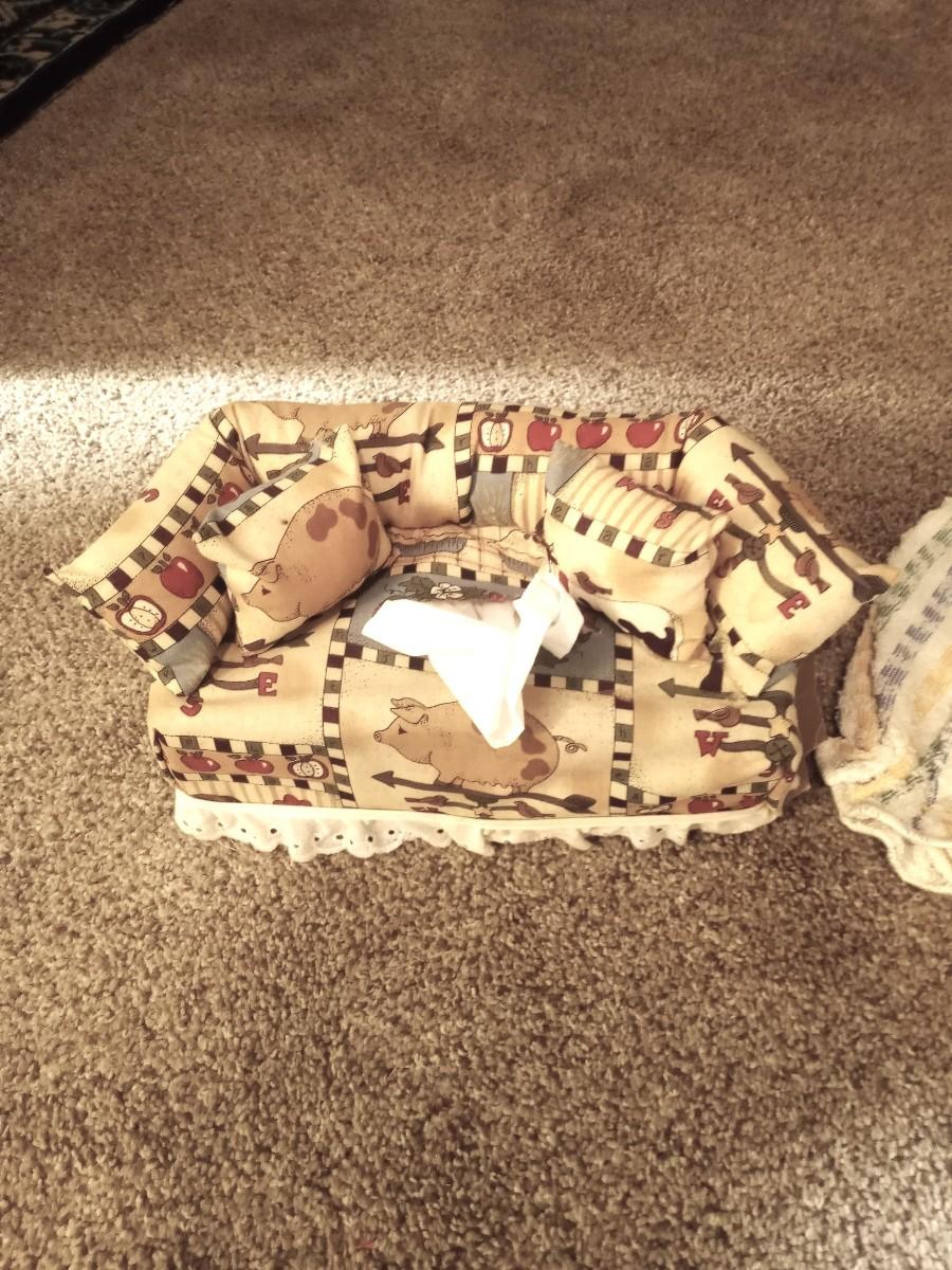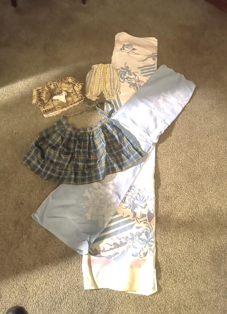 VINTAGE TABLECLOTH FROM "BROWN PALACE" - HAND MADE APRON AND PANTS HAND TOWEL COUCH-KLEENEX BOX COVER