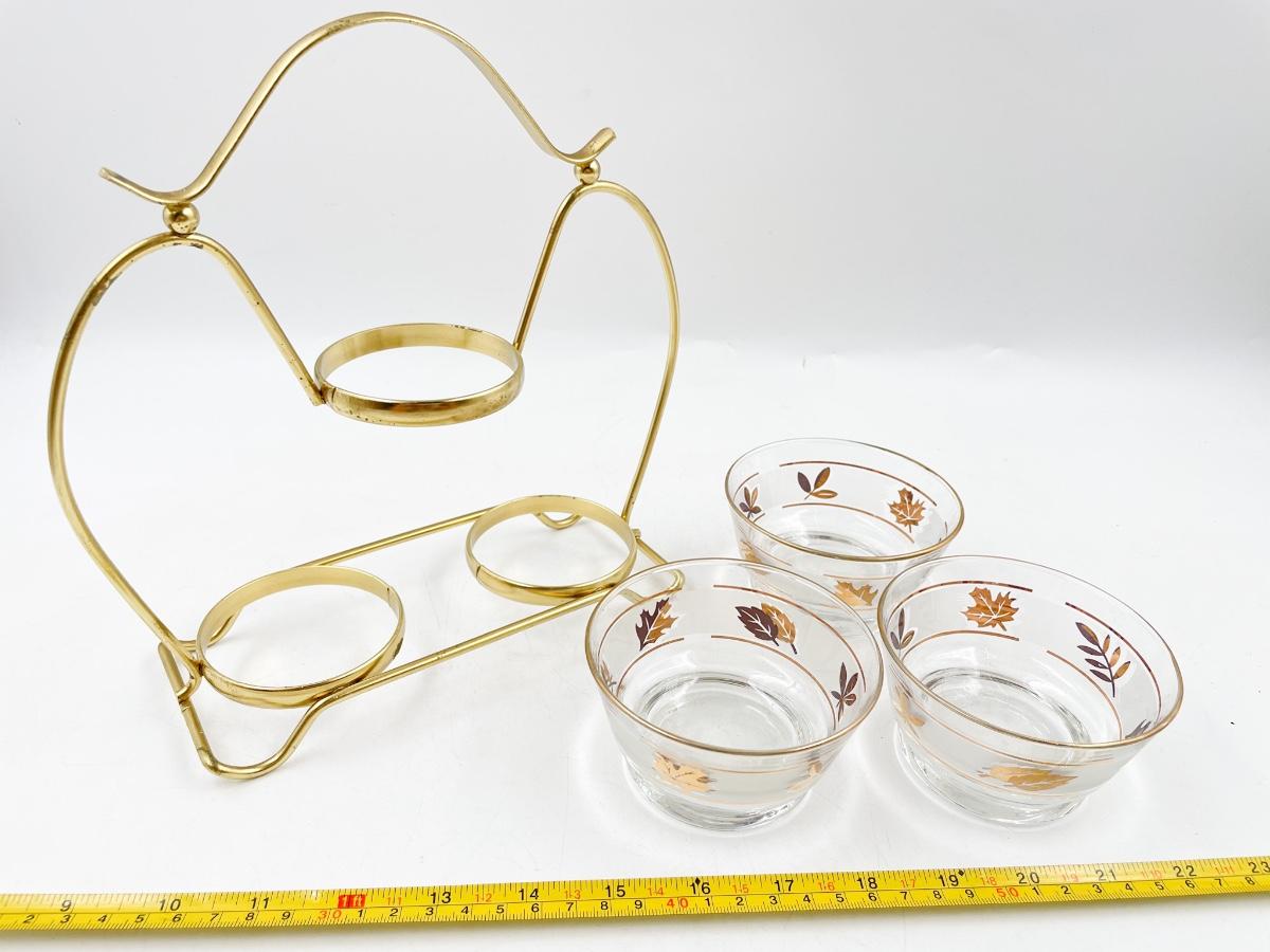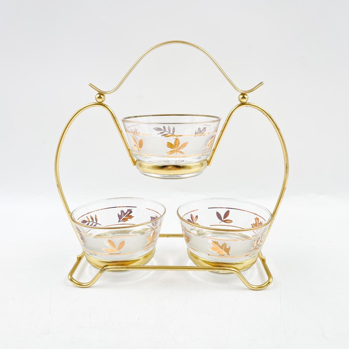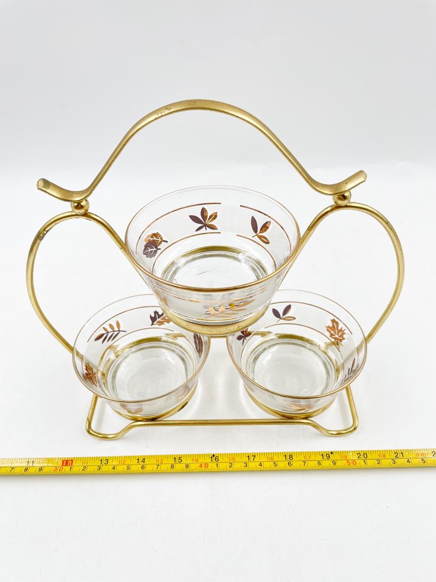 VINTAGE 9” X 9” LIBBEY GOLD LEAF CONDIMENT BOWL SET W/ CADDY