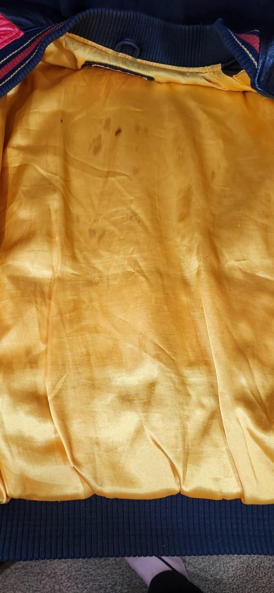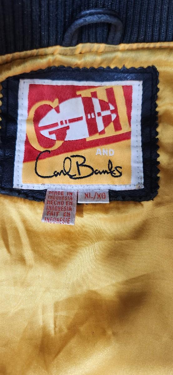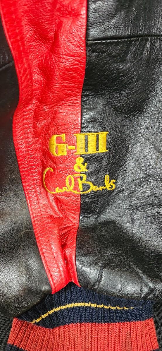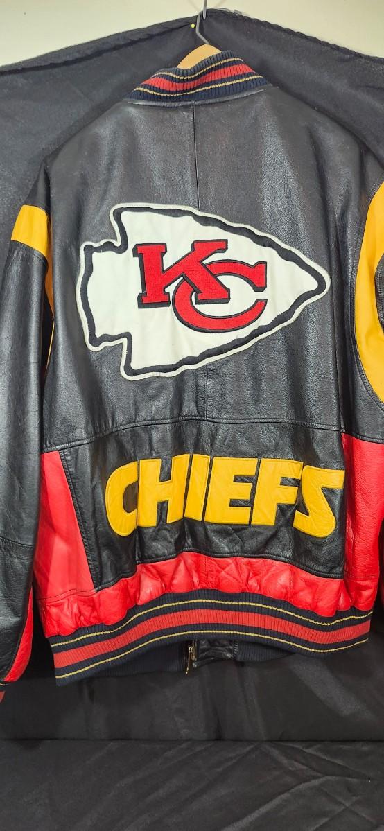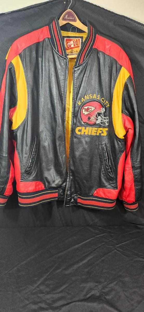 Vintage leather Kansas City Chiefs Leather jacket. Black with red and yellow trim in a classic early 90s fashion. This is a higher quality jacket that was collaboration with Carl Banks. This is a G III.The jacket is pre-owned with no smell or tears. The leather does show signs of ware and the yellow satin lining along with the lite colored leather has some die bleeding from the black leather.