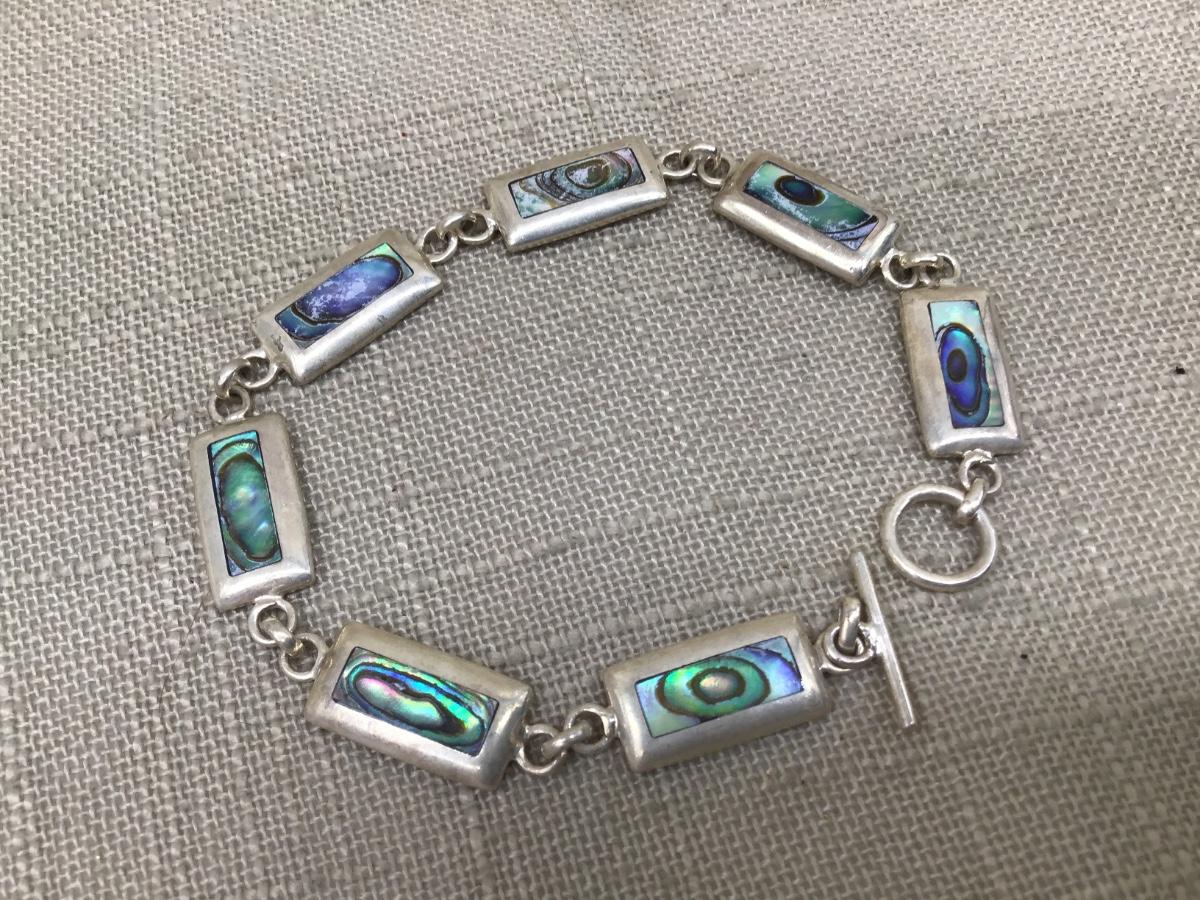 VINTAGE 925 SILVER ABALONE SHELL LINK CHAIN TOGGLE BRACELET