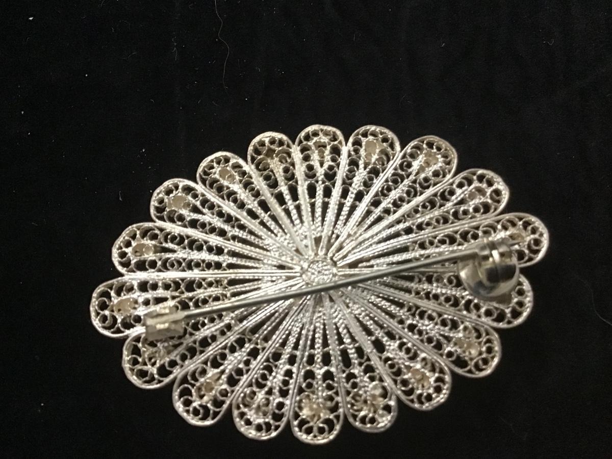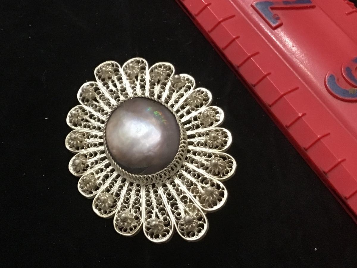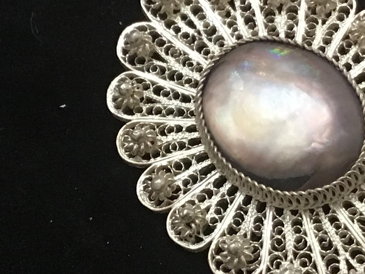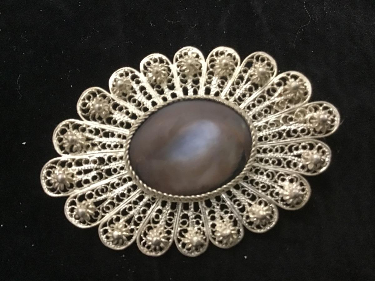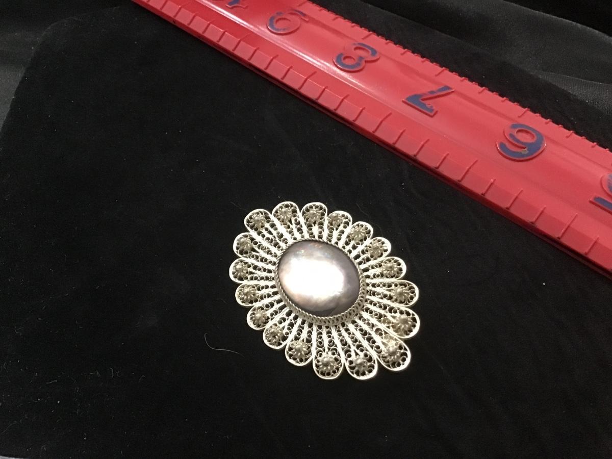 Vintage .925 Sterling Silver Mother Of Pearl Filigree Brooch Pin