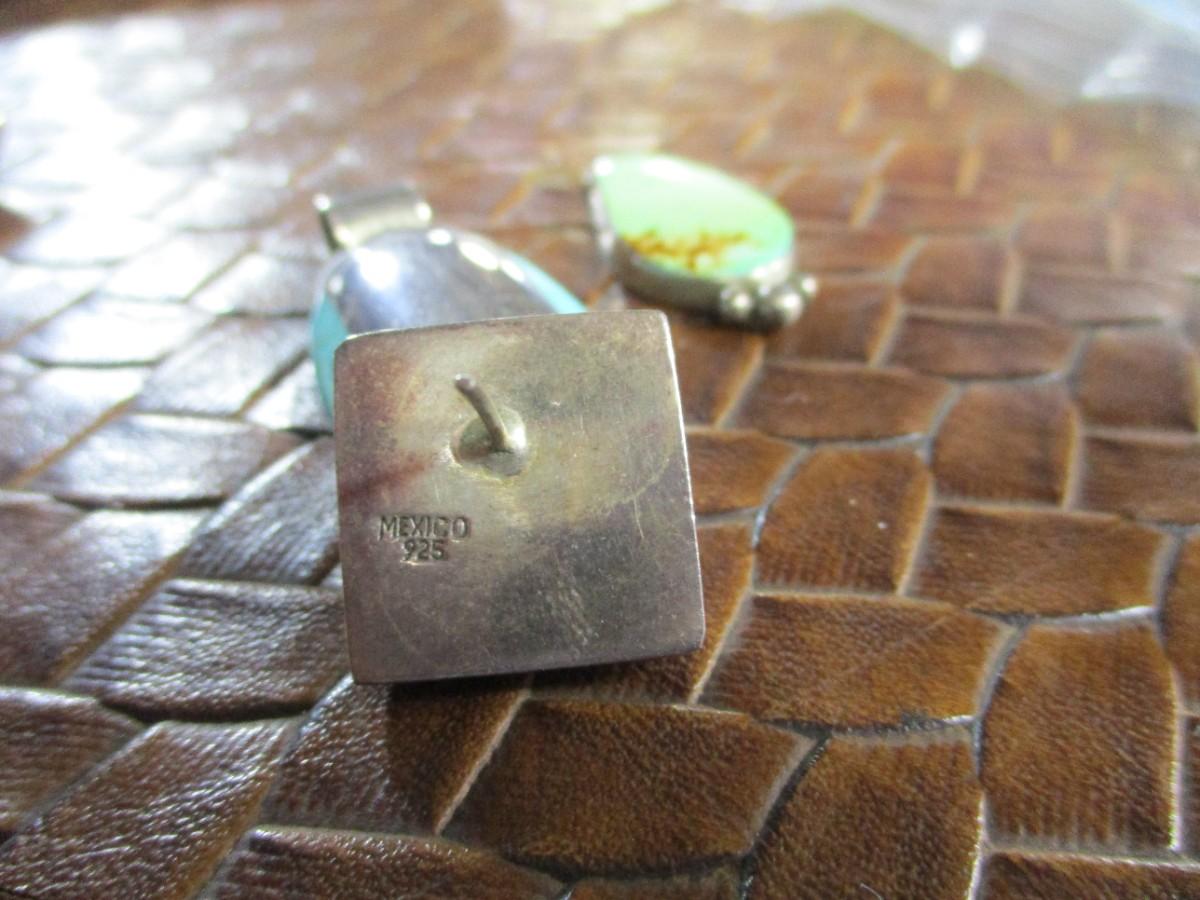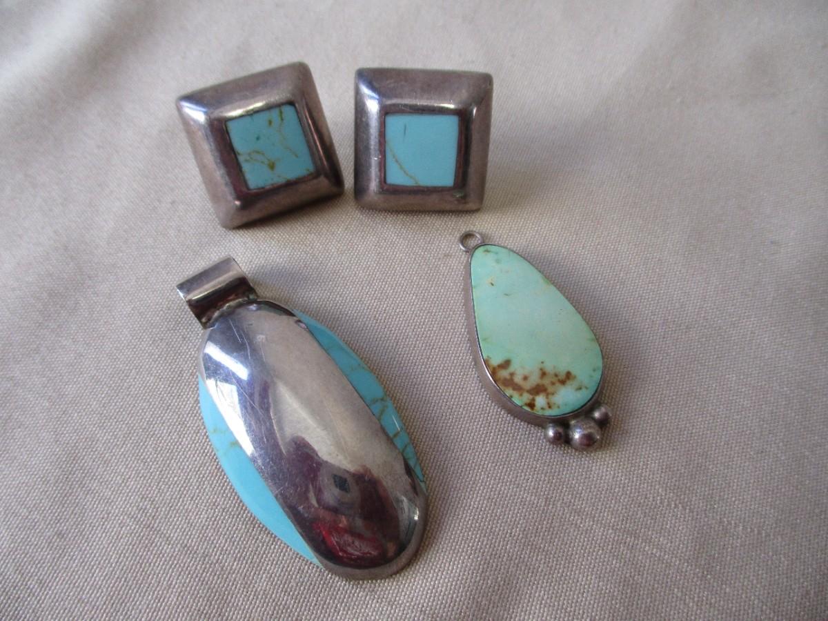 Sterling Silver Post Stud Earrings With Turquoise Stones marked Mexico 925 & two pendants the Smaller pendant is marked HJ Chavez 925 and larger pendent is marked Mexico 925