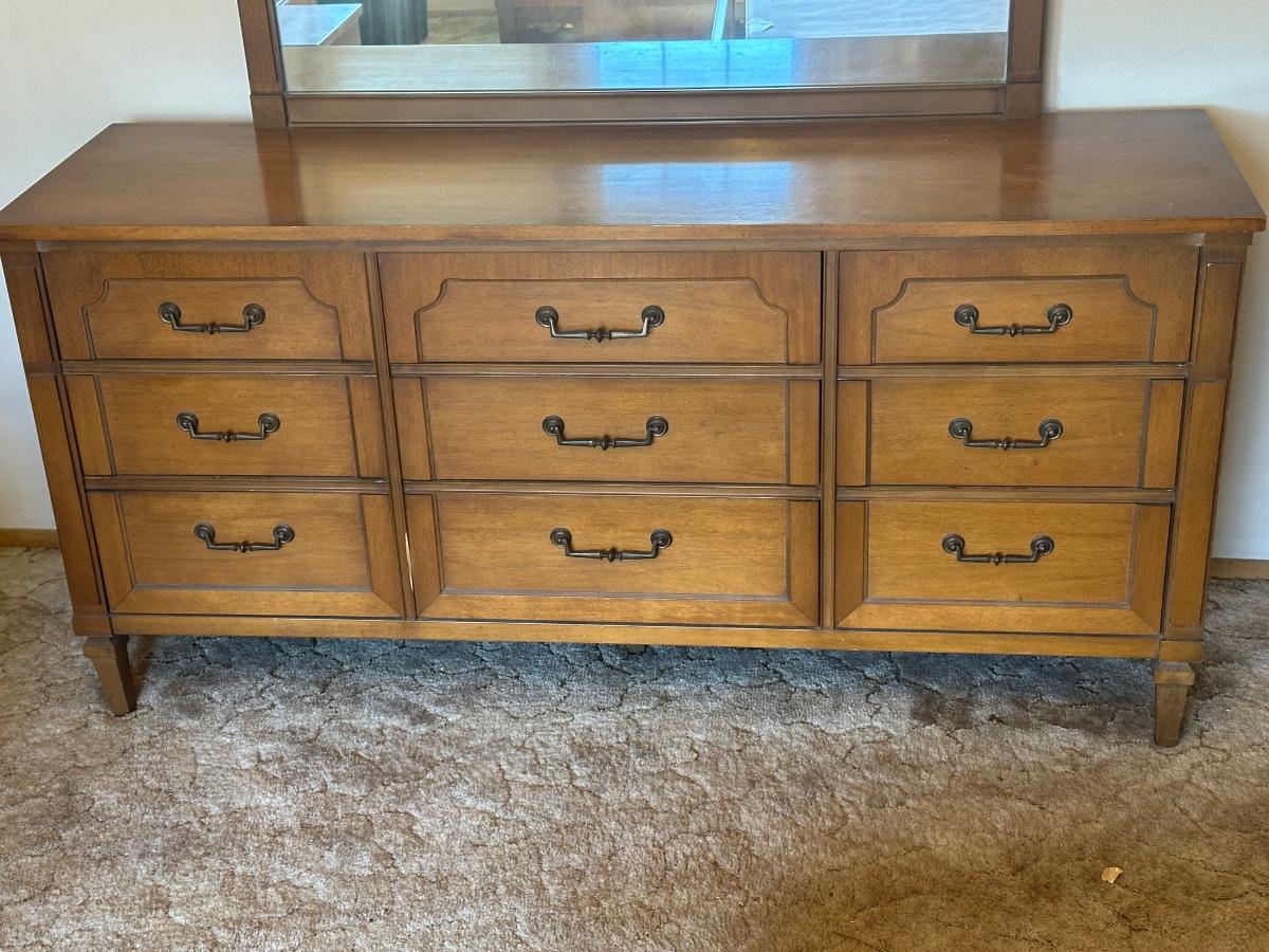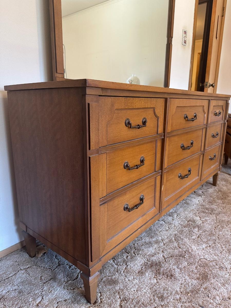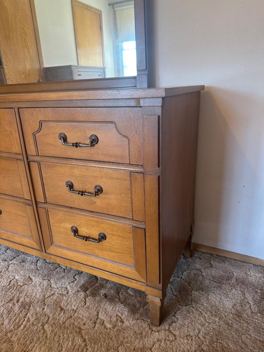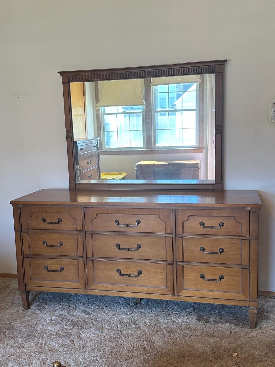 Vintage wooden 9-drawer dresser with an attached framed mirror. Dovetail drawers. All drawers open smoothly. Mirror is removable. Light surface wear and a few small marks consistent with age and use; overall in good, sturdy condition.
